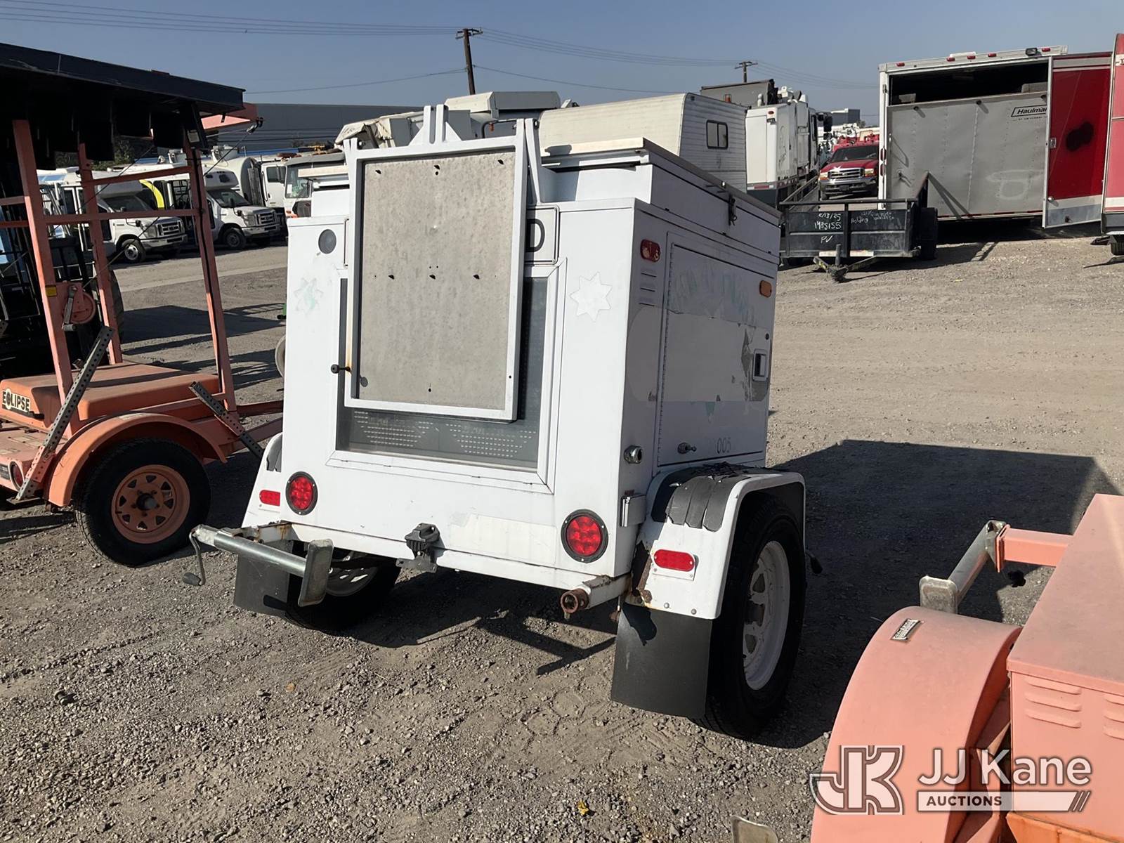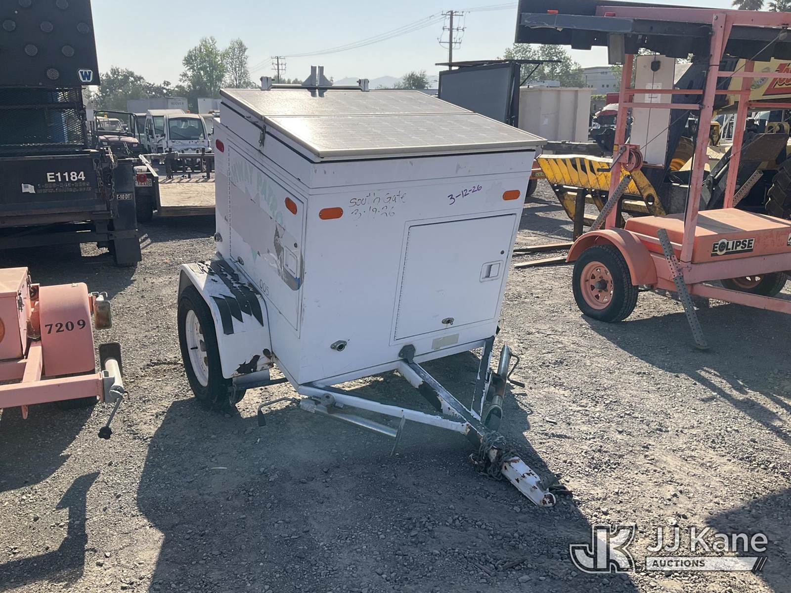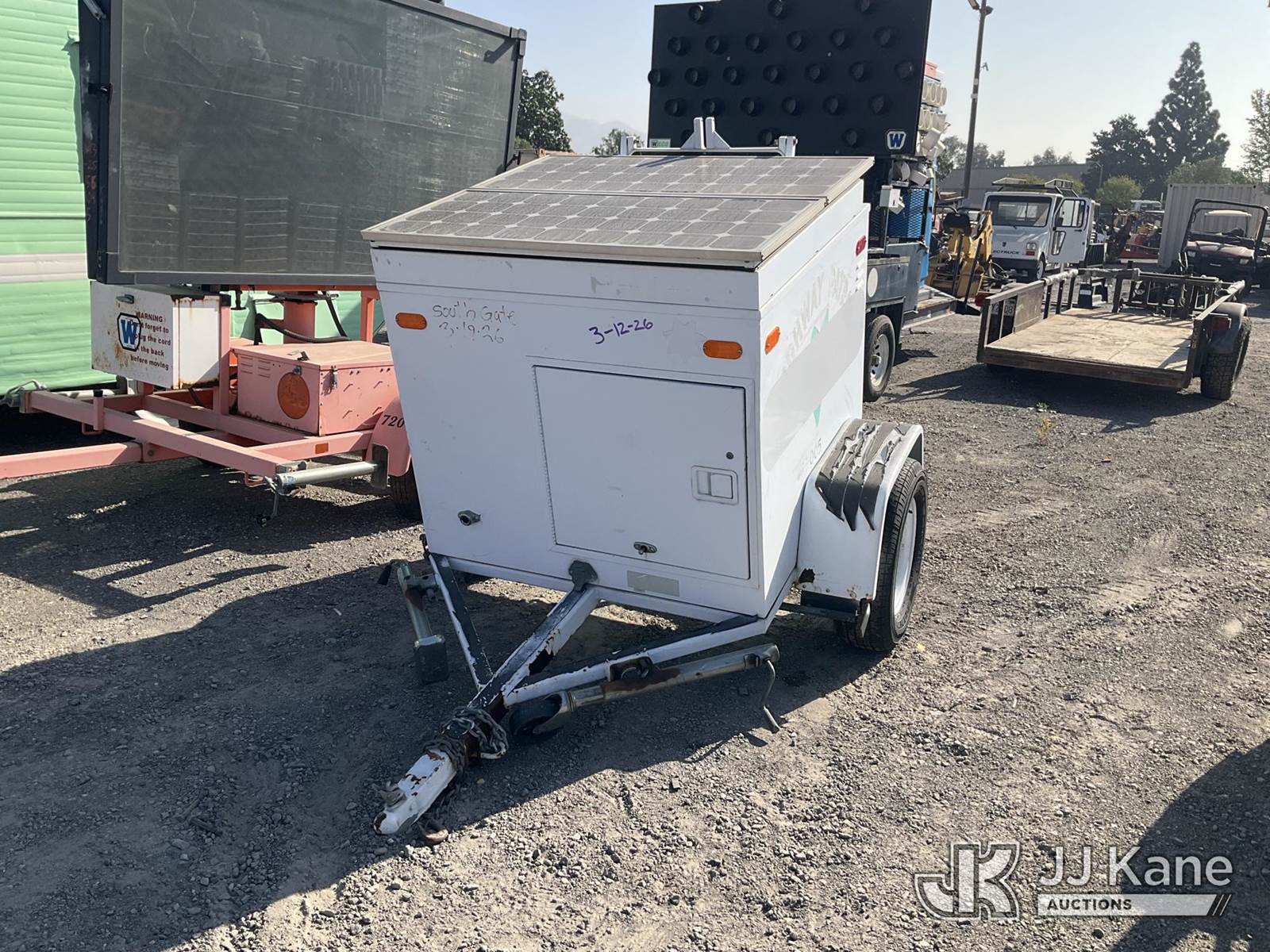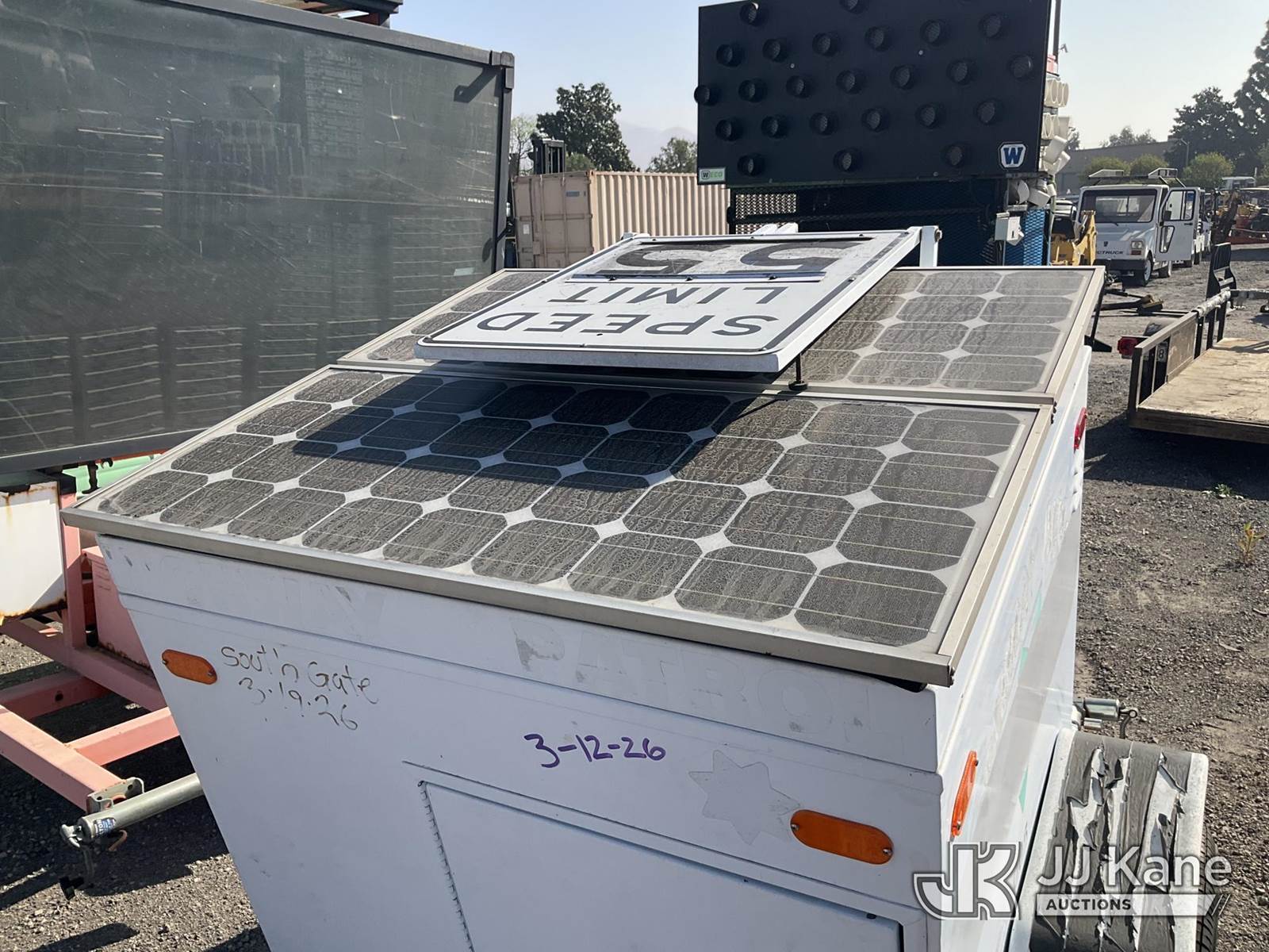 . Portable Solar Speed Detector Board, Solar/Battery Powered, electric, trailer mtd (Not Running, Operation Unknown, VIN Sticker Illegible/Damaged) This is a Titled Item NOTE: This unit is being sold AS IS/WHERE IS via Timed Auction and is located in Jurupa Valley, CA. Inspection & preview days for this unit are the 2 business days prior to the first day of items closing for this auction, item is located at 4510 Muth Way Jurupa Valley, CA 92509 and hours of operations are 8a-4p. For pre-sale questions, please contact please contact Office Staff @ (310) 353-7140. Dealer License Number 45696. (Buyer is responsible for removal. Assistance by consignor or JJ Kane Auctions is not assured.)