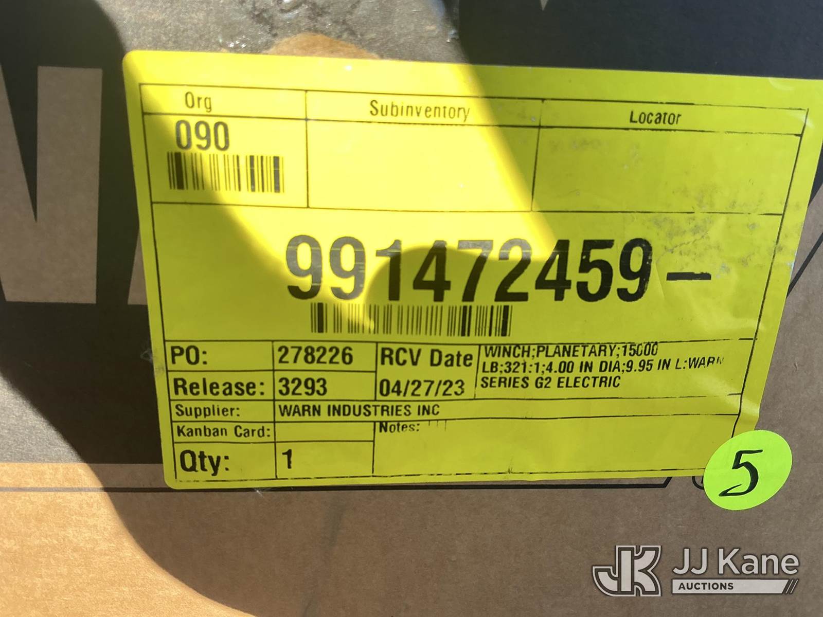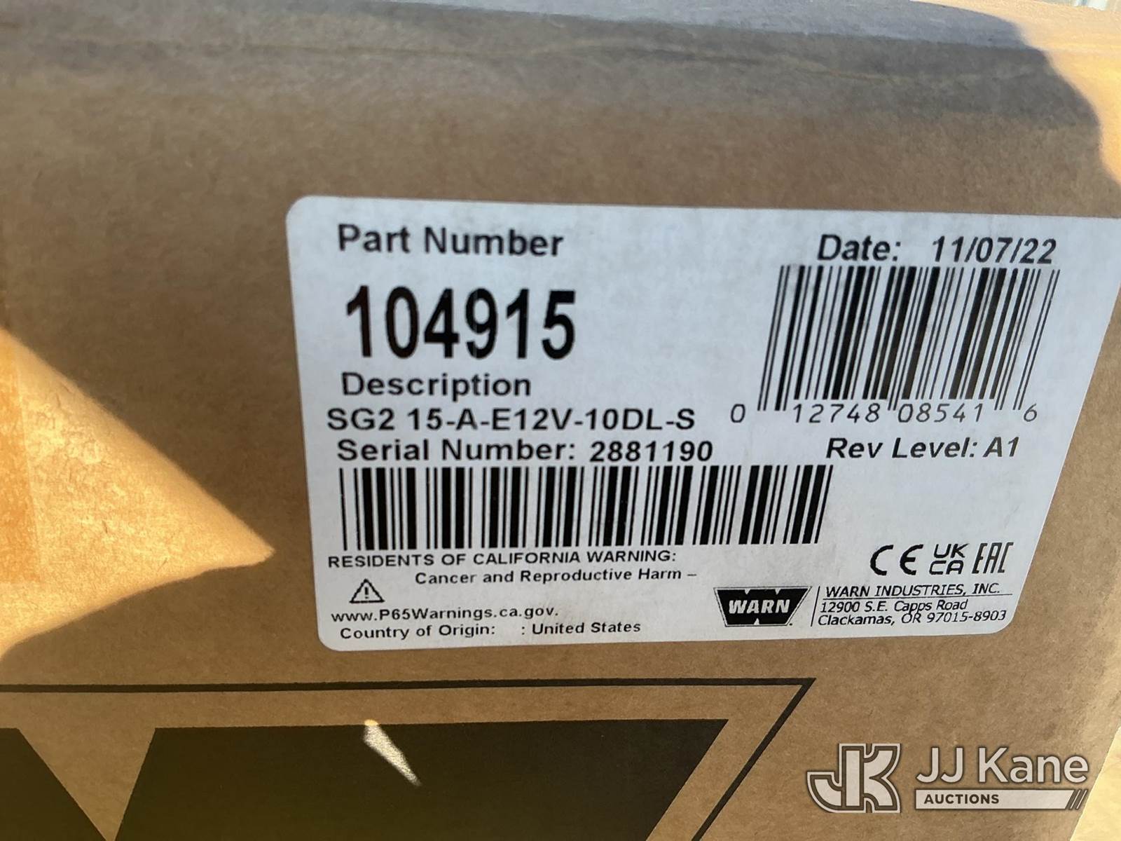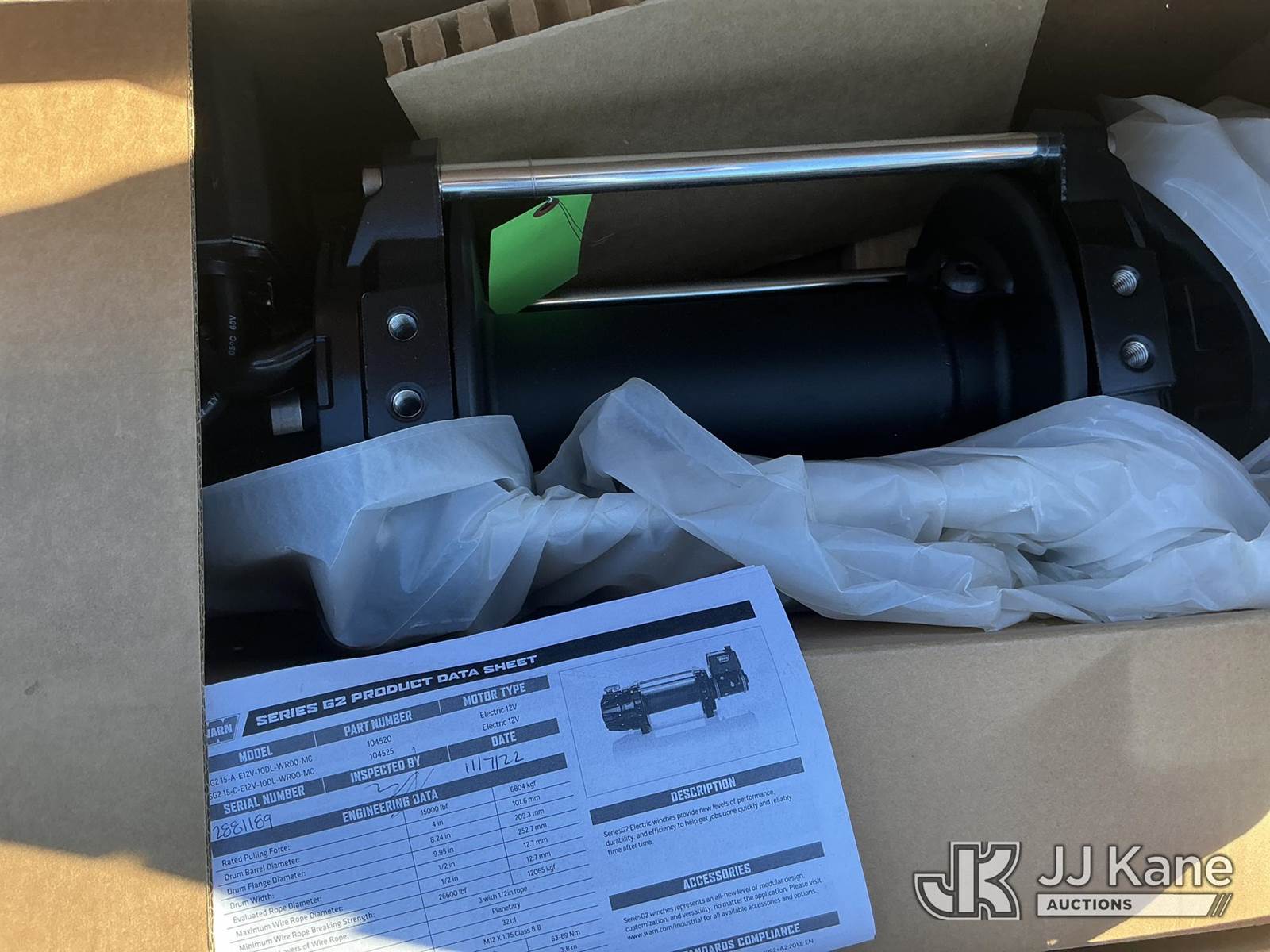 15,000 lb. Warn Winch, S/N: 2881190 (New) NOTE: This unit is being sold AS IS/WHERE IS via Timed Auction and is located in Kansas City, MO. For more information and removal arrangements please contact Ricky McPherson @ 816-610-2250. Load out by appointment only, Buyer/Hauler must present copy of paid invoice upon arrival. Purchaser acknowledges ALL lots must be removed within 5 business days of Auction. Items not removed in a timely matter will be transported by a third party to a storage facility. Buyer will be responsible for transport and storage fees. For load out and pick information, please reference the release form sent out after purchase. (Buyer is responsible for removal. Assistance by consignor or JJ Kane Auctions is not assured.)