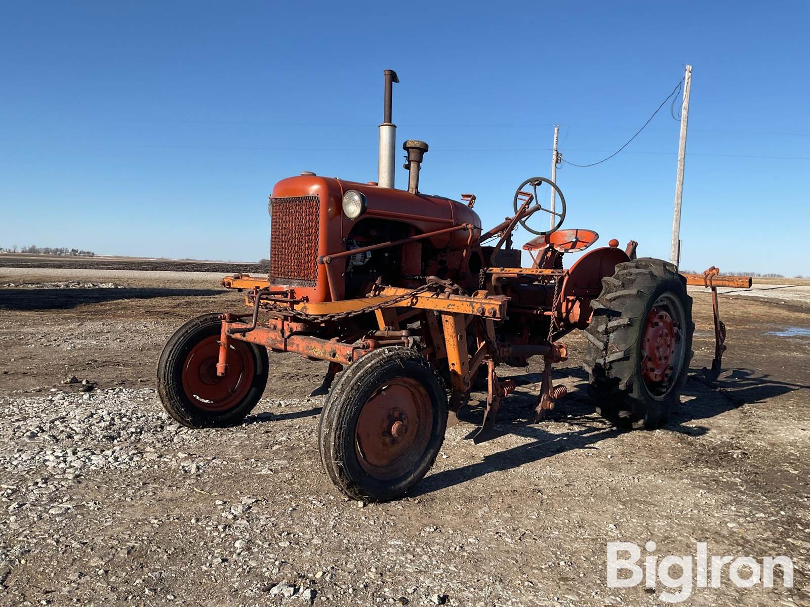 1953 Allis-Chalmers CA 2WD Tractor, 25 hp, Allis-Chalmers 2.1L 4-Cyl, Gas, Water Cooled Engine, Engine oil level full, 13-Gallon Fuel Capacity, Allis-Chalmers, Manual Transmission, 4 non synchronized Forward Speeds, 1 Reverse Speeds, Rear PTO Location, 1 Auxiliary Hydraulics, 5.00-15 Front Tires, 11.2-24 Rear Tires, Allis-Chalmers 2 row cultivator, w/tire track removal attachment, (2) 12 volt head lights, (1) tail light on left hand rear fender, Live 540 PTO due to hand clutch, 82” wheelbase, Overall width 80”, Converted to a 12 volt system, Negative ground w/an alternator, battery has been replaced, NOTE: missing toolbox lid, battery box cover is missing, support bar under the drawbar is missing, Left rear tire valve stem is bad, Fluid has damaged the rim, SN: CA28329