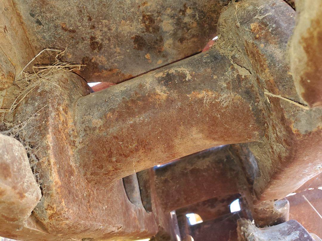 D9E Direct drive crawler tractor. 6 forward speeds, 6 reverse speeds, D353D Caterpillar engine, Turbocharged, 6-cylinder, liquid-cooled, Displacement 1473 cu. in. Bore/Stroke 6.25x8.00 inches. Starter is two-cylinder gas pony motor. Currently does not operate. 12 volt starter. Oil capacity 45 qts, Coolant capacity 160 qts. Originally this was a cable dozer, then converted to hydraulic lift 13.5 foot straight blade, 60 inch high. Ripper was added to pull 2- 4 foot swinging shanks, 3" wide. Left track has newer SALT track with minimal bushing wear. Right side bushing wear is noticeable. Draw Bar. No hour meter available.