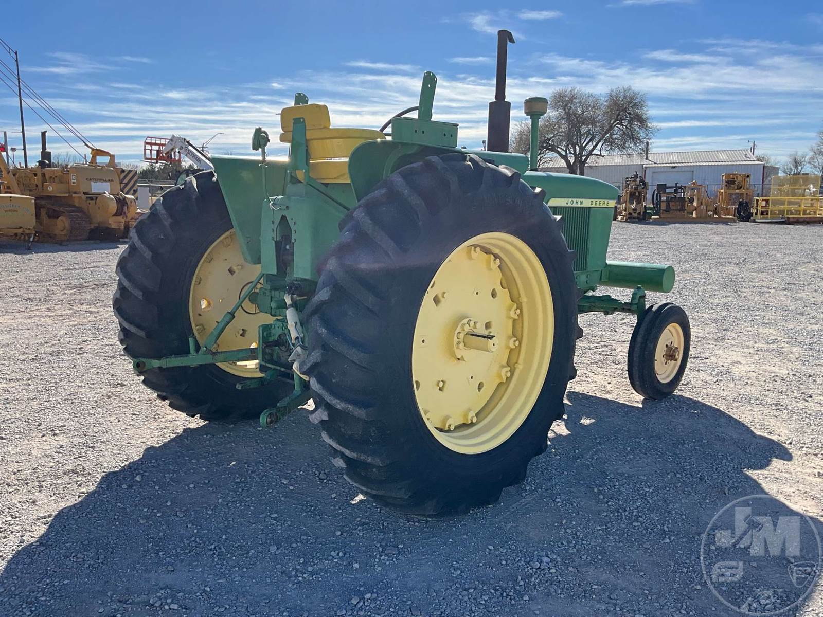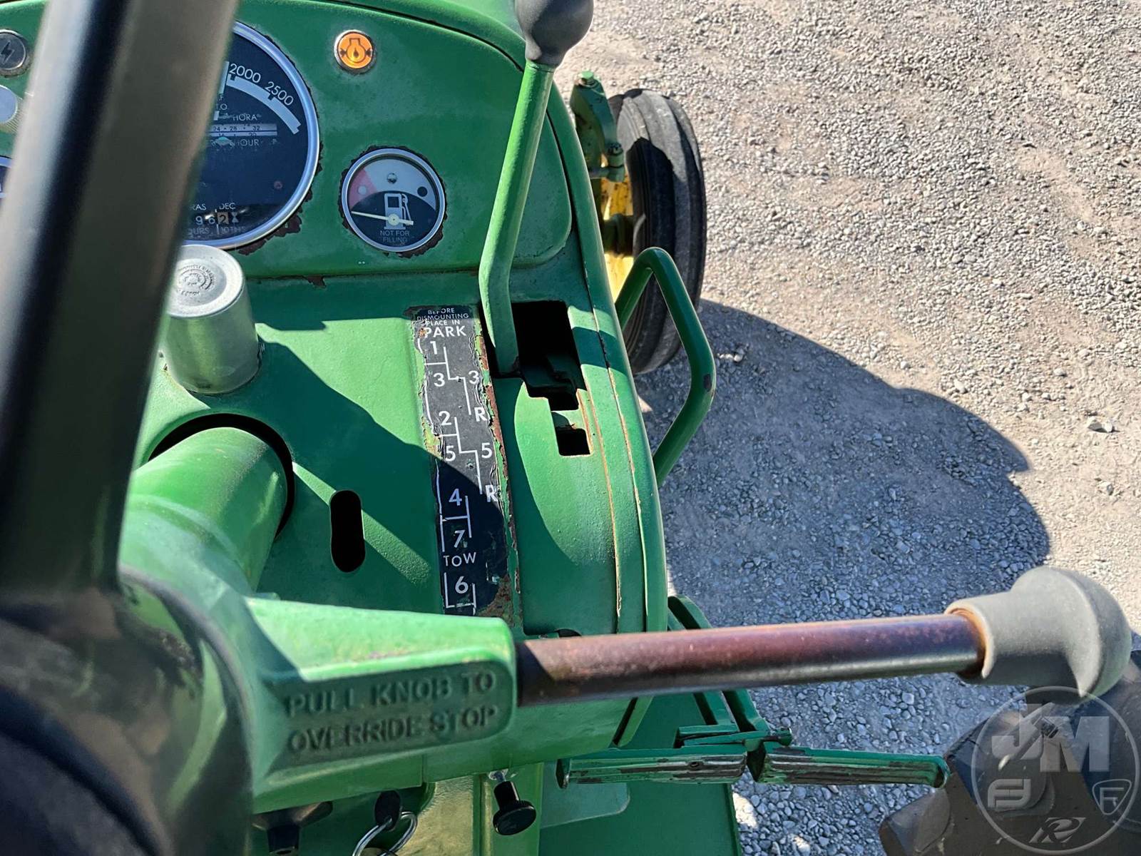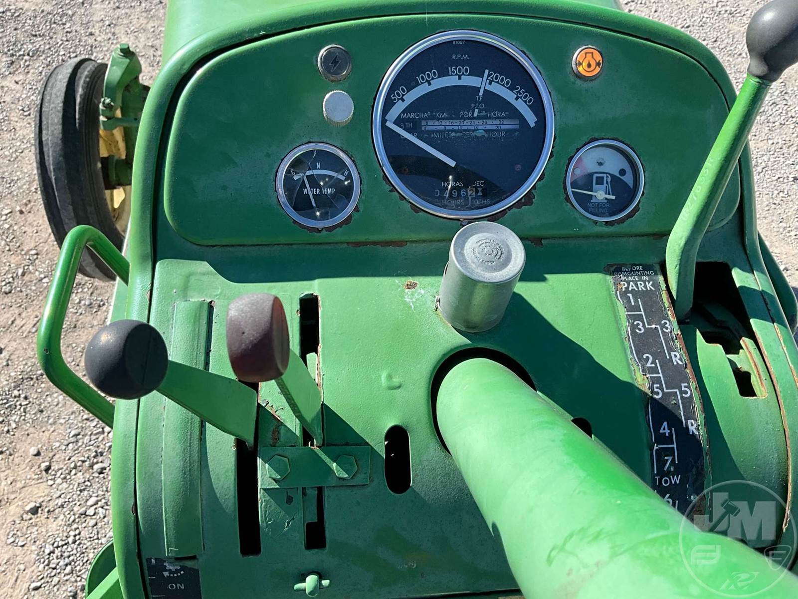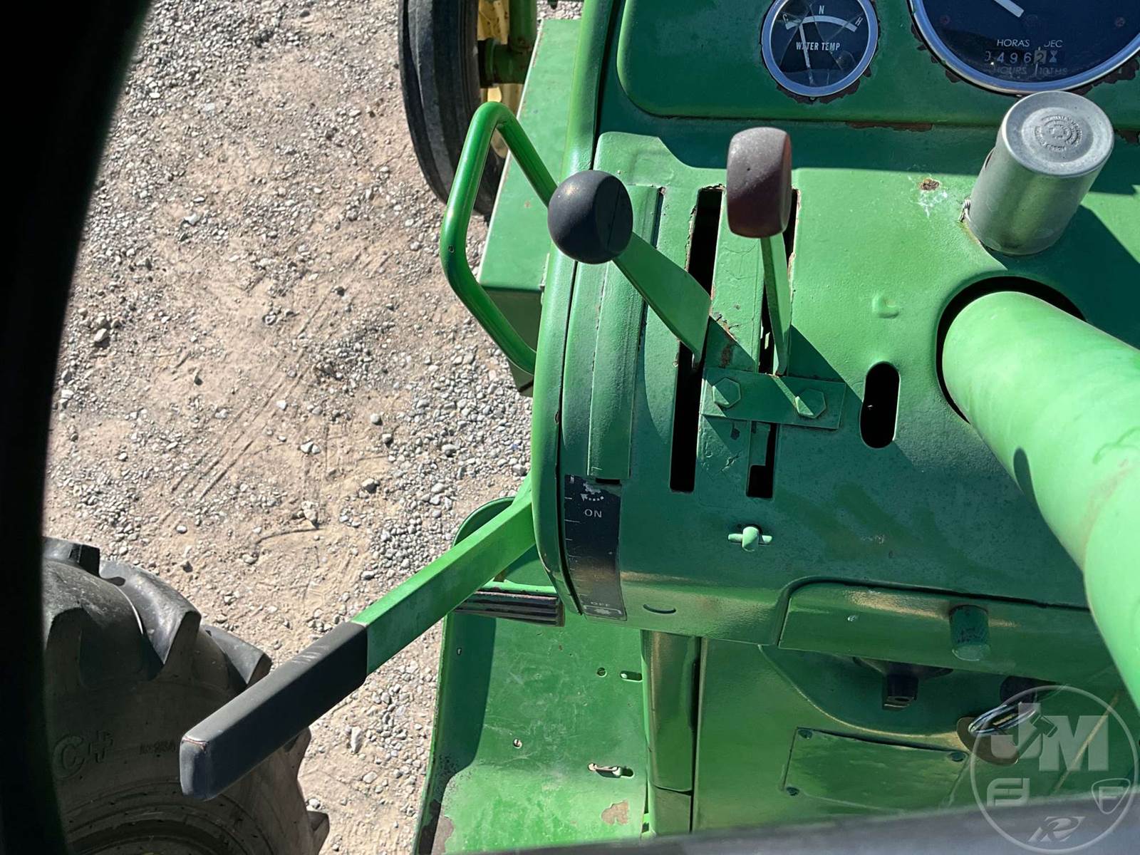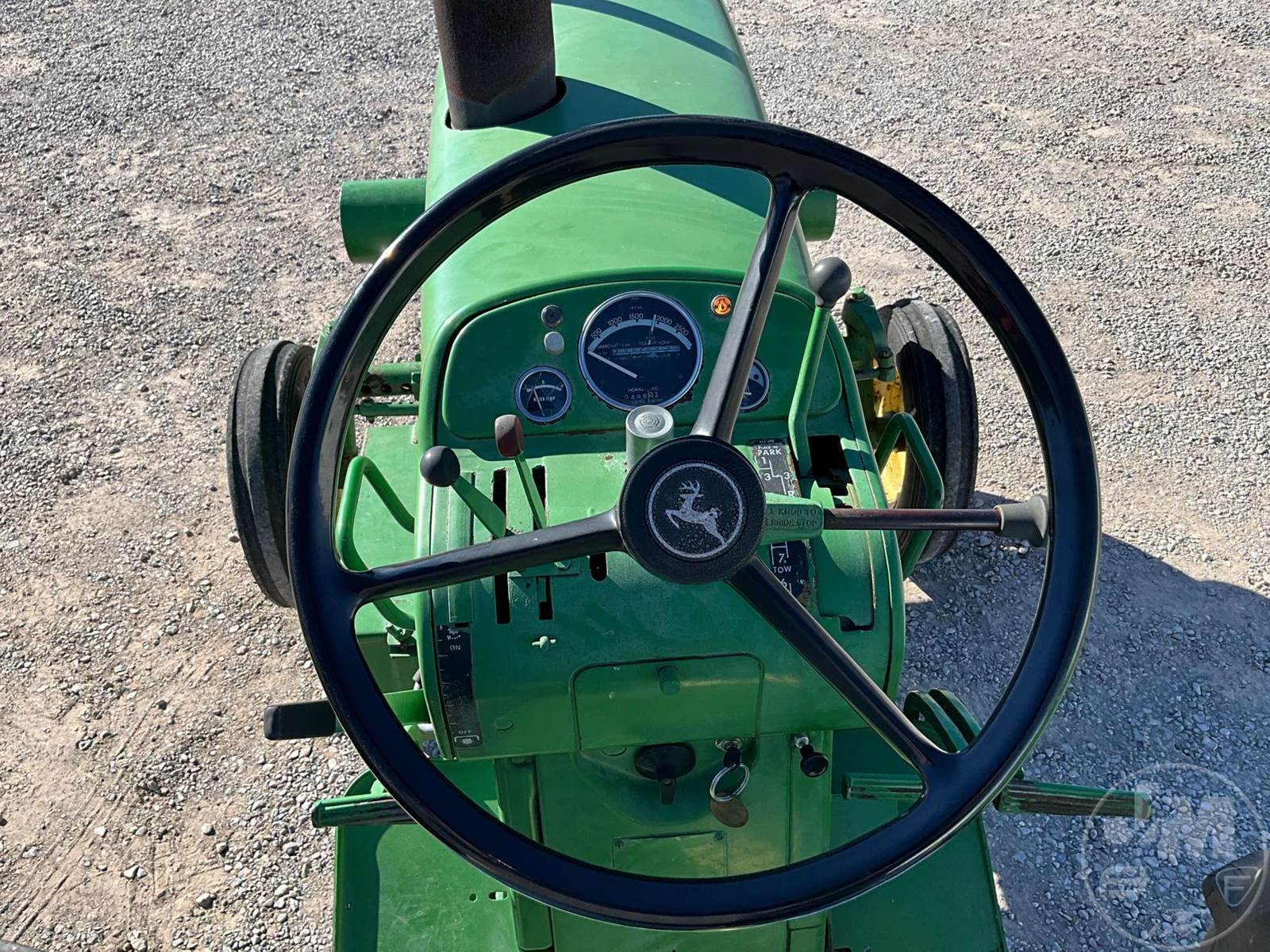 JOHN DEERE TRACTOR, OPEN STATION, 4 CYL, GAS ENGINE, 3 PT HITCH, DRAWBAR, 540 RPM PTO, REAR REMOTE, 16.9-38 REAR TIRES, 6.00-16 FRONT TIRES, HOUR METER READS: 496