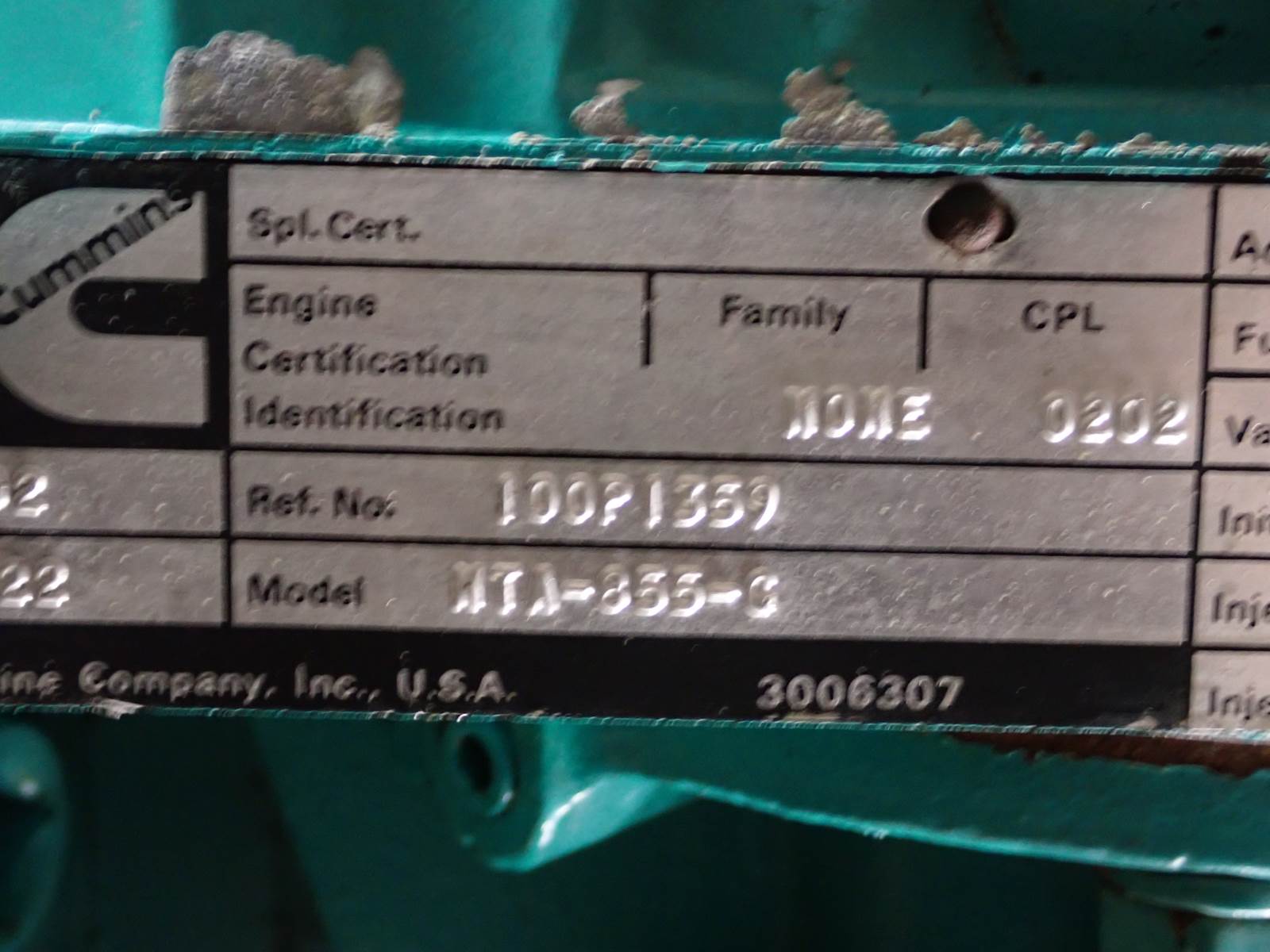 1977 Cummins NTA855 diesel engine, turbocharged, aftercooled, PT mechanical fuel system, 855 cid block, small cam, CPL 0202 (CPL 202,) approximately 350-380 HP rating, no HP rating on tag, 1445 hours. EXCELLENT RUNNING ENGINE, SUPER LOW ORIGINAL HOURS -- TEST RAN CLEAN, NO SMOKE OR BLOWBY OBSERVED DURING COLD TEST RUN, 60 LBS OIL PRESSURE AT IDLE AND FULL THROTTLE, VERY NICE ENGINE. SUPER CLEAN -- LOW ORIGINAL TIME -- THIS IS THE ONE TO BUY !