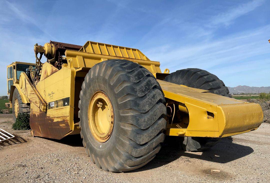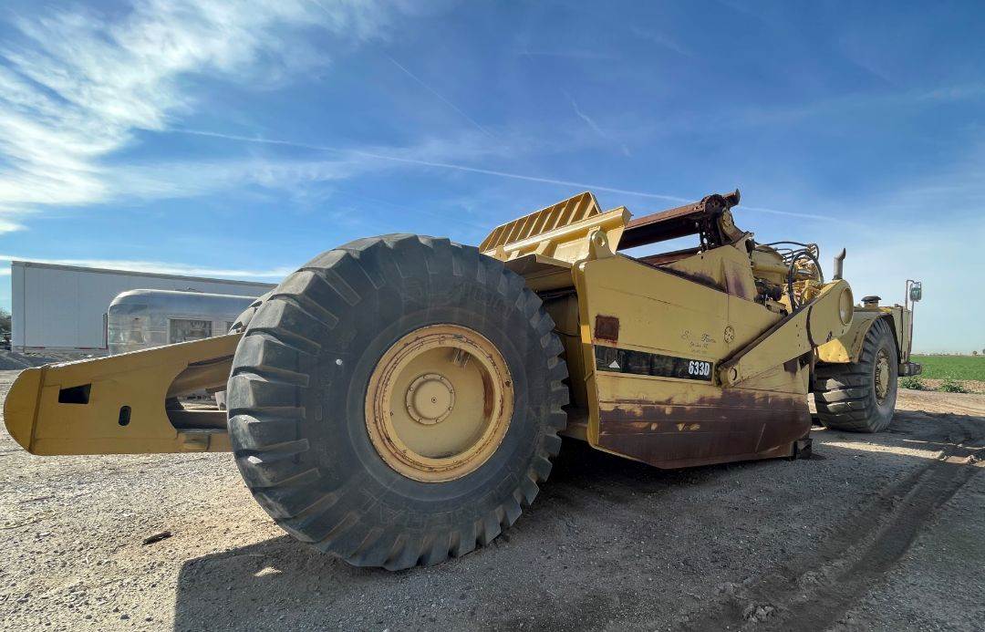 1978 Cat 633D Motor Scraper Enclosed ROPS, Heat/AC Engine: 3408 450 Hp HRS: 7,060 on meter / actual unknown. 8 Speed. Max speed forward: 30 mph. Price Reflects Motor Scraper Needs Work: Repack Bowl Cylinders, Transmission Seal Leak, Hoses Specs: Overall Length 48 ft, 8 in, Overall Width 13 ft, Overall Height 13 ft 92in, Operating Weight 100,817 lb