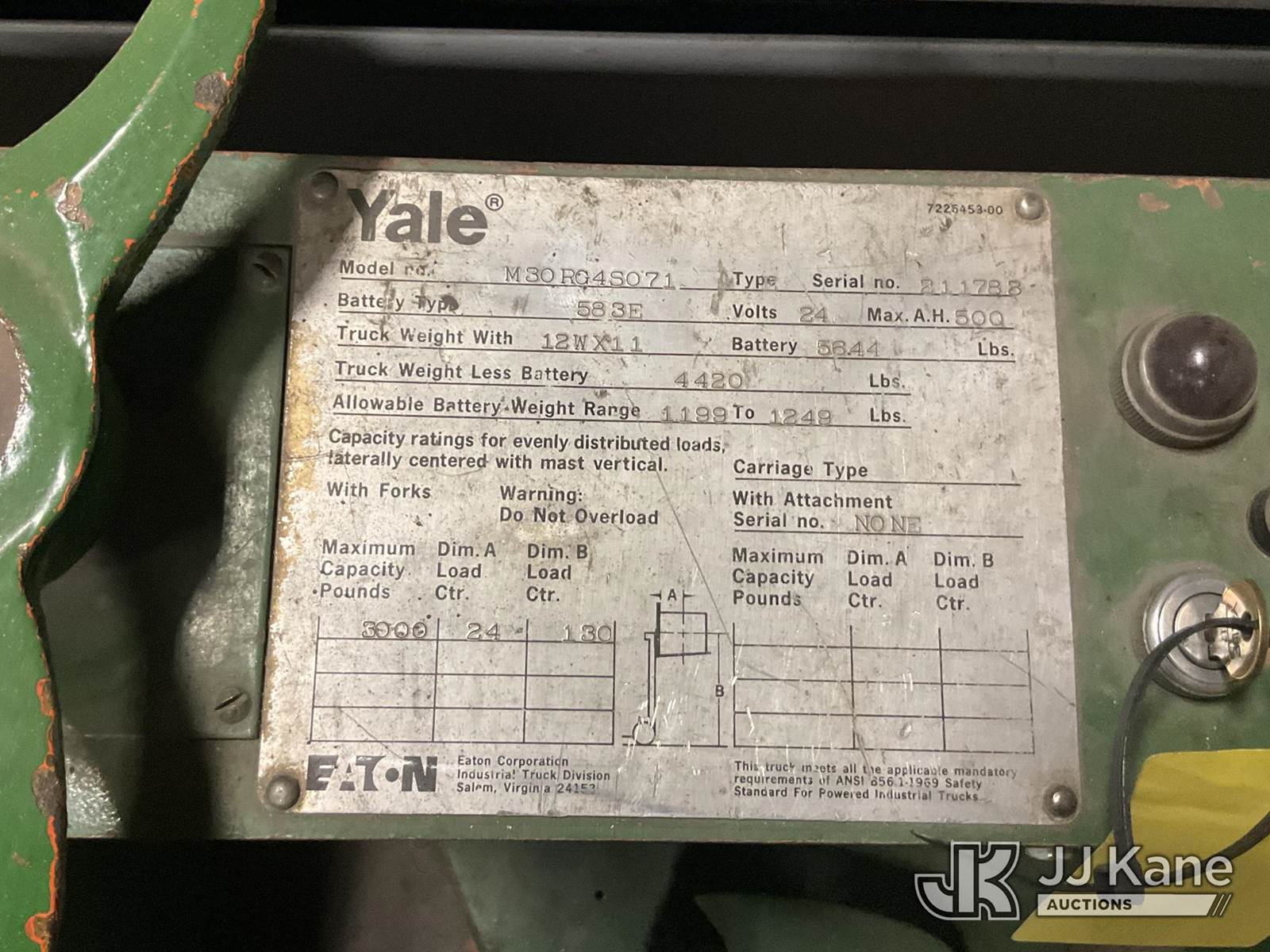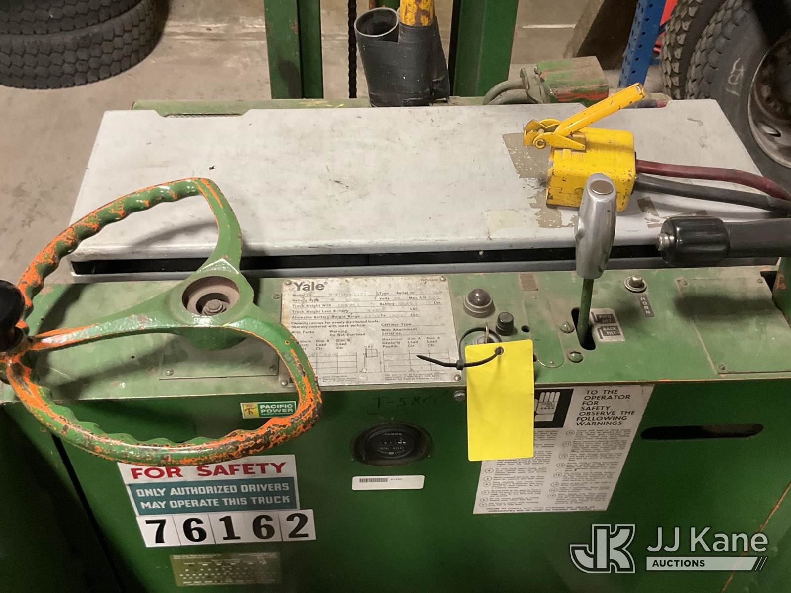 1978 Yale M30RG4S071 Stand-Up Forklift, s/n 211783, Hydrostatic, battery powered, with 3000lbs capacity, 130in fork height, (Does Not Operate, Condition Unknown) (Seller States: Battery won't hold charge) (Reads 1,923 hours) NOTE: This unit is being sold AS IS/WHERE IS via Timed Auction and is located in Prineville, OR. For more information & removal arrangements please contact Joseph Hull @ (801) 386-2131. (Buyer is responsible for removal. Assistance by consignor or JJ Kane Auctions is not assured.)