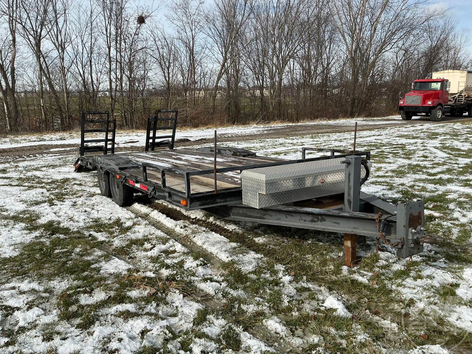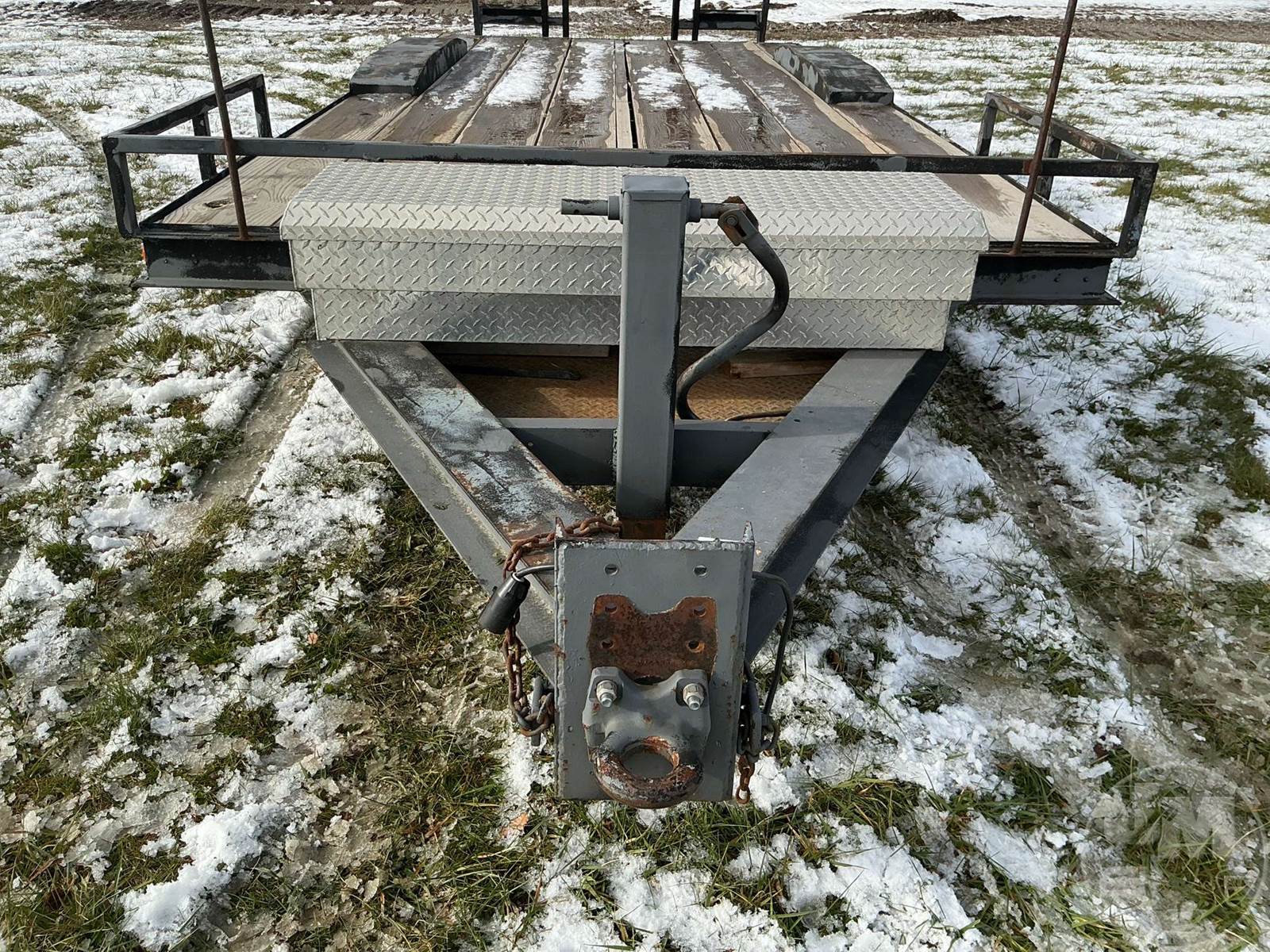 TAG A LONG EQUIPMENT TRAILER, 2 AXLE, PINTLE HITCH, WOOD DECKING, RAMPS, TOOL BOX, 2 SPEED JACK, TIE DOWN RINGS, BILL OF SALE ONLY, UNDER 4,000LBS/17FT LONG 98 INCHES WIDE/30 INCH DOVE/55 INCH RAMPS/TIRES ARE 205/85D14.5