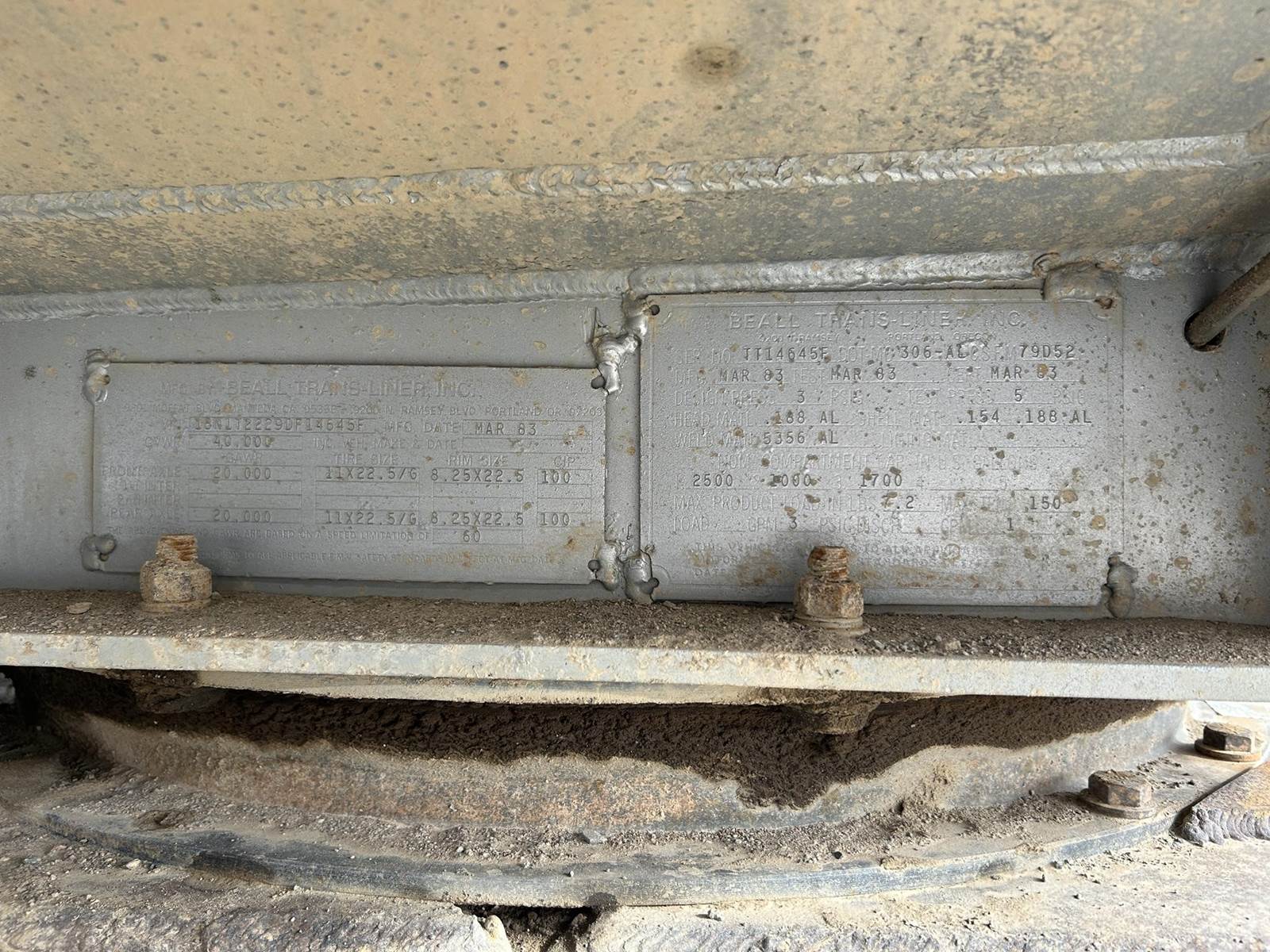 (Mfg. 3/83), Serial# TT4645F, MC306AL, 5200 Gallon, 3-Compartment (2500,1000,1700), Single Bulkheads, Cable Operated Internals, 4" API 'Y' Bottom Load Heads w/ Brake Interlock & Sight Glasses, Roto Tags, Work Light @ Load Heads, Vapor Recoveries w/ Brake Interlock, 3" Forward & Rear Pump Line, Scully Overfill Monitor, Optic Socket, Offside Gravity Drops & Vapor Recovery, DOT Rear Bumper w/ Pintle Hitch, Gladhands & 7-Way Plug, Spring Suspension, 11R22.5 Tires on All Aluminum Wheels, Cam Style Brakes, Stainless Steel Quarter Fenders on Front Axle, Aluminum Fenders on Rear Axle, L/H & R/H Chain Hangers, (2) R/H Stacked Hose Tubes, Fitting Box Mounted in Draw bar, Aluminum Ladder @ Front of Trailer......