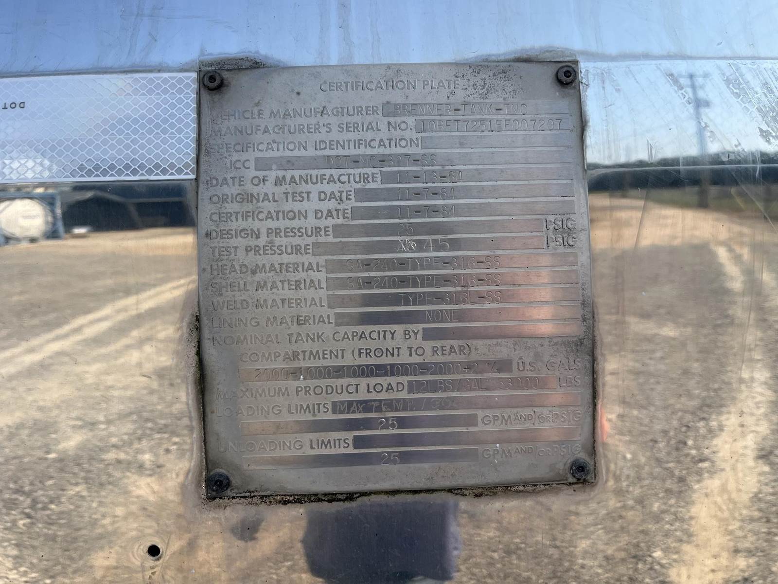 U2265 1988 Brenner Chemical MC 307 SS Straight Round Transport - 1 Compartment, - 7000 Gallons, - 25 PSI Rating, - Thermometers, -...