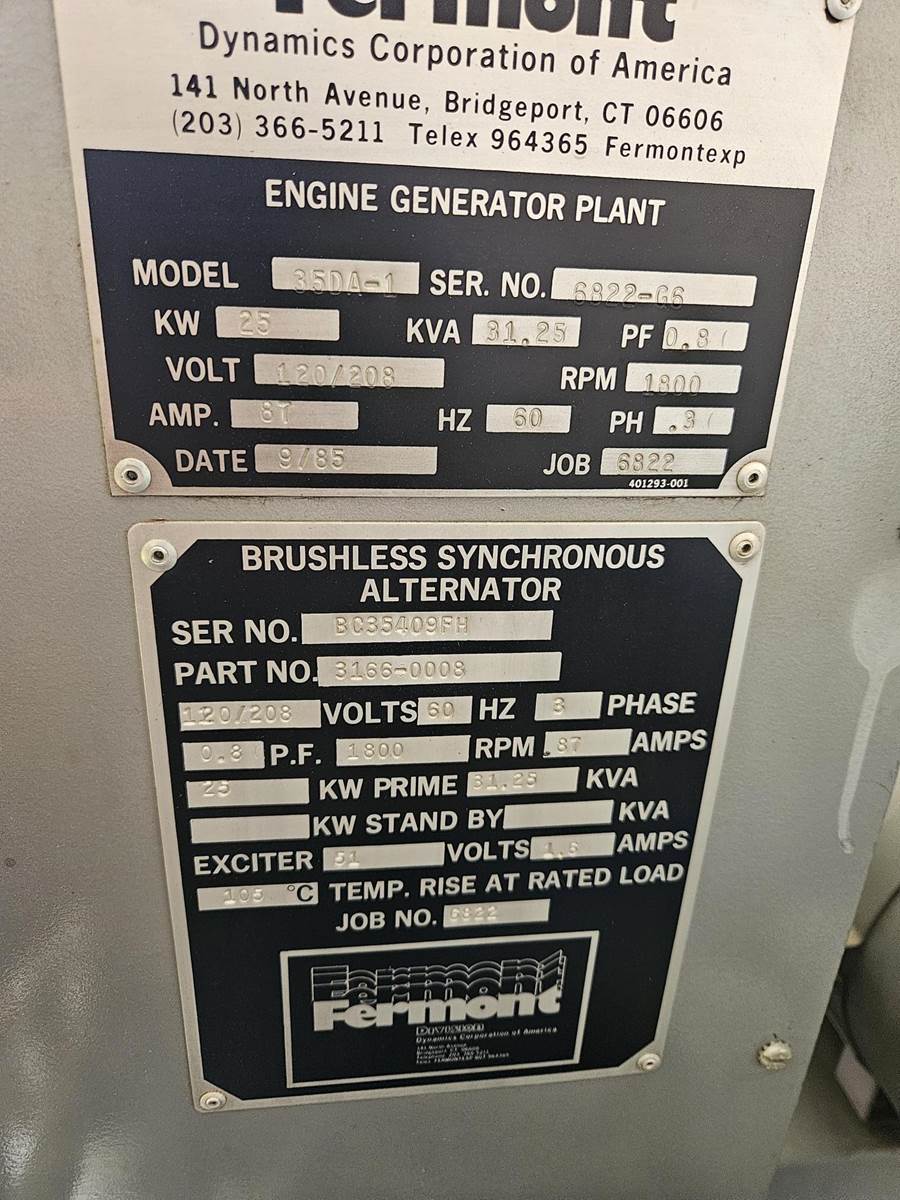 1984 Stationary Generator, Allis Chalmers 433 T diesel engine 75 HP, Zenith electrical components. Was originally used by the FCC for back up power to a light tower. In extremely good condition. Power generation 25 KW, 31.25 KVA, 120/208v 60Hz 3 phase, Enclosure dimensions 147.5" x 87.75" x 96" no signs of any corrosion. Electrical schematic is complete and in great condition.