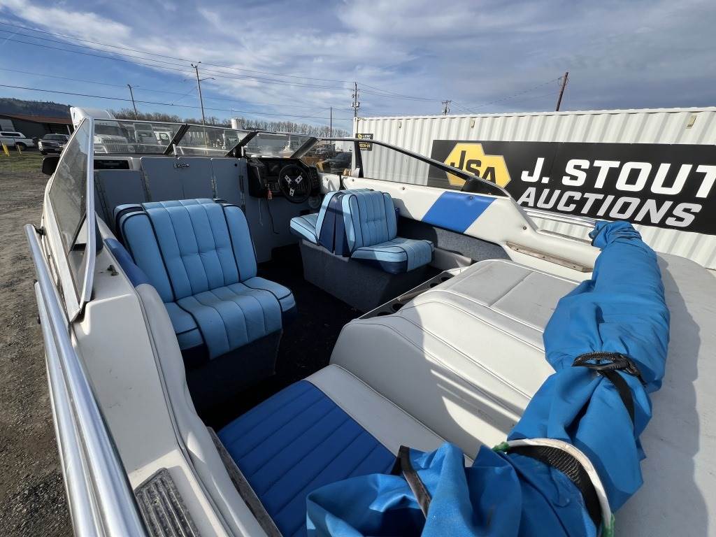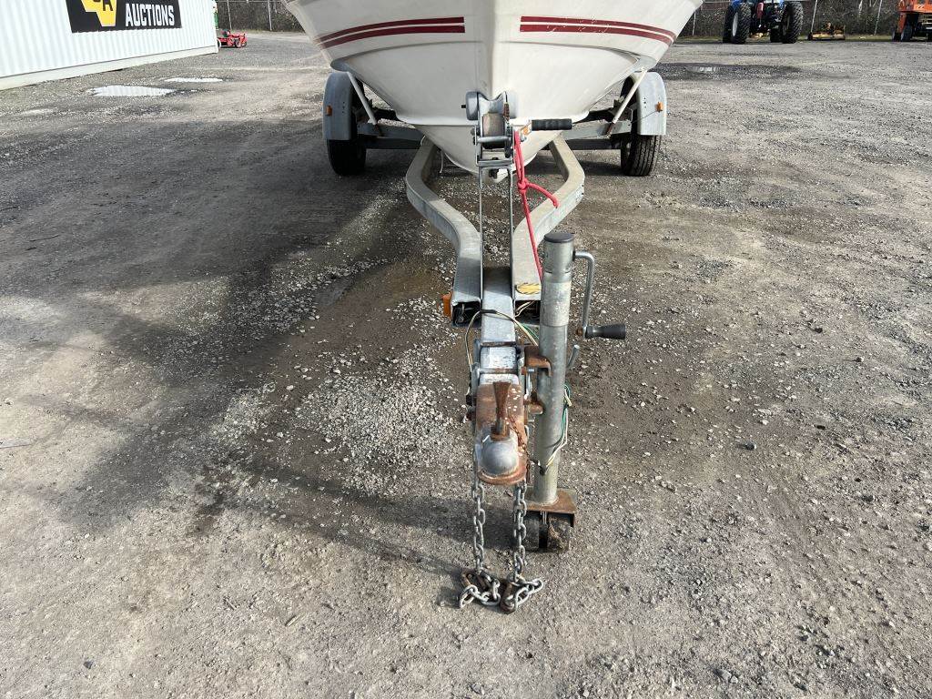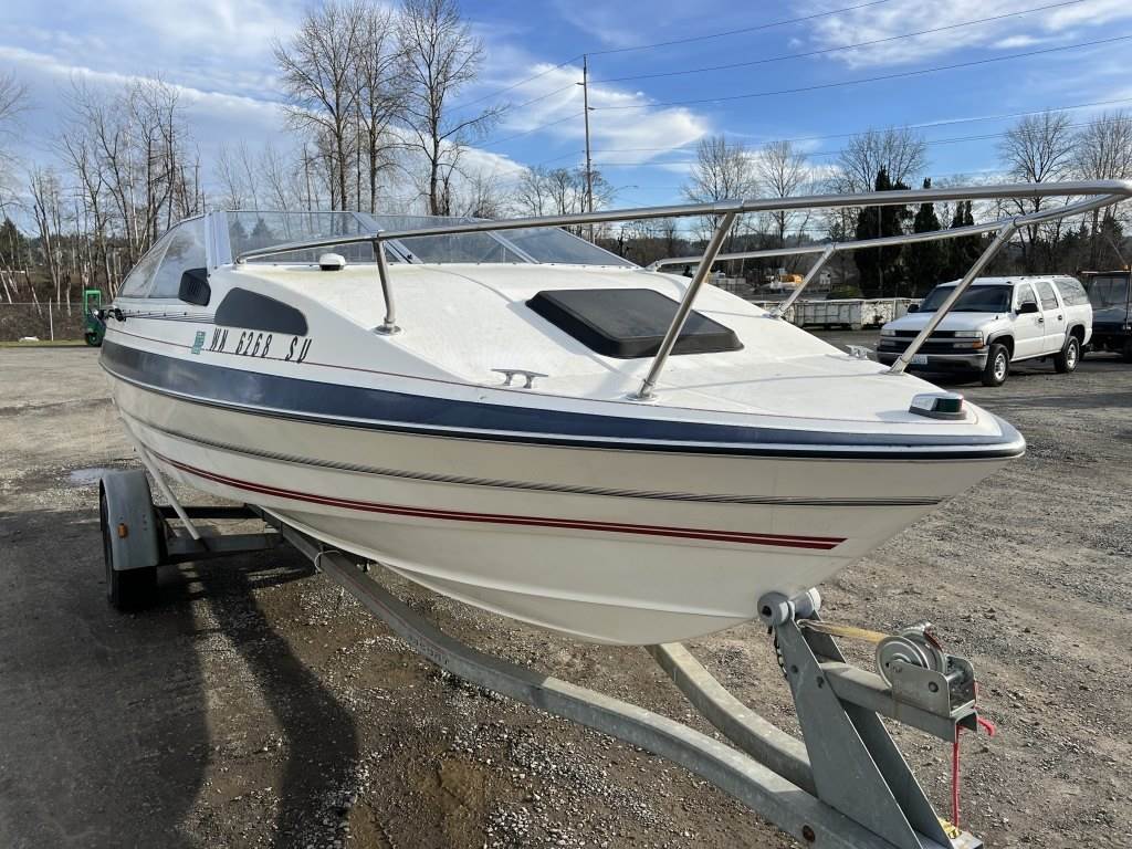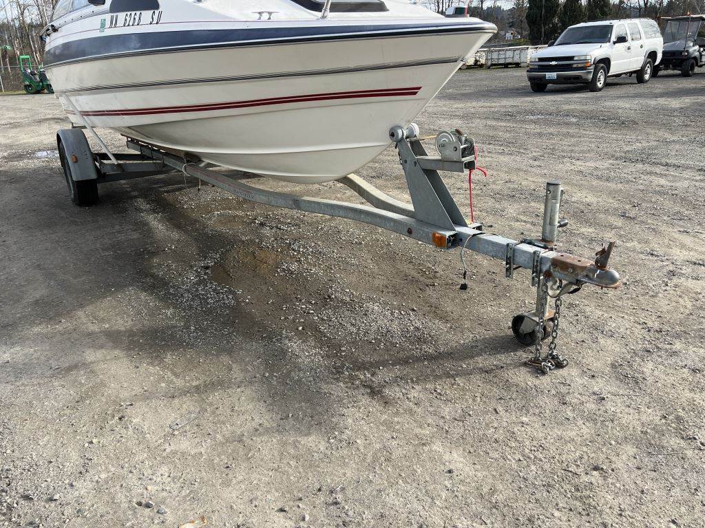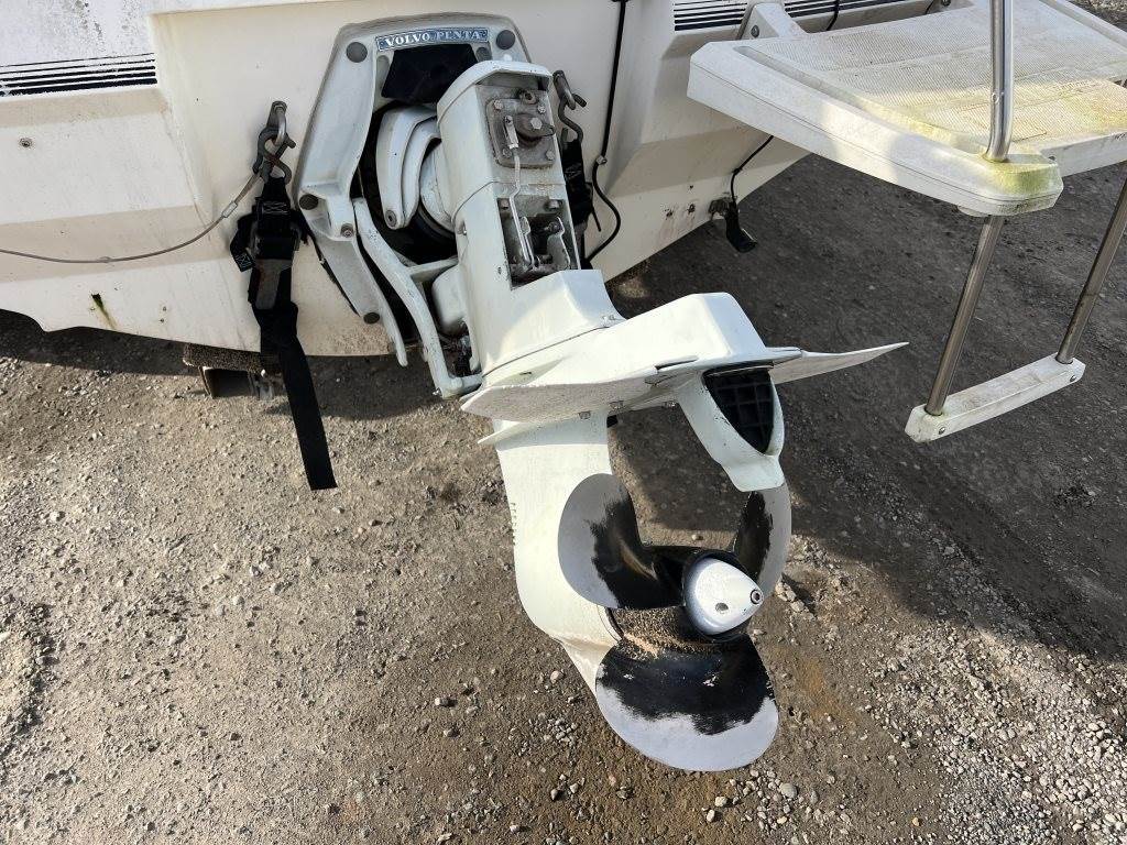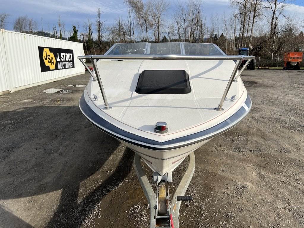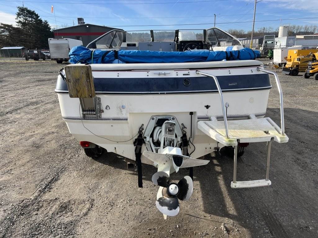 Location: Washougal WA ***End-User Consignment*** VIN: BL3B80CKH586 Engine: Volvo Penta 2.1L 3cyl Gas Bow rail, windshield, boat cover, outboard swim platform, outboard propeller, cuddy cabin, AM/FM/Bluetooth, 6 person/900lb capacity. Includes Calkins Escort S/A boat trailer, VIN: 1CXSP1910GS625683, 2" Ball hitch, ST215/75R14 tires.