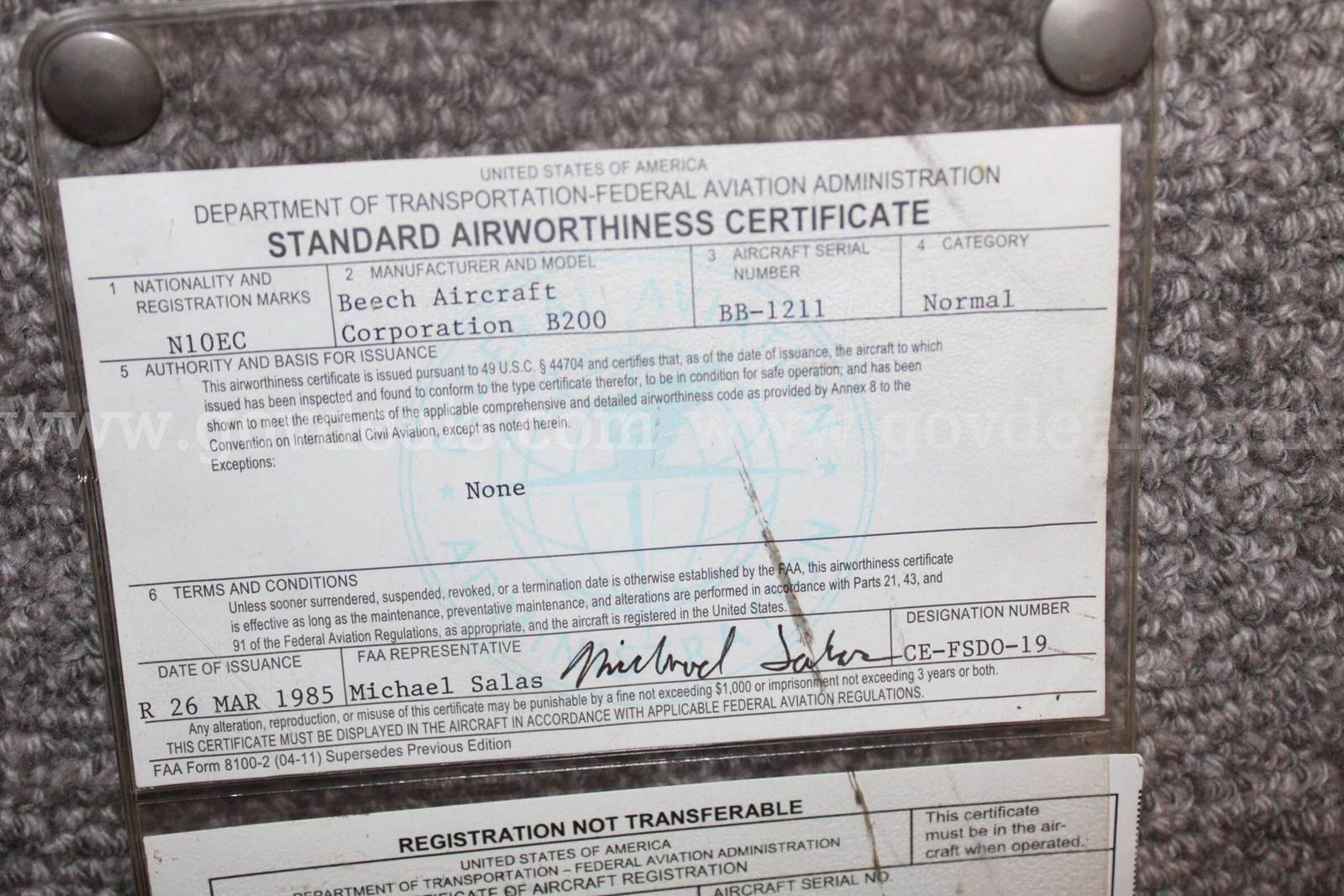 ✈️1985 Beechcraft King Air B200✈️ • Make/Brand: Hawker Beechcraft • Model: King Air B200 • Year: 1985 • Hours: 11,383.1 HRS - Aircraft Total Time • Title Restriction: Clean Title • Serial: BB-1211 • Condition: Used / Airworthy / Recently out of annual as of 01/31/26 • Tail Number Registration: Current N10EC/Pending Change to N10CW • Date of Last Airworthiness Certification: 03/26/1985 • Category: Normal • Liens: None • Engine Type: Pratt & Whitney PT6A-42 • Number of Engines: Two / 2 • Engine S/N: #1 - PCE-93630 / #2 – Gas Generator (GG) PCE-93089 and Power Section (PS)-93093-100 (split engine) • Engine Hours TSN: #1 – 10,809.6 / #2 -- Gas Generator 12,059.4/Power Section 12,199.6 • Engine Cycles CSN: #1 – 12,292 / #2 – GG 12,446/PS 12,415 • Engine TBO (3600 HRS): #1 – 887.3 HRS / #2 – 173.4 HRS (Remaining) • Engine Hot Section Insp TBHSI: #1 – 759.1 HRS / #2 – 1499.3 HRS Remaining until 1,800 HRS Inspection • Propeller Type: Hartzell - HC-D4N-3A/D9383K • Propeller S/N: #1 – FY4423 / #2 – FY3298 • Prop Hours TSN: #1 – 6,746.8 / #2 – 6,746.8 • Prop TSO (72 MONS): #1 – 470.2 HRS / #2 – 470.2 HRS (C/W DEC 2022 due in DEC 2028) • HOBBS Meter: 3135.7 HRS • Number of Landings: 14,774 Last interior/paint refurbishment done April 2013 Landing gear system: Factory Hydraulic/Cleveland wheels and brakes (Main and Nose) Exhaust stacks: Frakes Raisbeck upgrades: • Quiet Turbofan Propellers • Ram Air Recovery System • Enhanced Performance Leading Edges • Dual Aft Body Strakes B/E Aerospace Quick-Donning Crew Oxygen Masks Baggage Compart Dual Jump seat STC Avionics include: Collins APC65 Autopilot, Collins Dual Comm/Nav, Garmin GTN 625 GPS, Avidyne FlightMaxEX500 MFD • 6-year gear due March 2027 • Phase 3 & 4 due in Jan. 2026 • Pitot Static due in Jan. 2026 • Fuel Nozzles and Borescope due in 100.9 hours • Aircraft is not in service as of 01/31/26 • Last Inspection Date: PHASE #1 & #2 01/2025 • Aircraft Logbooks and component records are up to date and available for bidder viewing. • All listed above current as of 02/05/2026. State of Tennessee Tristar logo and old Tail number will be removed prior to buyer pickup Aircraft will need ferry permit to depart, buyer is responsible to obtain, TDOT can assist Prospective buyers may conduct inspections of the aircraft on-site; however, pre-buy inspections involving disassembly, removal of parts or alteration of the aircraft will not be allowed. All goods have been available for inspection and are being sold on an “as is” and “where is” basis with no guarantee expressed or implied by the State of Tennessee or the auction firm. Buyers are encouraged to inspect all items before bidding. Known defects are listed, but the absence of any indicated deficiencies does not mean the item may not have deficiencies.