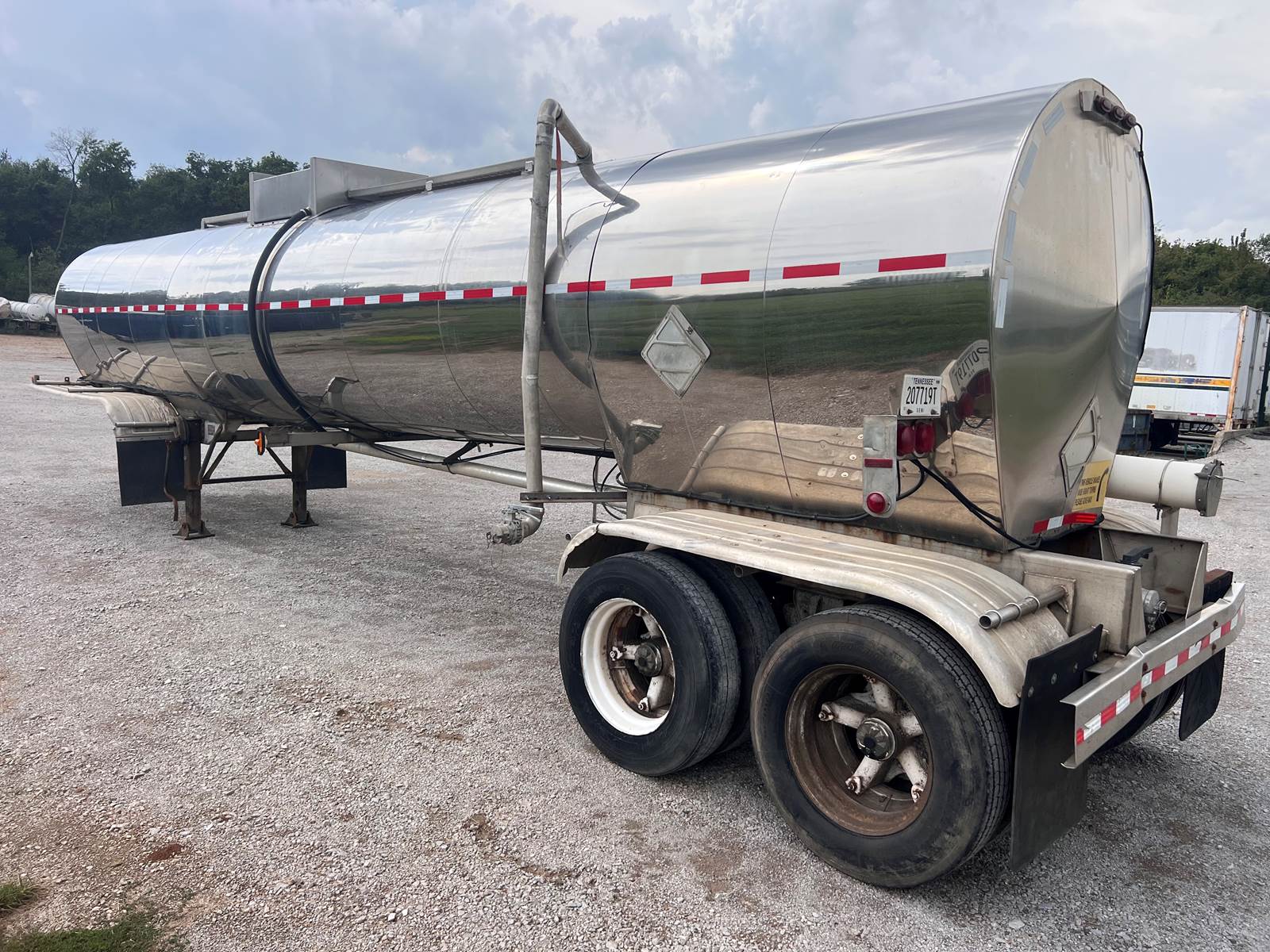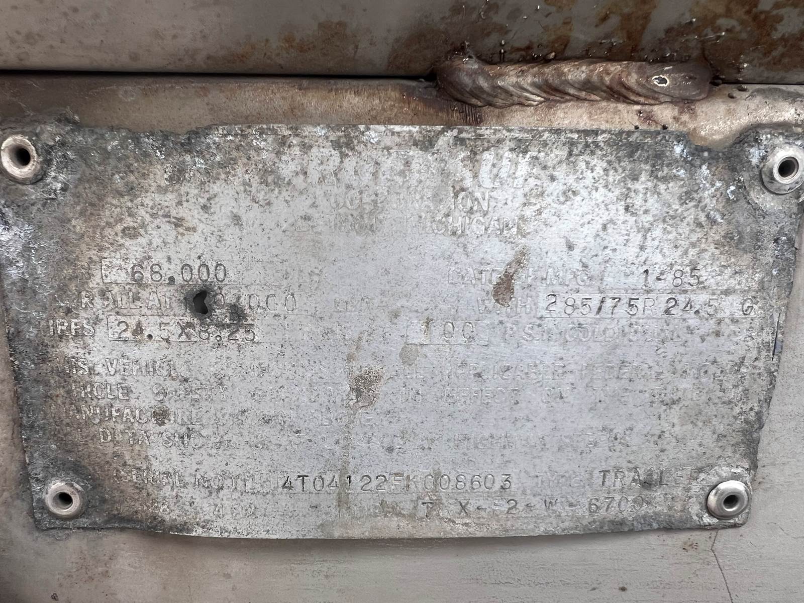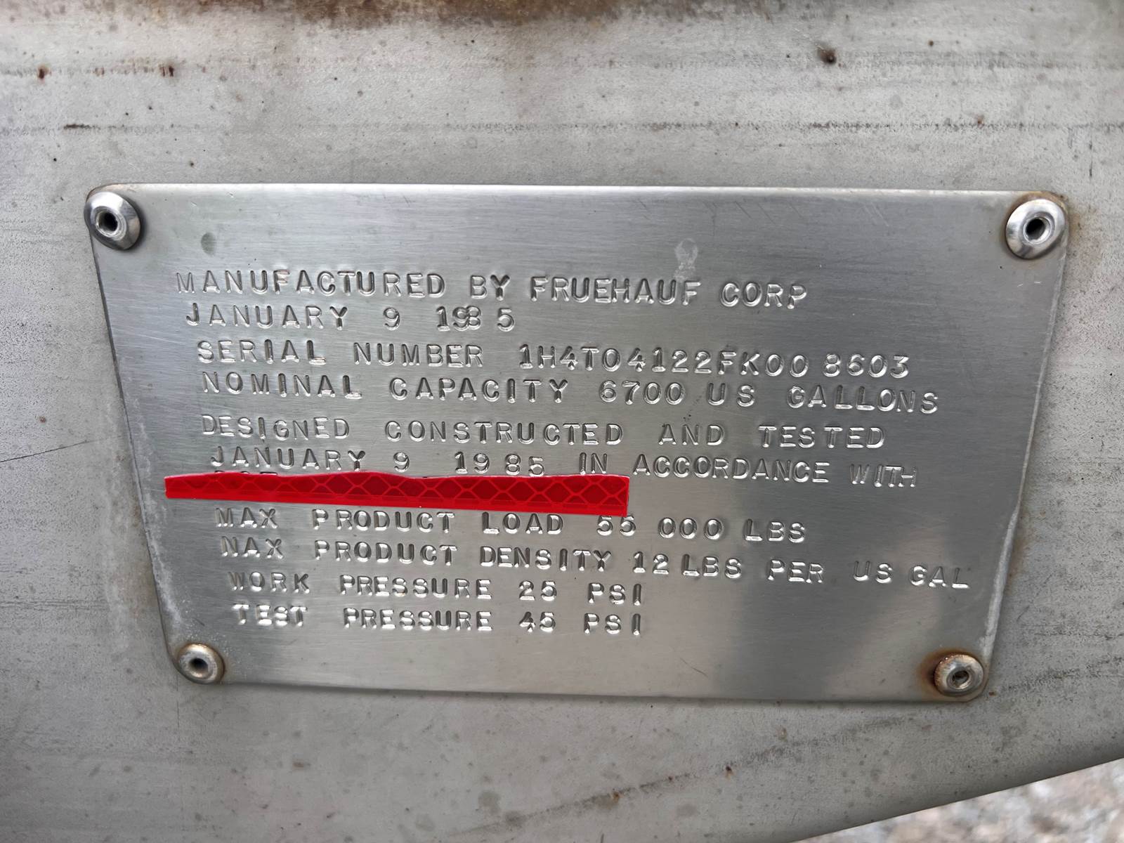 Unit 101C 1985 Fruehauf VIN 1H4T04122FK008603 Non Code 6700 gallons 1 Compartment Sloped to center shape 41' overall length Stainless Steel barrel Stainless Steel jacket (Insulated) Rear discharge location (4” Discharge pipe size) Stainless Steel frame rails (Good Condition) Leaf spring suspension Steel spoke wheels S cam brakes - New 285/75R24.5 Tires - 6 tires @ 15/32nds / 1 @ 9/32nds / 1 @ 3/32nds 2 Speed landing gear