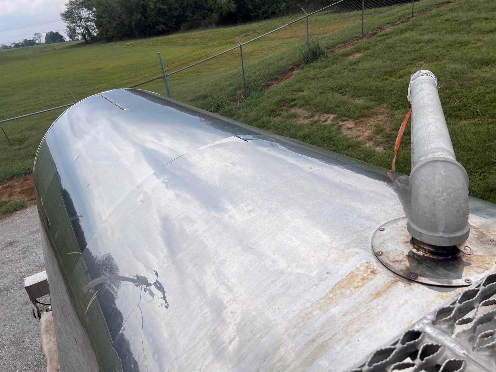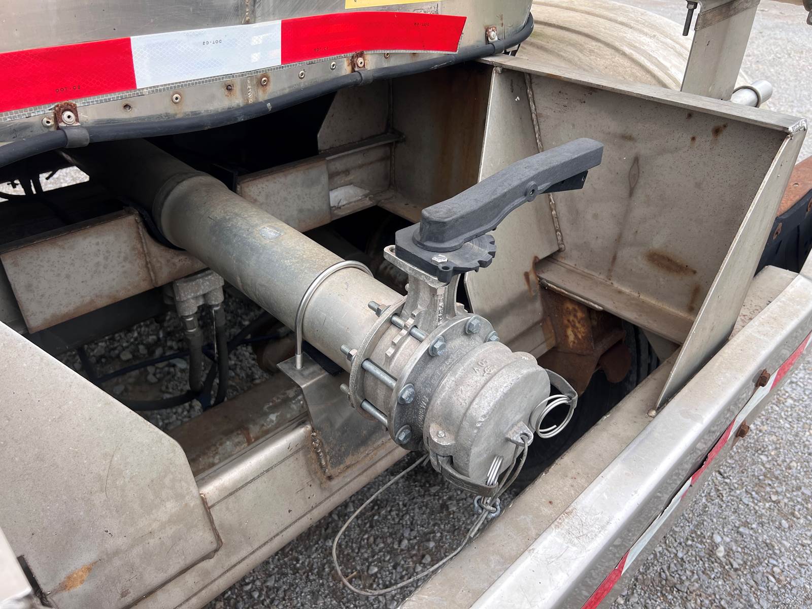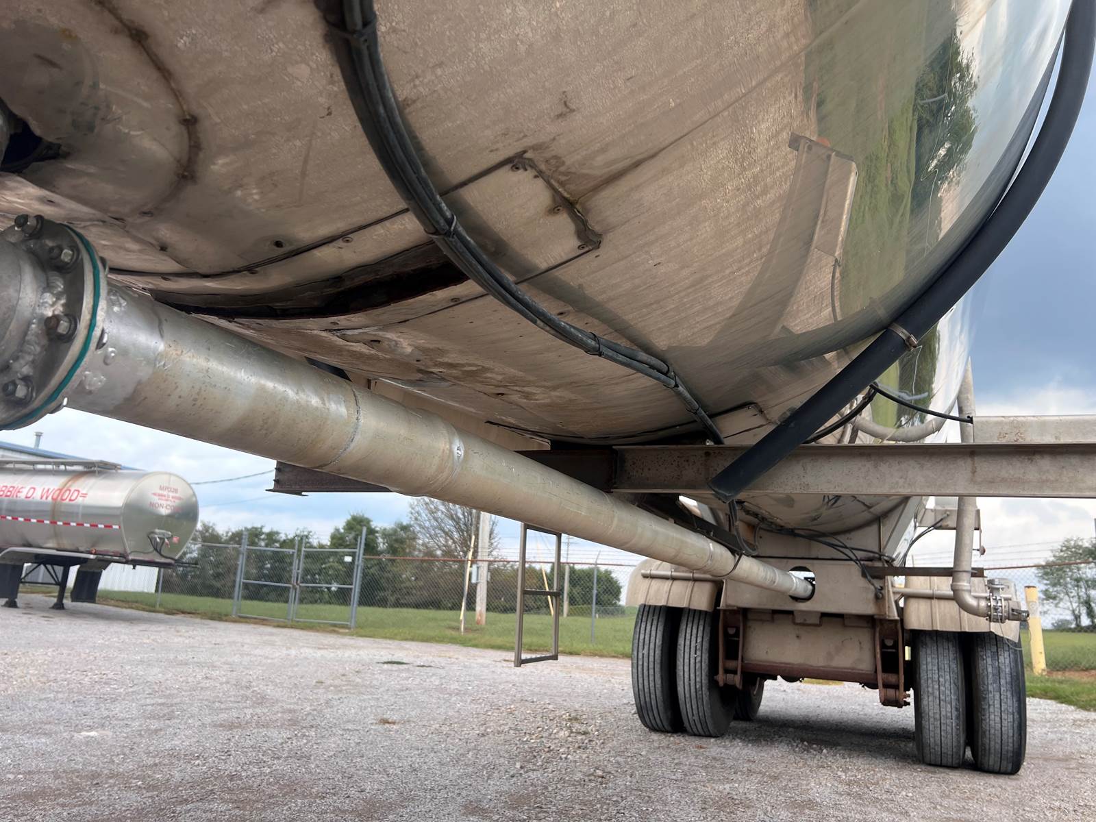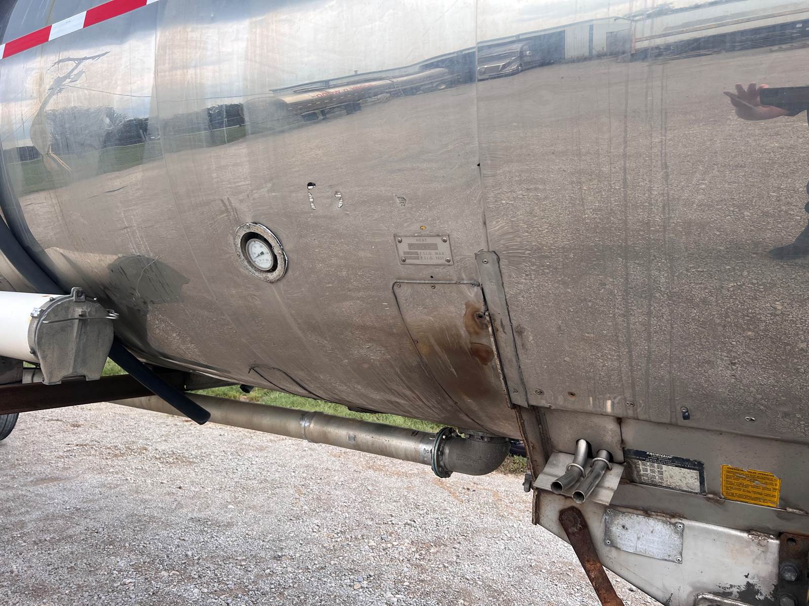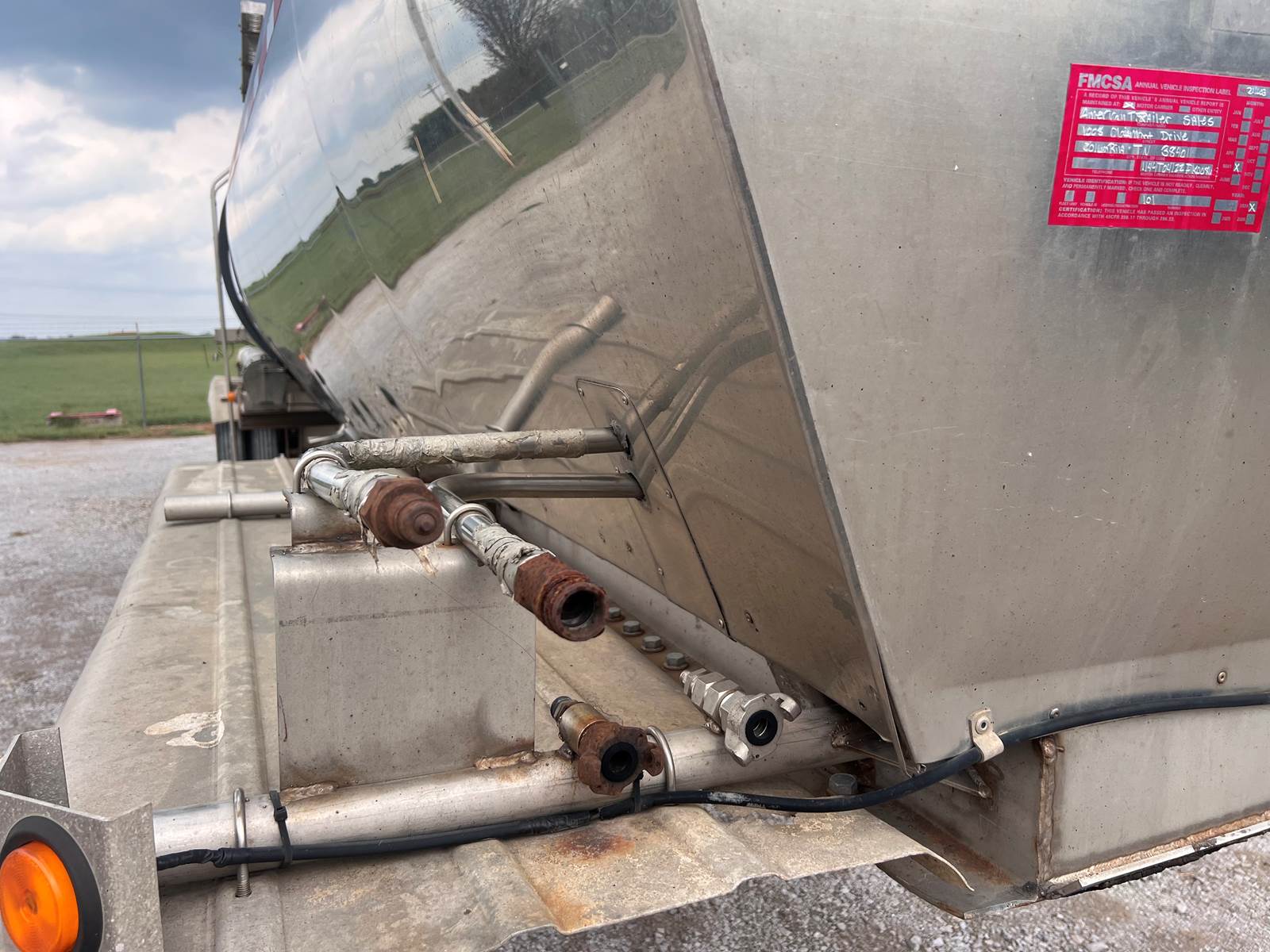 New Leak Check New brakes DOT annual inspection completed on 05/2024. There are a few sections on the 4" discharge pipe that have weld repairs. The internal valve was removed from the inner barrel; it only has the butterfly valve at the rear of the trailer currently. There is a second Discharge/Loading pipe coming down from the top of the trailer to the street side in front of the tires, It is a 3” pipe. This trailer was last hauling Waste Water from Indigo Leaves, the barrel is stained.