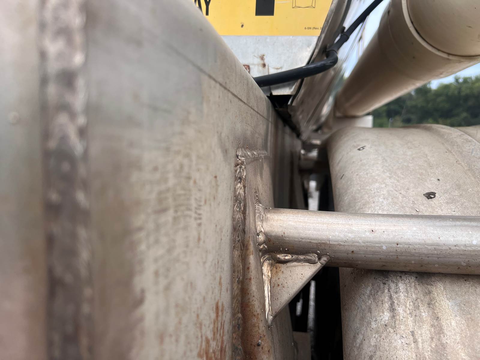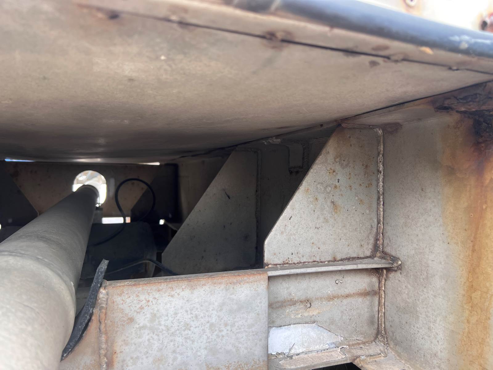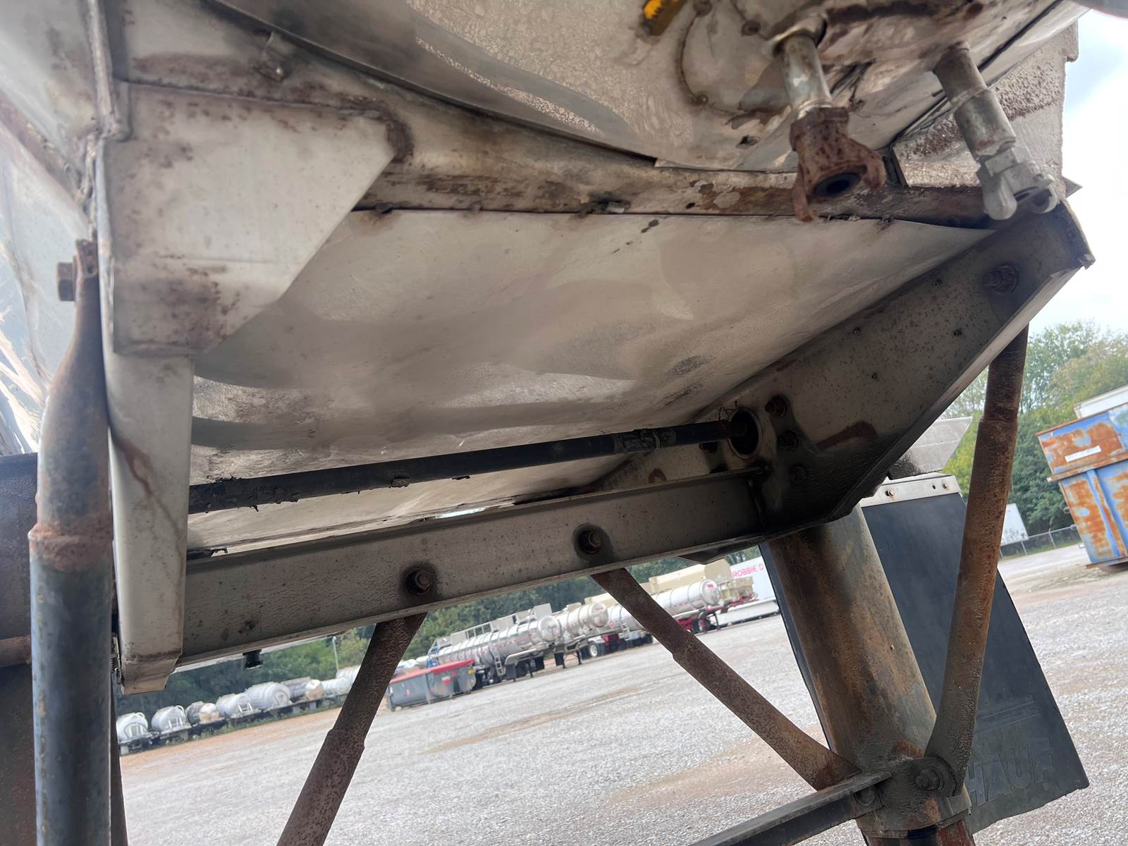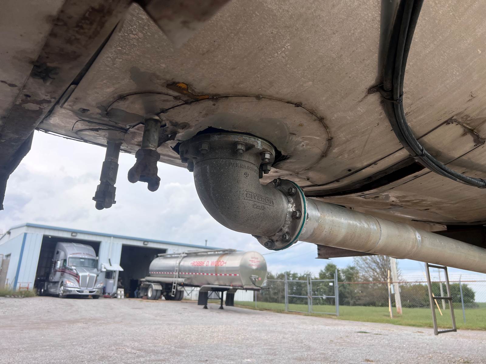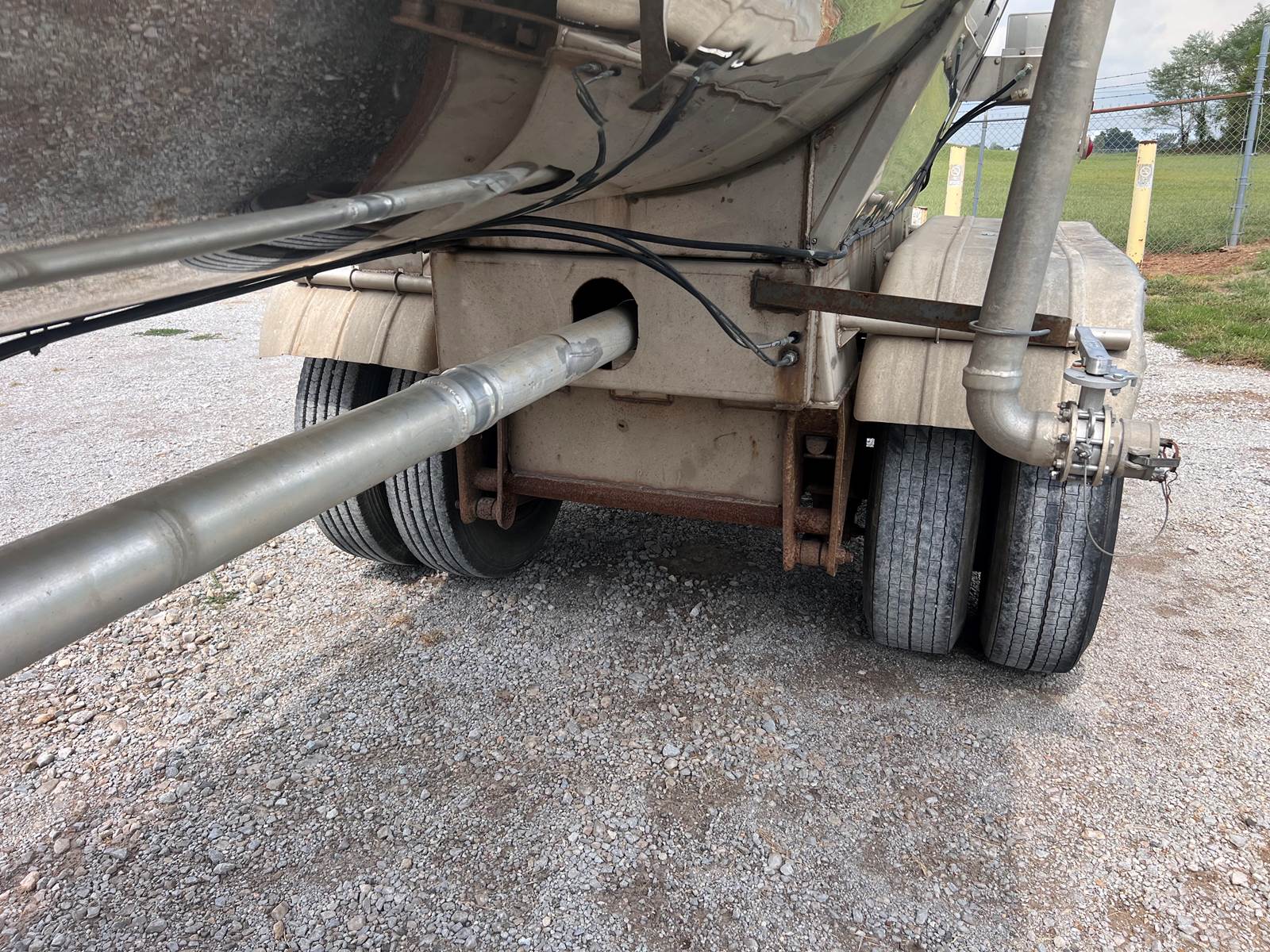 New Leak Check New brakes DOT annual inspection completed on 05/2024. There are a few sections on the 4" discharge pipe that have weld repairs. The internal valve was removed from the inner barrel; it only has the butterfly valve at the rear of the trailer currently. There is a second Discharge/Loading pipe coming down from the top of the trailer to the street side in front of the tires, It is a 3” pipe. This trailer was last hauling Waste Water from Indigo Leaves, the barrel is stained.