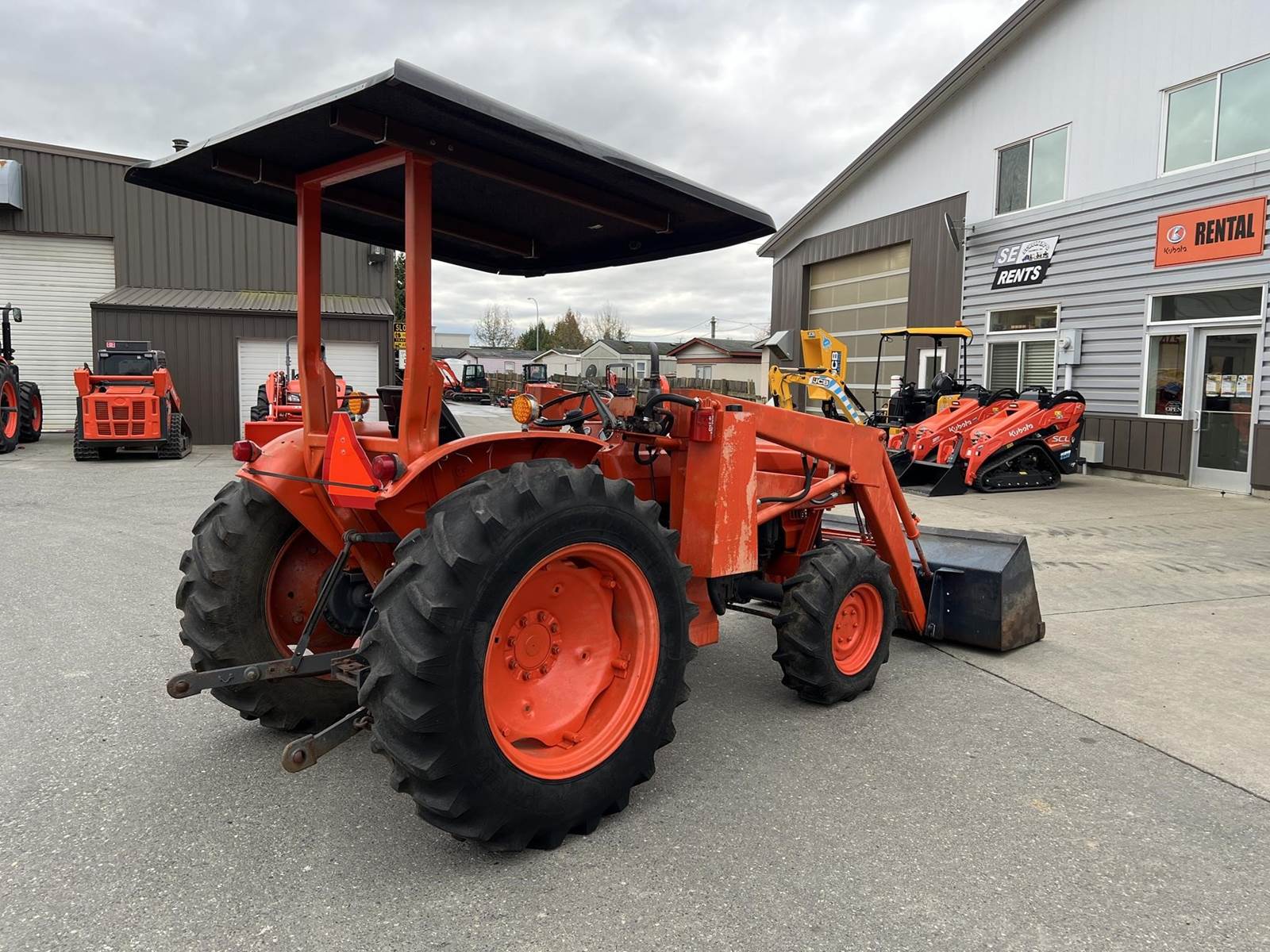 1985 KUBOTA L345DT Compact Utility Tractor - Kubota diesel engine, gear driven transmission with four gears, plus reverse, in two ranges, loader with pin-on bucket, rear PTO, rear 3PT., two-post ROPS with canopy.