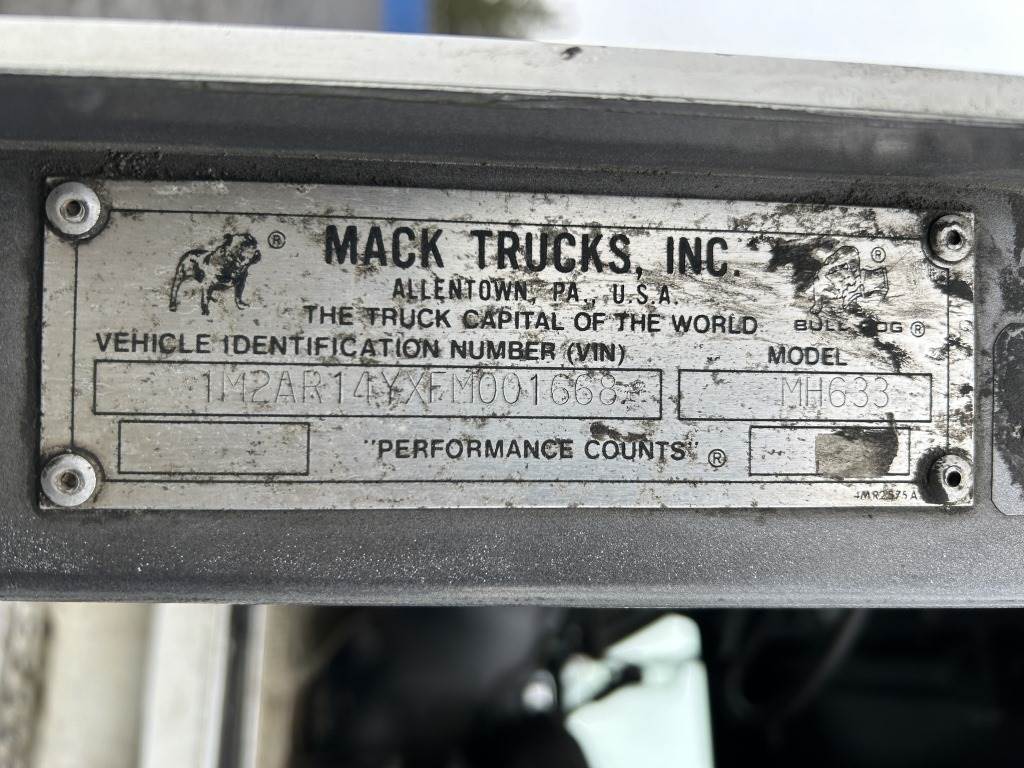 Location: Spokane WA ***End-User Consignment*** VIN: 1M2AR14YXFM001668 Engine: Cummins 14.0L 5cyl Turbo Diesel Transmission: Eaton Fuller Roadranger 13 Speed 15' Cab to frame end, single bunk sleeper, air slide 5th wheel, air brakes, engine brake, Protech chain hangers, 1,238 engine hours indicated, A/C, AM/FM, CB radio, air suspension, 11R24.5 front tires, 295/75R22.5 rear tires. Miles: 854,170