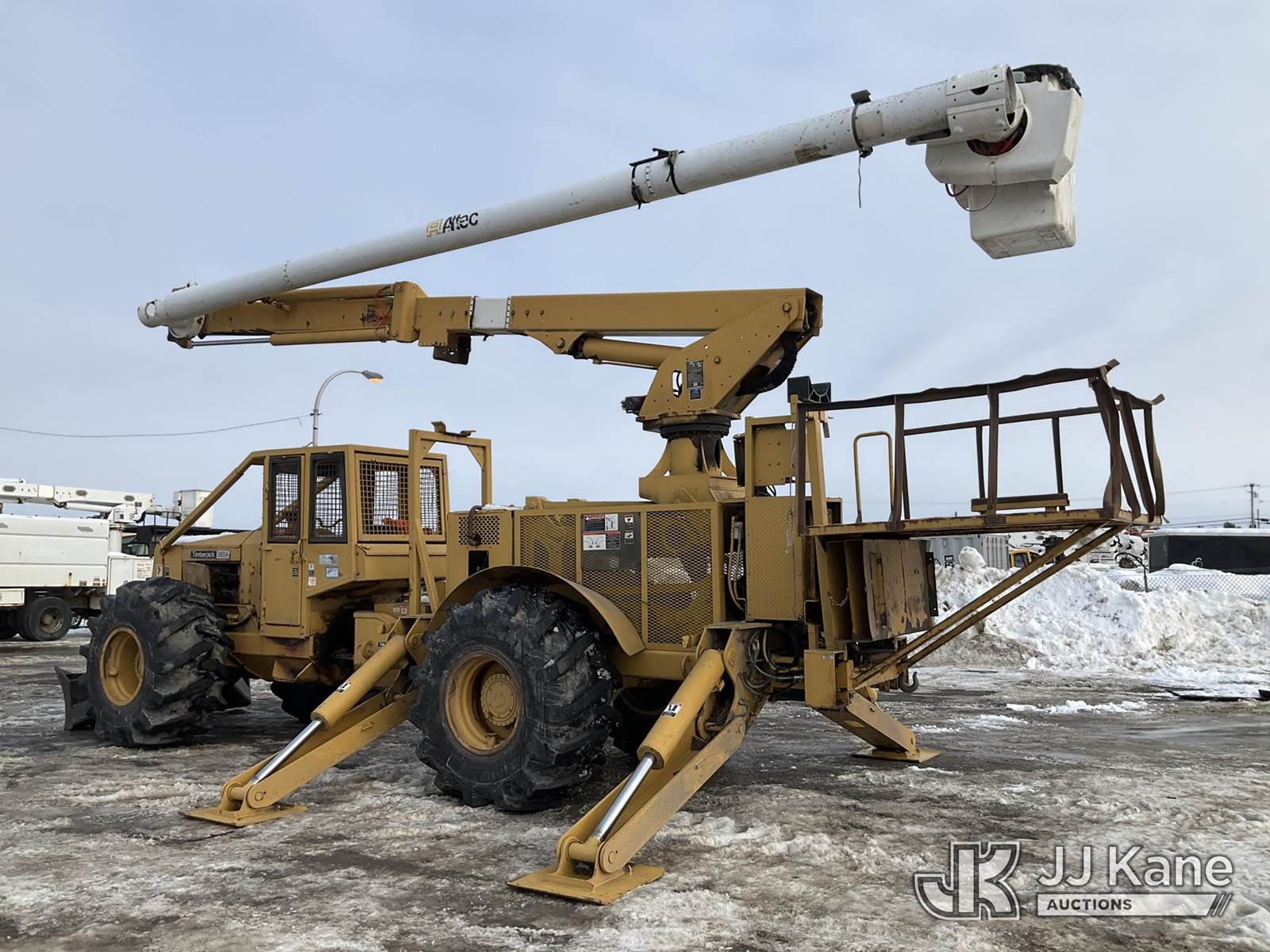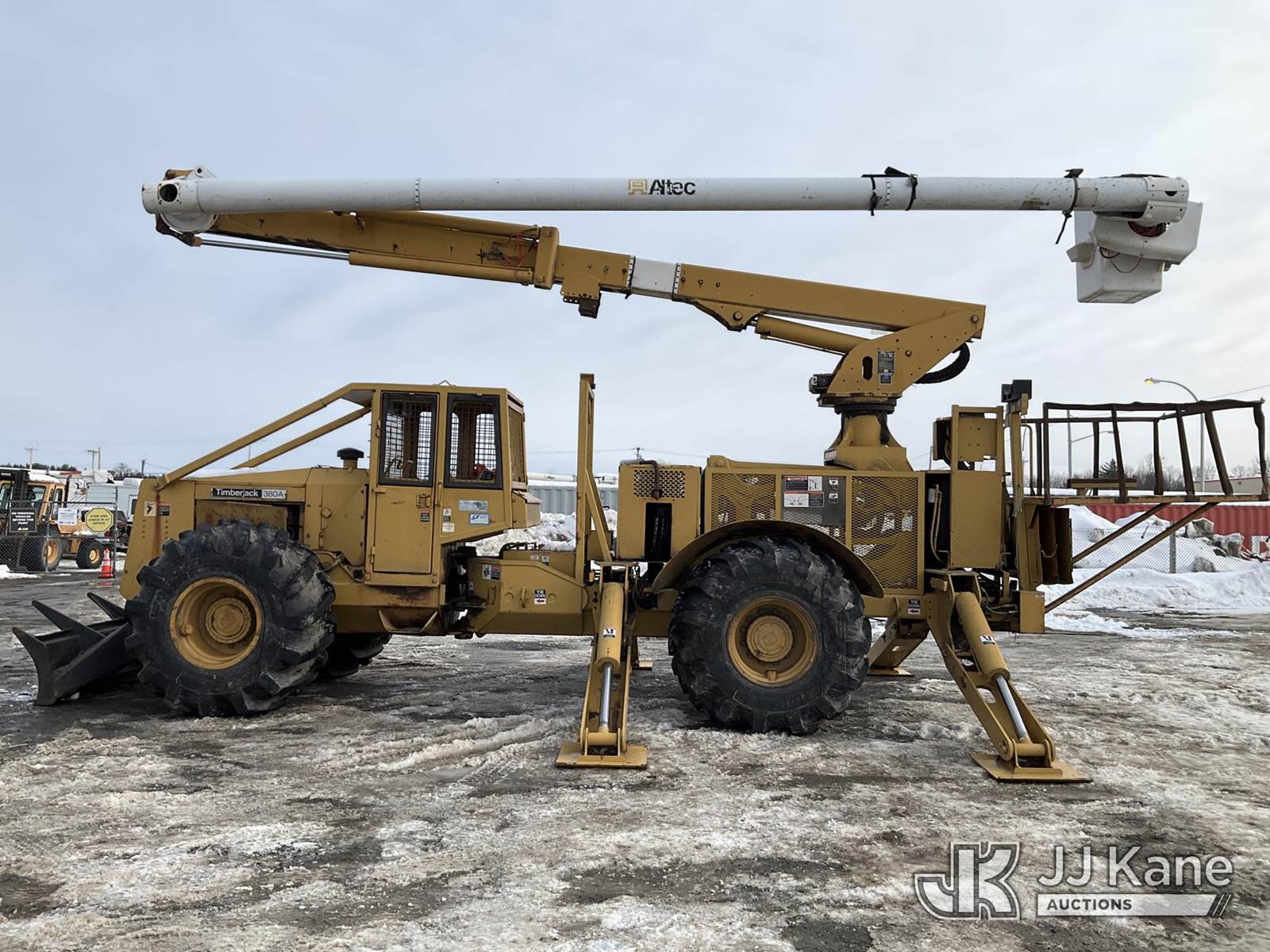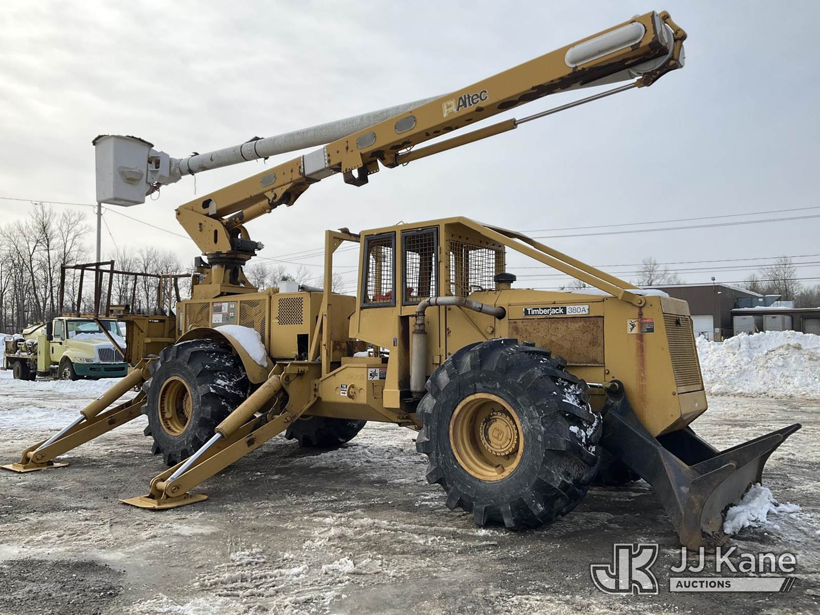 Altec LRV60, 75 ft, Elevator Bucket Truck s/n 0409CV8424 (2009), with Single Man Bucket & 4 Outriggers, rear mounted on 1986 Timberjack 380 s/n 356235, Cummins diesel, direct drive, with Rear winch, (Runs, Moves & Operates ) (Reads 3,325 hours) NOTE: This unit is being sold AS IS/WHERE IS via Timed Auction and is located in Rome, NY. Inspection & preview days for this unit are the 2 business days prior to the first day of items closing for this auction, item is located at 5835 Success Dr Rome, NY 13440 and hours of operations are 8a-4p. For pre-sale questions, please contact Ryan Jackson @ (315) 749-3790 or Ryan.Jackson@jjkane.com. (Missing manuals, See Auction Company for Manufacturers Information to obtain manuals) (Buyer is responsible for removal. Assistance by consignor or JJ Kane Auctions is not assured.)