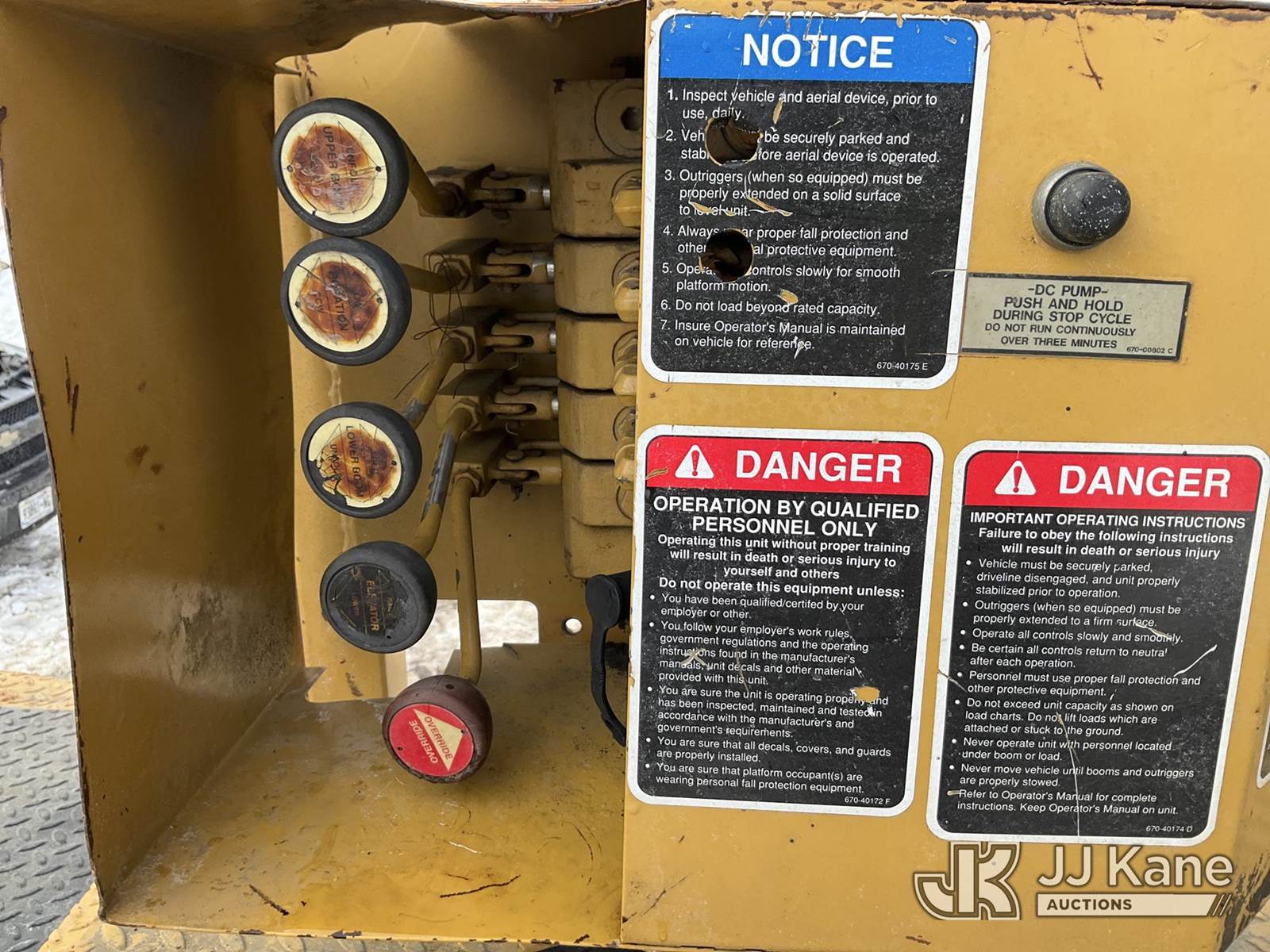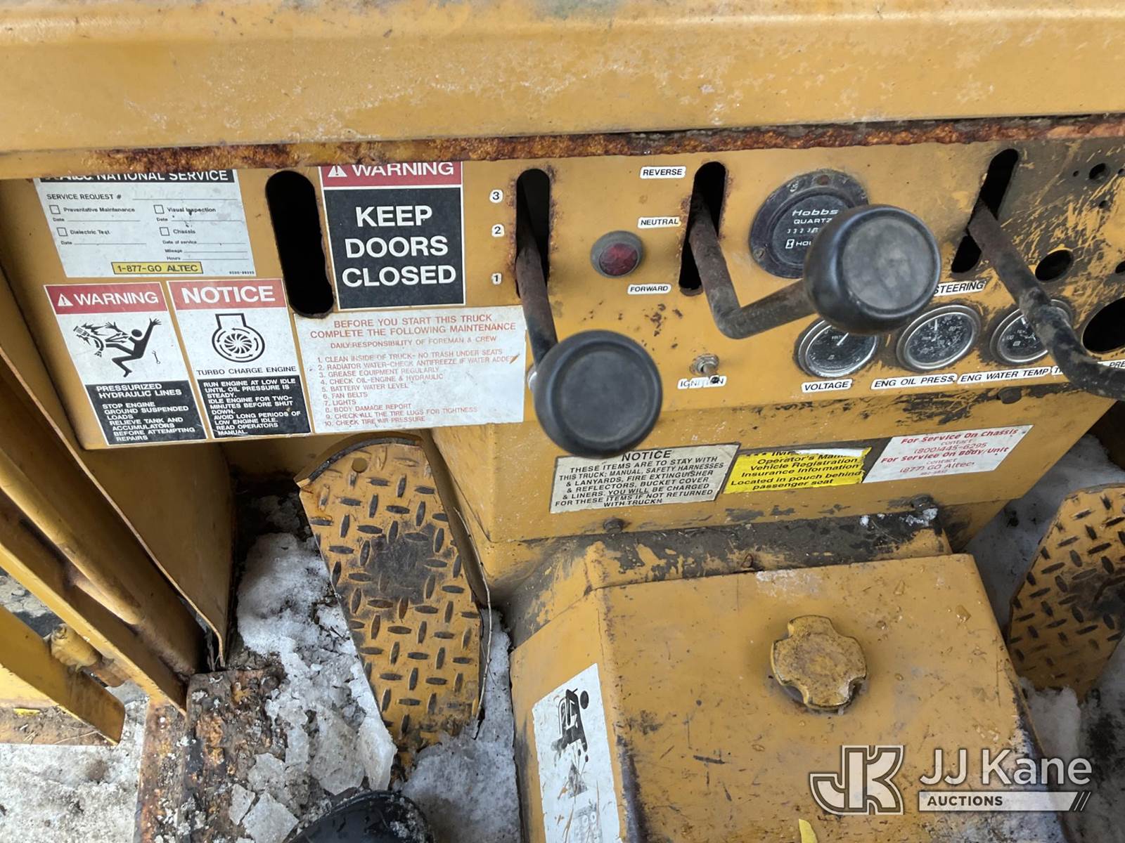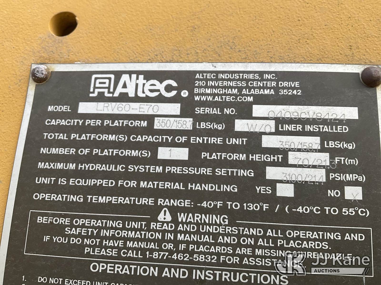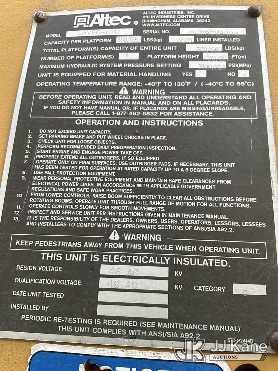 Altec LRV60, 75 ft, Elevator Bucket Truck s/n 0409CV8424 (2009), with Single Man Bucket & 4 Outriggers, rear mounted on 1986 Timberjack 380 s/n 356235, Cummins diesel, direct drive, with Rear winch, (Runs, Moves & Operates ) (Reads 3,325 hours) NOTE: This unit is being sold AS IS/WHERE IS via Timed Auction and is located in Rome, NY. Inspection & preview days for this unit are the 2 business days prior to the first day of items closing for this auction, item is located at 5835 Success Dr Rome, NY 13440 and hours of operations are 8a-4p. For pre-sale questions, please contact Ryan Jackson @ (315) 749-3790 or Ryan.Jackson@jjkane.com. (Missing manuals, See Auction Company for Manufacturers Information to obtain manuals) (Buyer is responsible for removal. Assistance by consignor or JJ Kane Auctions is not assured.)