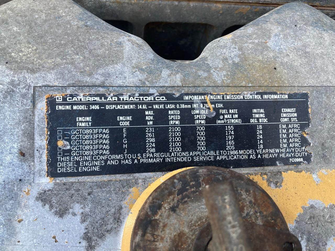 GOOD USED, 1986 CATERPILLAR 3406B-DITA DIESEL TAKEOUT ENGINE FOR SALE at ADELMAN’S TRUCK PARTS in CANTON, OHIO. RUN TESTED and COMPLETE, 4W3773 ARRANGEMENT #, DIRECT INJECTION, TURBOCHARGED, WATER AFTERCOOLED, and JAKE BRAKES, with 60+ LBS OIL PRESSURE.