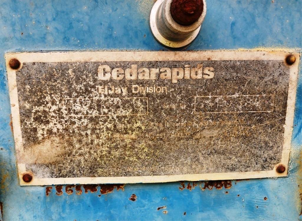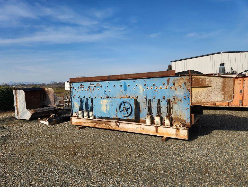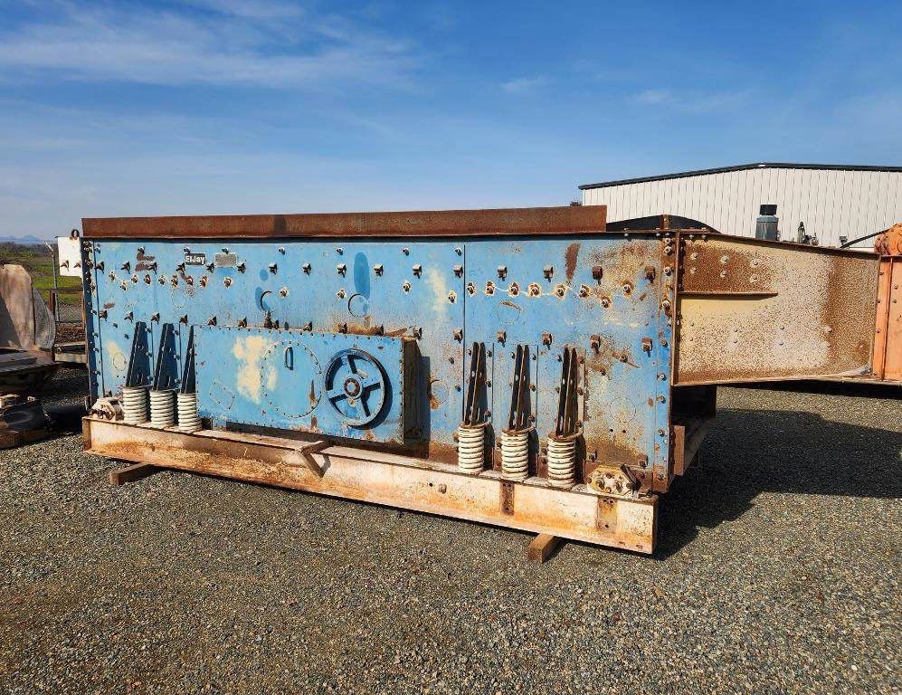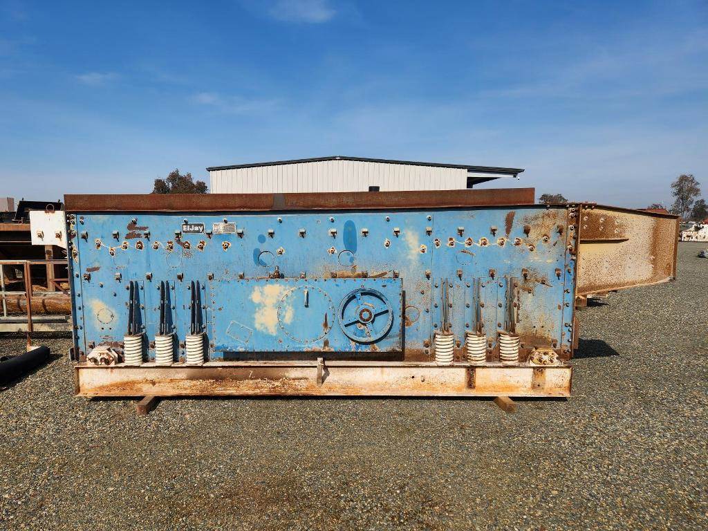 (1) – one - El Jay 5’ wide x 16’ long 3 deck Horizontal Vibrating Screen, single crown screen decks with side tension rails; bolt on feed box with liners; three shaft-six roller bearing oil bath lubricated gear driven vibrator assembly; driven sheave; steel coil isolation springs; friction check assemblies at each corner; steel sub base; 39” long bolt on screen discharge chute with side & bottom steel liners for overs from decks #1 & #2, narrows down to 51” wide, used for direct crusher feed; Screen media: Top deck has 3” round steel punched plate, 2nd deck has 7/8” square wire mesh, 3rd deck has 5/16” Z-Slot wire mesh installed; bolt on electric motor mount. Weight: 22,000 lbs; Date of Mfr. 1988; Model FSG5163326; S/N 34F0388. Designed for 30 h.p. 1800 rpm electric motor with V-belt drive. (Motor & drive not included).