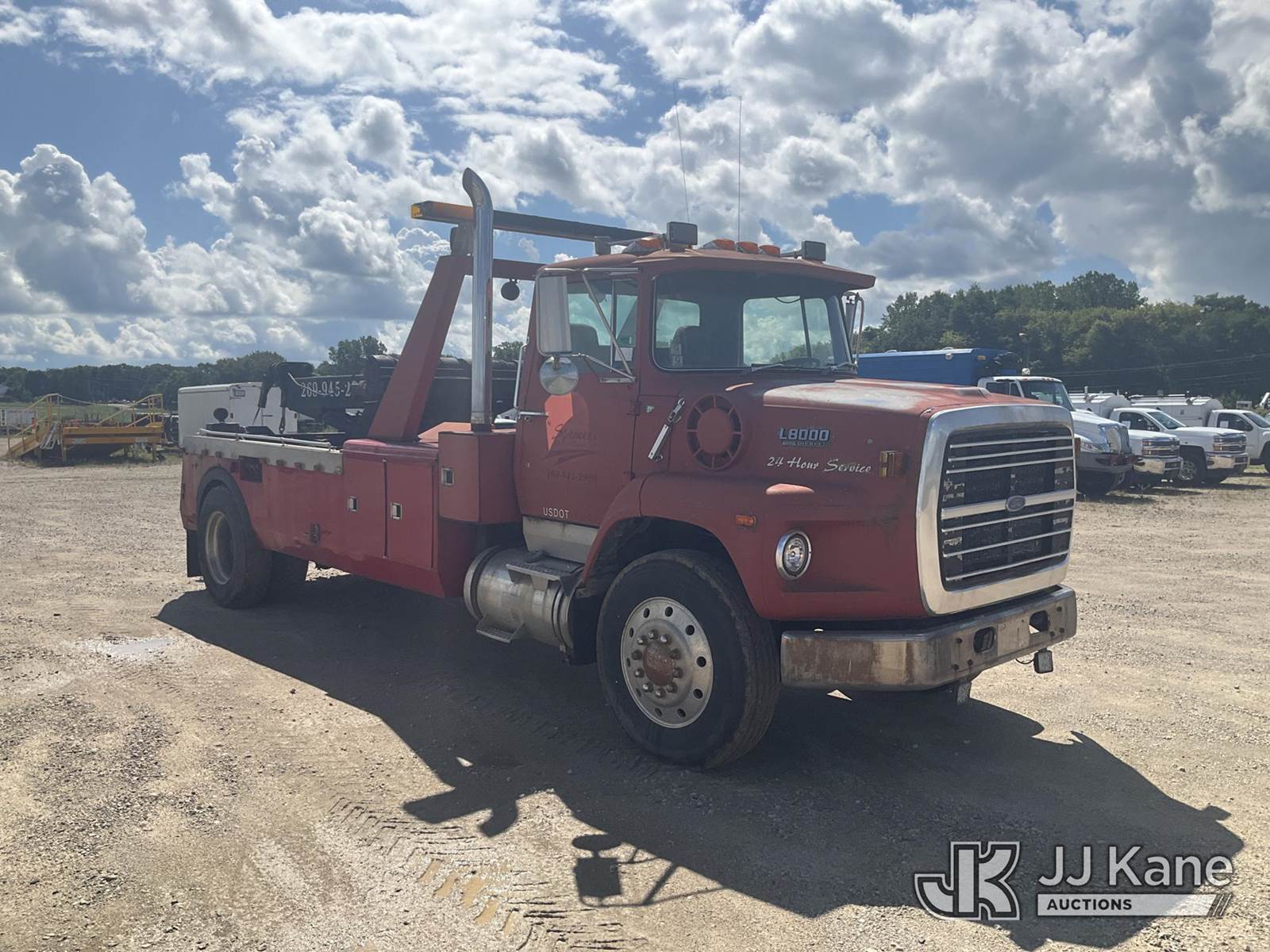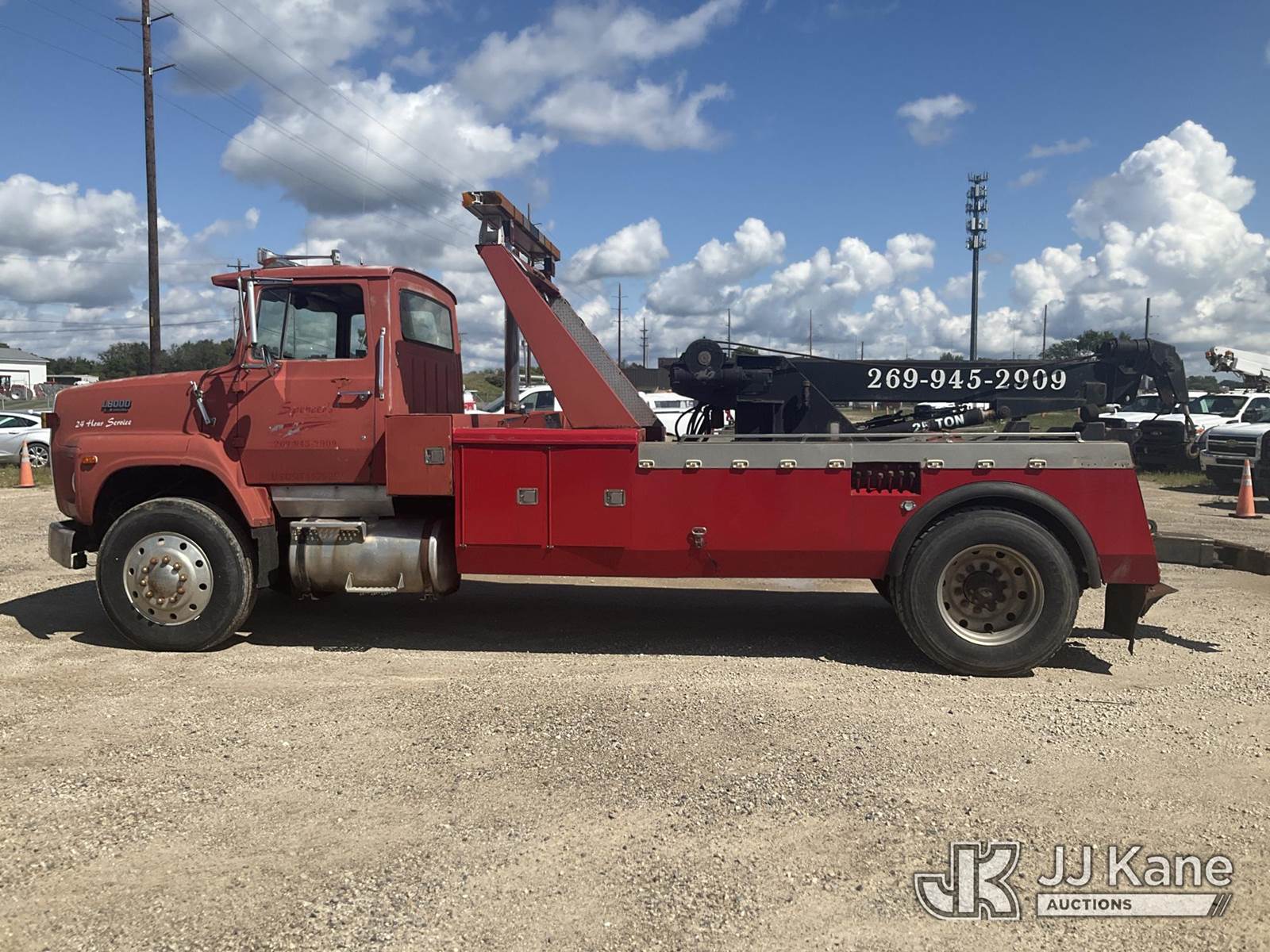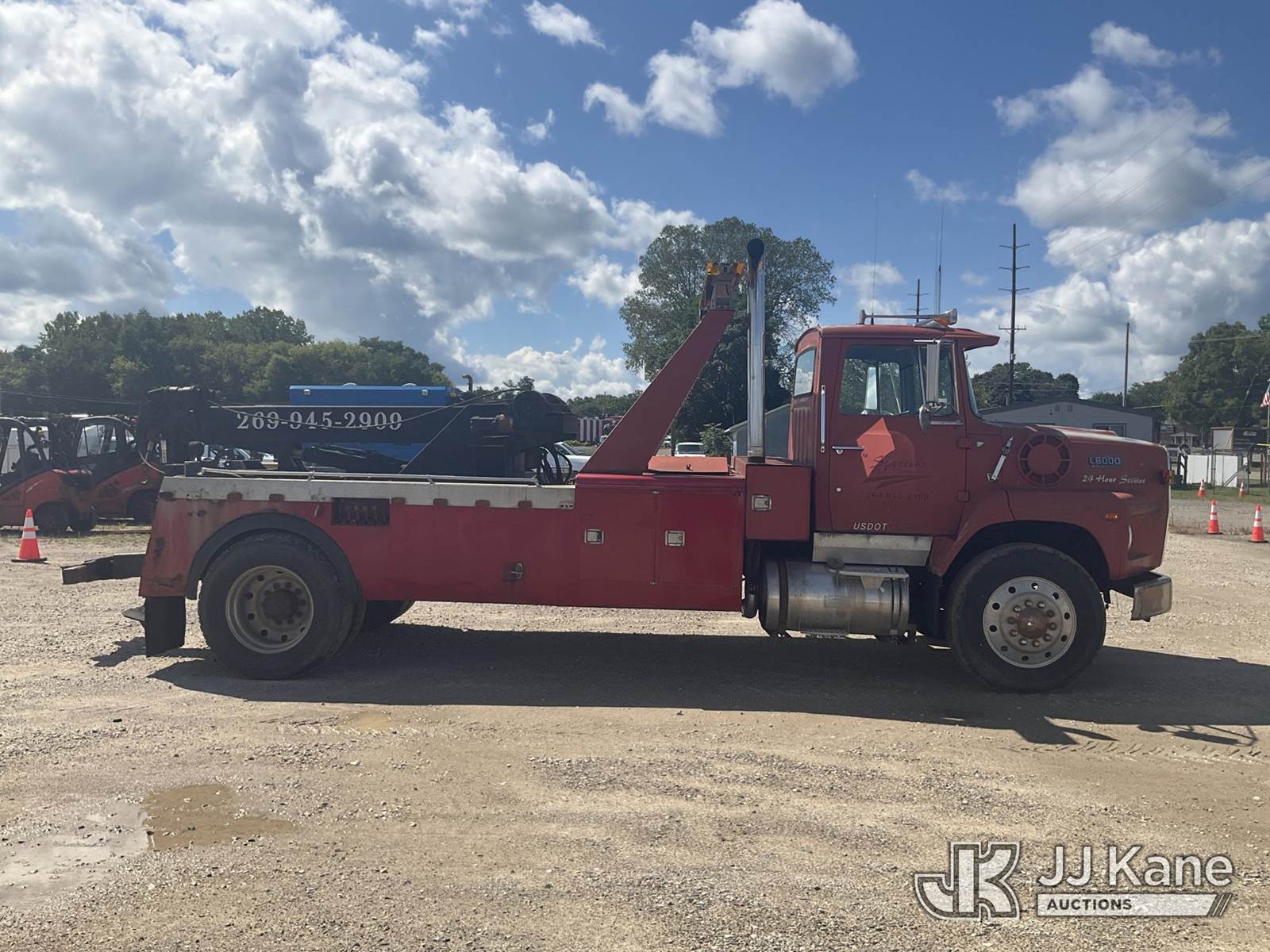 1988 Ford LS8000F Tow/Wrecker Truck, 7.8L L6 TURBO DIESEL 13-spd, 4X2, diesel, with 25 ton wrecker capacity, (Exempt from Odometer Disclosure - Reads 461,095 miles) (Runs & Moves) (Rust, Right Rear Tire Has a Split) (Seller States: Wrecker is Fully Functional, Needs Lighting Work, Right Stabilizer Weeping Hydraulic Fluid ) This is a Titled Item NOTE: This unit is being sold AS IS/WHERE IS via Timed Auction and is located in Charlotte, MI. Inspection & preview days for this unit are the 2 business days prior to the first day of items closing for this auction, item is located at 750 Island Hwy Charlotte, MI 48813 and hours of operations are 8a-4p. For specific technical information or questions about this item, contact Corey Cook at (517) 983-0796 or corey.cook@jjkane.com (Monday through Friday 8:00 am to 4:00 pm EST). For load-out and pickup information, reference the hauler sheet sent out after purchase. These items are used and may contain defects that are not immediately detectable. Text descriptions and photos given are meant to be used as a guide only. The Buyer is responsible for inspecting the item before bidding. All information provided is believed to be correct but no warranty as such is either intended or implied. All items are sold AS IS - WHERE IS AND WITH ALL FAULTS AND DEFECTS THEREIN. (Buyer is responsible for removal. Assistance by consignor or JJ Kane Auctioneers is not assured.)