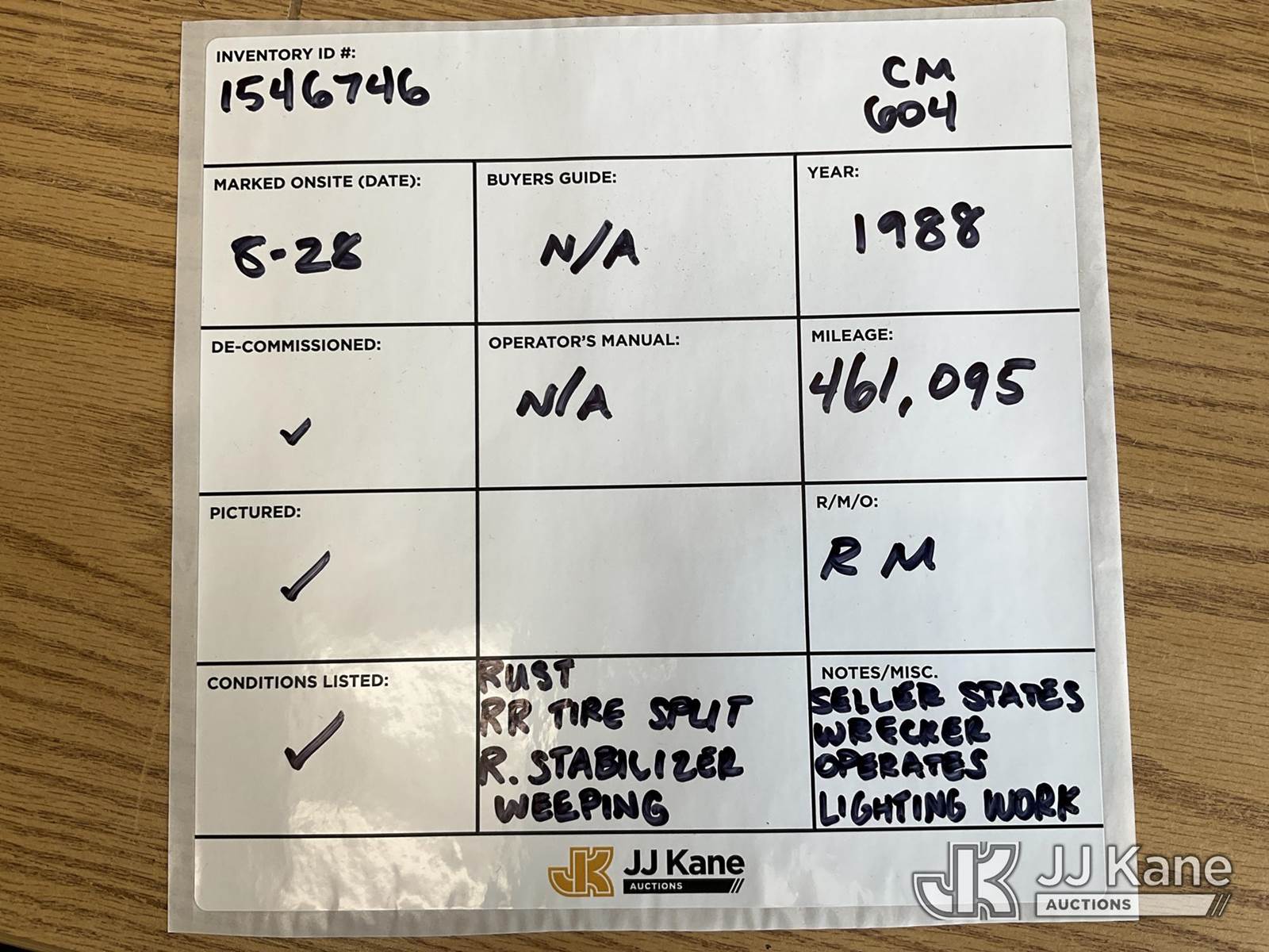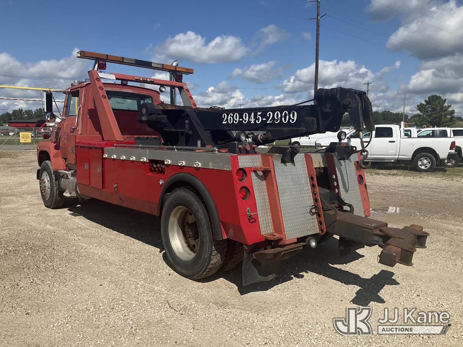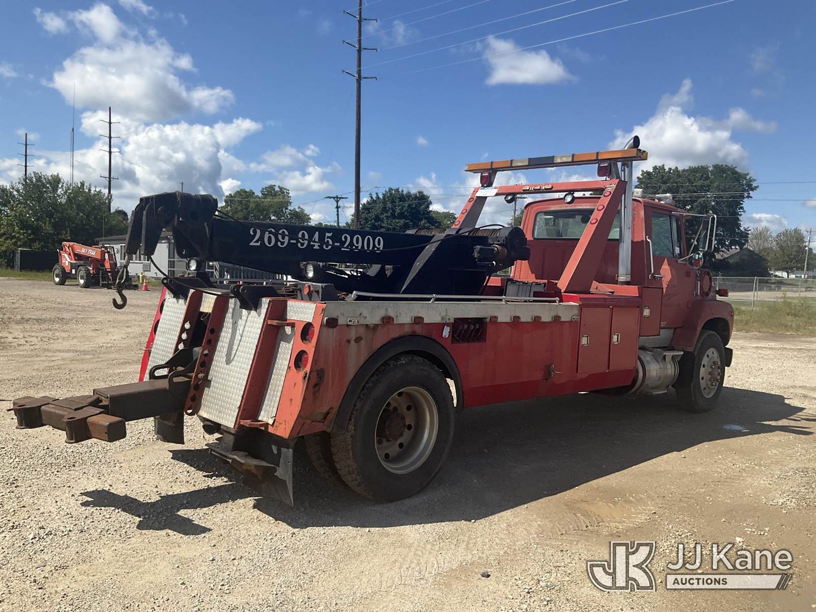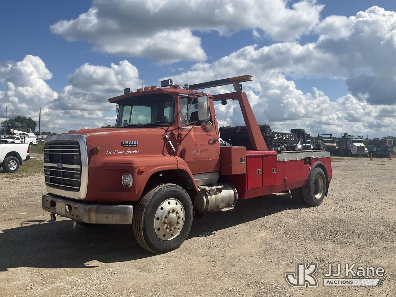 1988 Ford LS8000F Tow/Wrecker Truck, 7.8L L6 TURBO DIESEL 13-spd, 4X2, diesel, with 25 ton wrecker capacity, (Exempt from Odometer Disclosure - Reads 461,095 miles) (Runs & Moves) (Rust, Right Rear Tire Has a Split) (Seller States: Wrecker is Fully Functional, Needs Lighting Work, Right Stabilizer Weeping Hydraulic Fluid ) This is a Titled Item NOTE: This unit is being sold AS IS/WHERE IS via Timed Auction and is located in Charlotte, MI. Inspection & preview days for this unit are the 2 business days prior to the first day of items closing for this auction, item is located at 750 Island Hwy Charlotte, MI 48813 and hours of operations are 8a-4p. For specific technical information or questions about this item, contact Corey Cook at (517) 983-0796 or corey.cook@jjkane.com (Monday through Friday 8:00 am to 4:00 pm EST). For load-out and pickup information, reference the hauler sheet sent out after purchase. These items are used and may contain defects that are not immediately detectable. Text descriptions and photos given are meant to be used as a guide only. The Buyer is responsible for inspecting the item before bidding. All information provided is believed to be correct but no warranty as such is either intended or implied. All items are sold AS IS - WHERE IS AND WITH ALL FAULTS AND DEFECTS THEREIN. (Buyer is responsible for removal. Assistance by consignor or JJ Kane Auctioneers is not assured.)