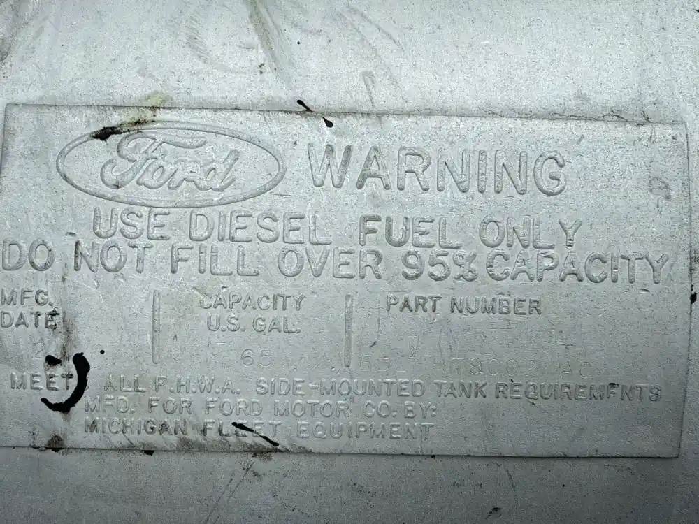 (Used) 1988 Ford LTL9000, FUEL TANK- Part Number: EDEIHT9002AC, Side: Passenger Right Side, Capacity: 65 Gallons Disal, Material: Aluminum, Shape: Cylinder, Dimensions: L=51.5", D=19.5", Reference images for Condition For more information about this item, give us a call. We ship Worldwide! (CRG HEAVY TRUCK PARTS) 929 W PULASKI HWY ELKTON, MD 21921, Capacity: 65, Dimensions: L=51.5", D=19.5",, Material: Aluminum, Shape: Cylinder