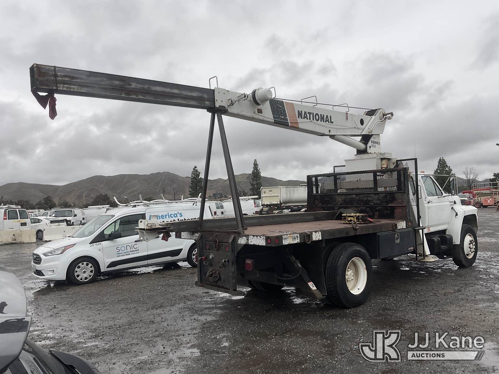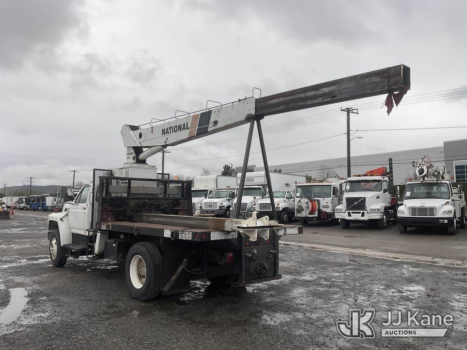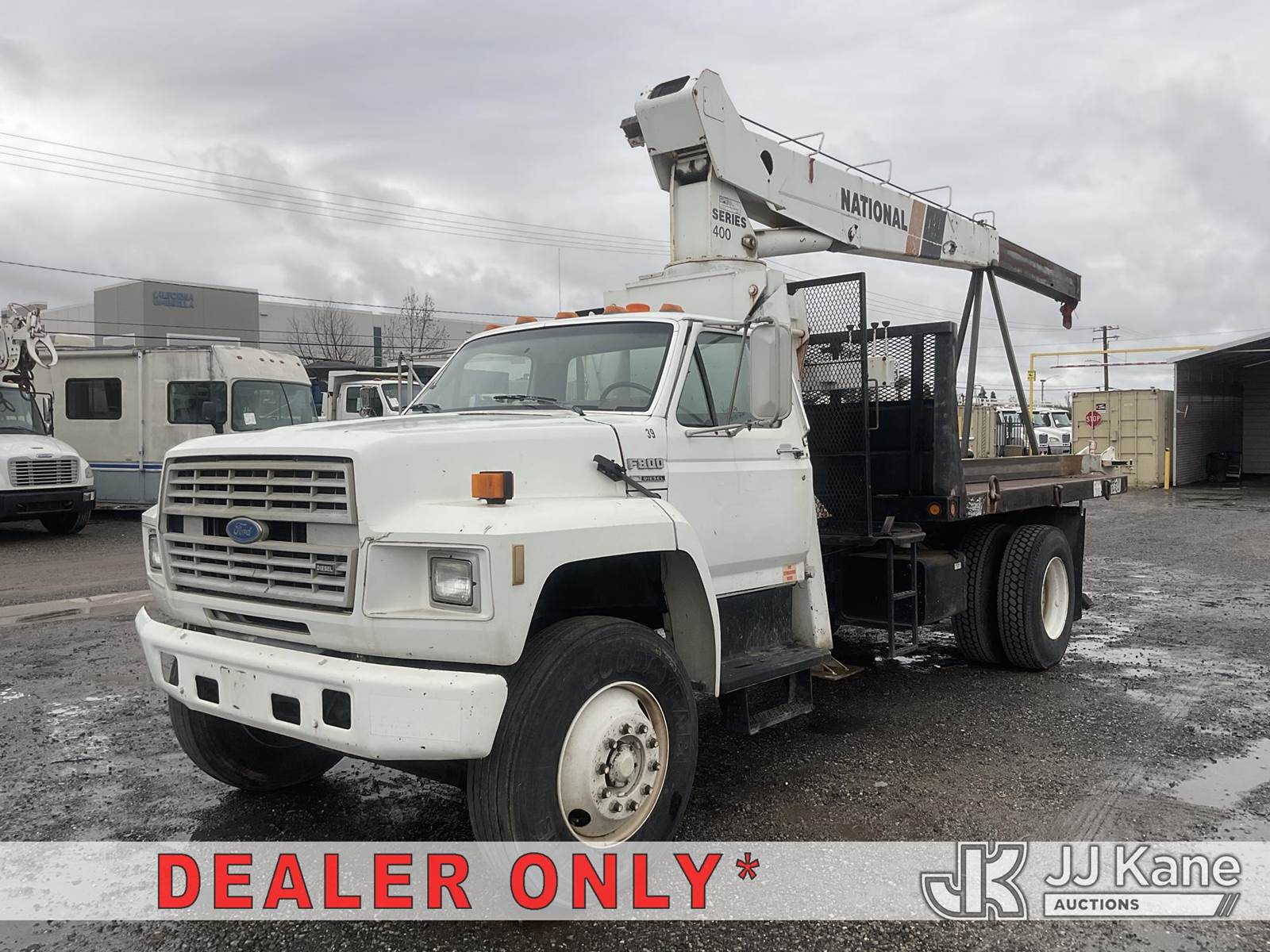 National 437, 16,000 Lb 47 ft, Hydraulic Crane s/n 19618, with 47' sheave height, 3 section hyd boom, anti-two block, heel winch & dual controls, mounted behind cab on 1988 Ford F800F Flatbed Truck, s/n 1FDXK84A0JVA44851, 7.8L L6 4X2, diesel, 6-spd, with 12FT Flatbed, Tow Package, (Exempt from Odometer Disclosure - Reads 21,582 miles) (Runs & Moves) (The Crane Has Been Disassembled, DO NOT OPERATE CRANE, No Manual) (Bidding Restricted to Licensed Vehicle Dealers Only), Subject to CARB Regs,CARB non Compliant,Cannot Operate on CA Roads/Highways until Compliant This is a Titled Item NOTE: This unit is being sold AS IS/WHERE IS via Timed Auction and is located in Jurupa Valley, CA. Inspection & preview days for this unit are the 2 business days prior to the first day of items closing for this auction, item is located at 4510 Muth Way Jurupa Valley, CA 92509 and hours of operations are 8a-4p. For pre-sale questions, please contact please contact Office Staff @ (310) 353-7140. Dealer License Number 45696. (Missing manuals, See Auction Company for Manufacturers Information to obtain manuals) (Buyer is responsible for removal. Assistance by consignor or JJ Kane Auctions is not assured.)
