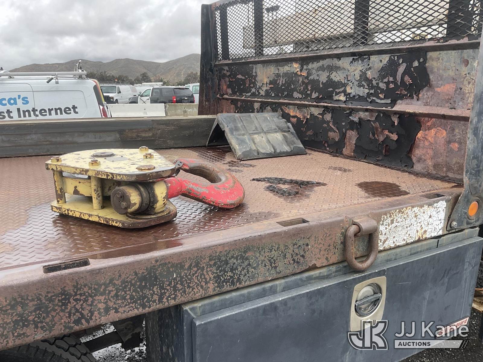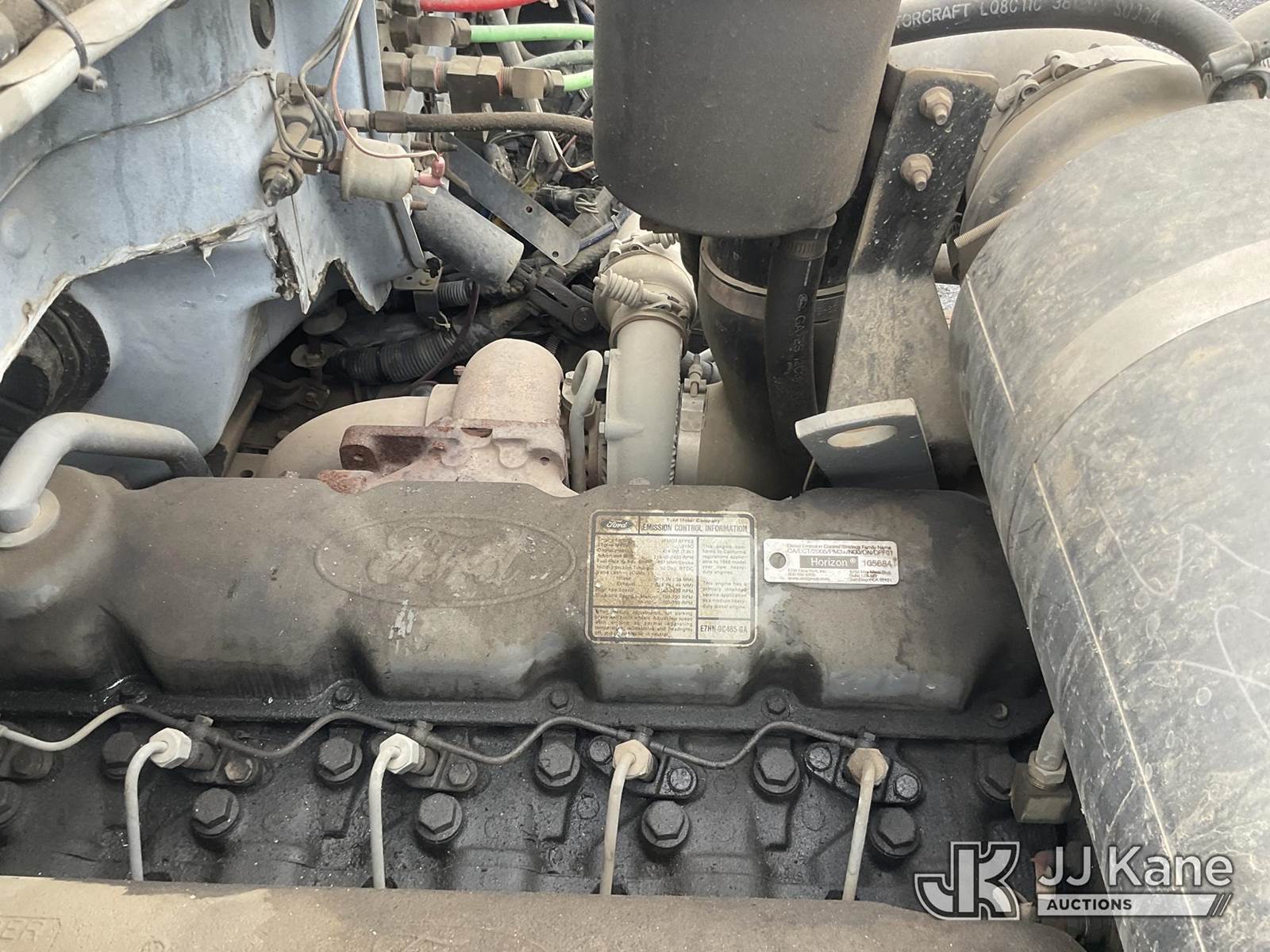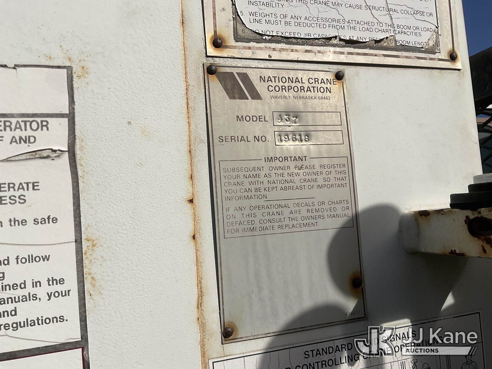 National 437, 16,000 Lb 47 ft, Hydraulic Crane s/n 19618, with 47' sheave height, 3 section hyd boom, anti-two block, heel winch & dual controls, mounted behind cab on 1988 Ford F800F Flatbed Truck, s/n 1FDXK84A0JVA44851, 7.8L L6 4X2, diesel, 6-spd, with 12FT Flatbed, Tow Package, (Exempt from Odometer Disclosure - Reads 21,582 miles) (Runs & Moves) (The Crane Has Been Disassembled, DO NOT OPERATE CRANE, No Manual) (Bidding Restricted to Licensed Vehicle Dealers Only), Subject to CARB Regs,CARB non Compliant,Cannot Operate on CA Roads/Highways until Compliant This is a Titled Item NOTE: This unit is being sold AS IS/WHERE IS via Timed Auction and is located in Jurupa Valley, CA. Inspection & preview days for this unit are the 2 business days prior to the first day of items closing for this auction, item is located at 4510 Muth Way Jurupa Valley, CA 92509 and hours of operations are 8a-4p. For pre-sale questions, please contact please contact Office Staff @ (310) 353-7140. Dealer License Number 45696. (Missing manuals, See Auction Company for Manufacturers Information to obtain manuals) (Buyer is responsible for removal. Assistance by consignor or JJ Kane Auctions is not assured.)