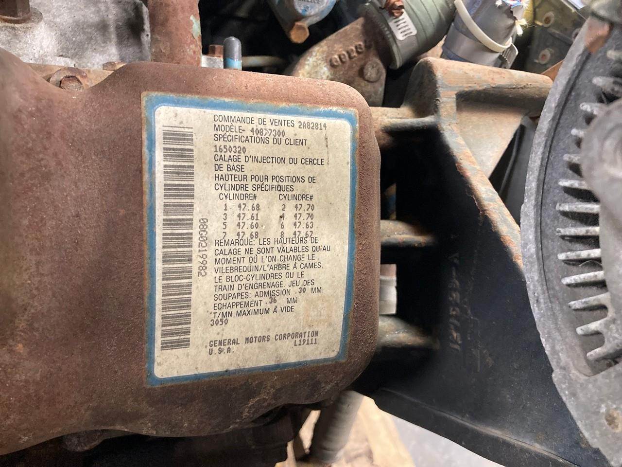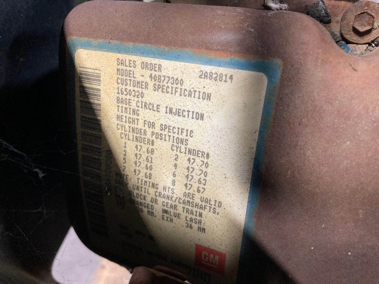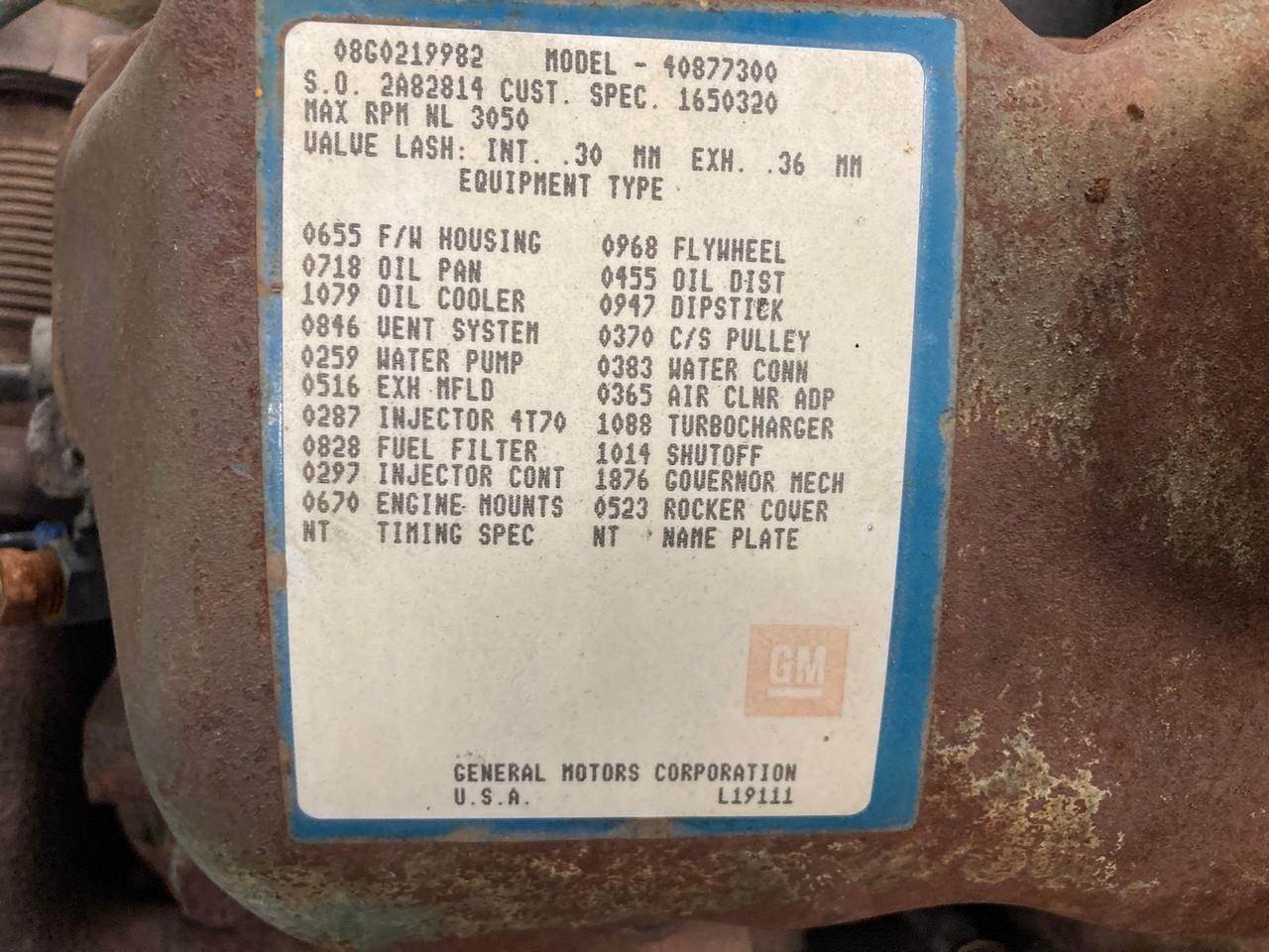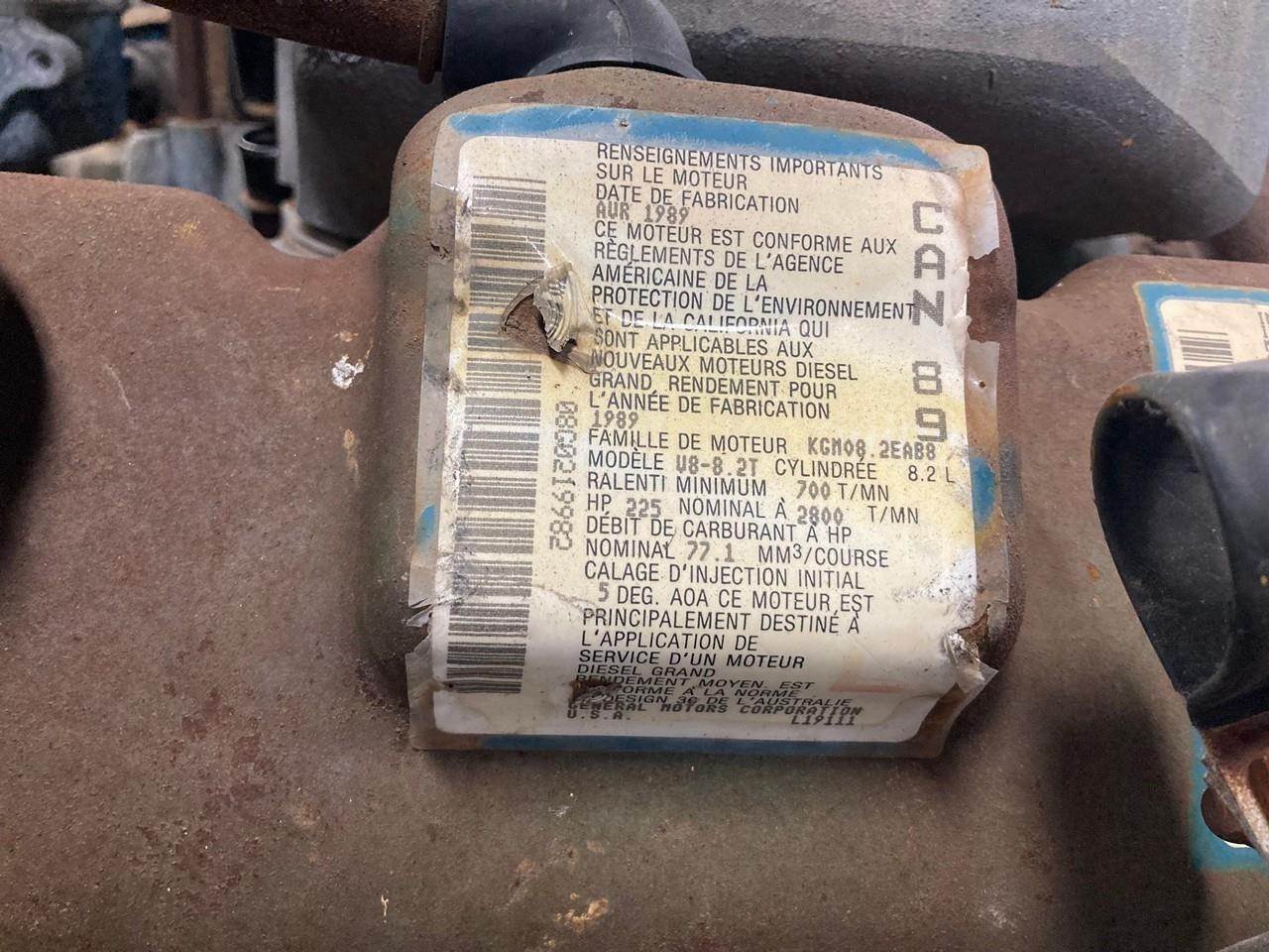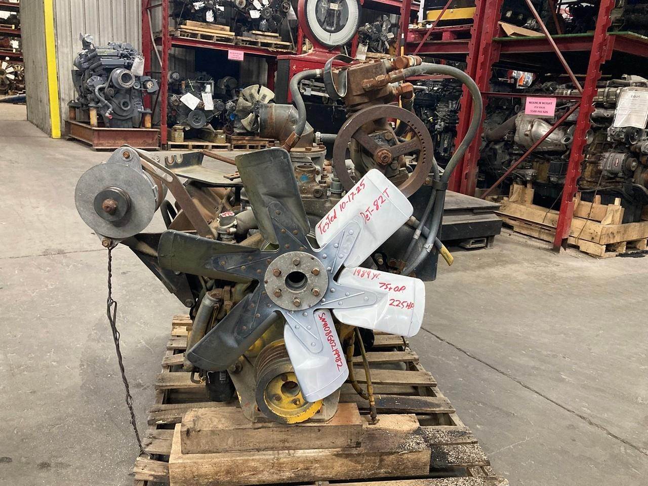 GOOD USED 1989 DETROIT DIESEL 8.2T TURBOCHARGED TAKEOUT ENGINE FOR SALE at ADELMAN’S TRUCK PARTS in CANTON, OHIO. RUN TESTED and COMPLETE with STARTER, V8, TURBOCHARGED, 225 HP @ 2800 RPM, 4087-7300 MODEL #, KGM08.2EAB8 FAMILY #, with 75+ LBS OIL PRESSURE.