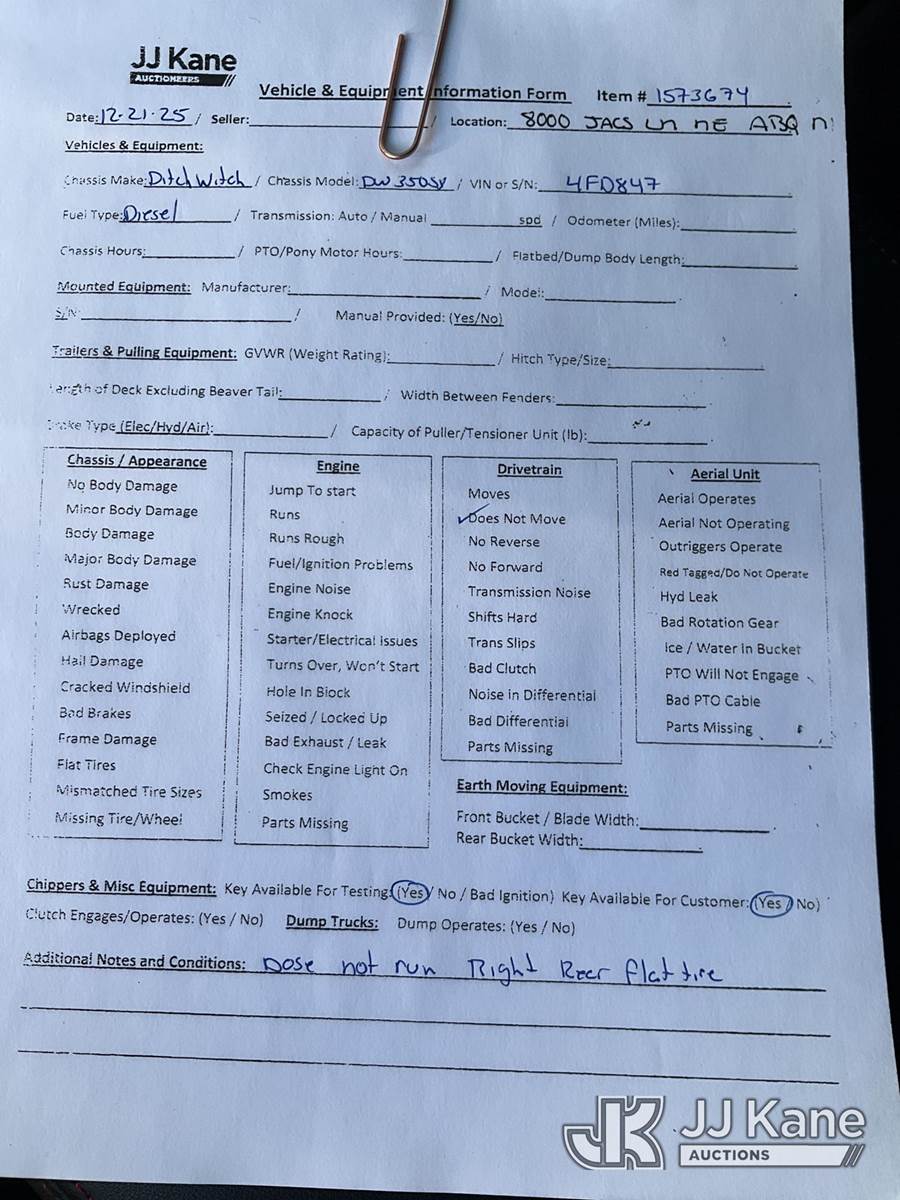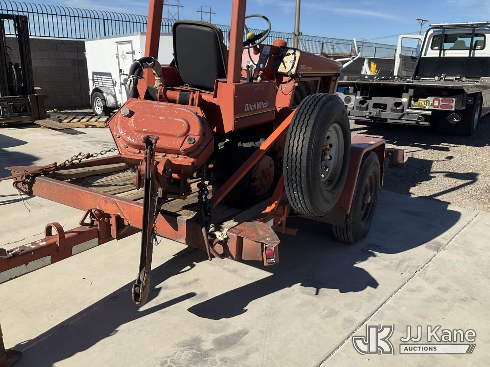 1989 Ditch Witch DW 350SX Rubber Tired Trencher, s/n 4FD847, Deutz diesel, with support trailer, VIN: 1DS0000BXK17F1788, Selling With Item ID 1573675.(Equipment & Trailer Price Will Be Split Out On Invoice To Reflect 80/20, Equipment To Trailer Price Ratio For Tax Purposes.) (Not Running, Condition Unknown, Flat Tire) NOTE: This unit is being sold AS IS/WHERE IS via Timed Auction and is located in Albuquerque, NM. Inspection & preview days for this unit are by appointment only; please contact us at contact@jjkane.com or 84-Go-JJKane for more details. (Buyer is responsible for removal. Assistance by consignor or JJ Kane Auctions is not assured.)