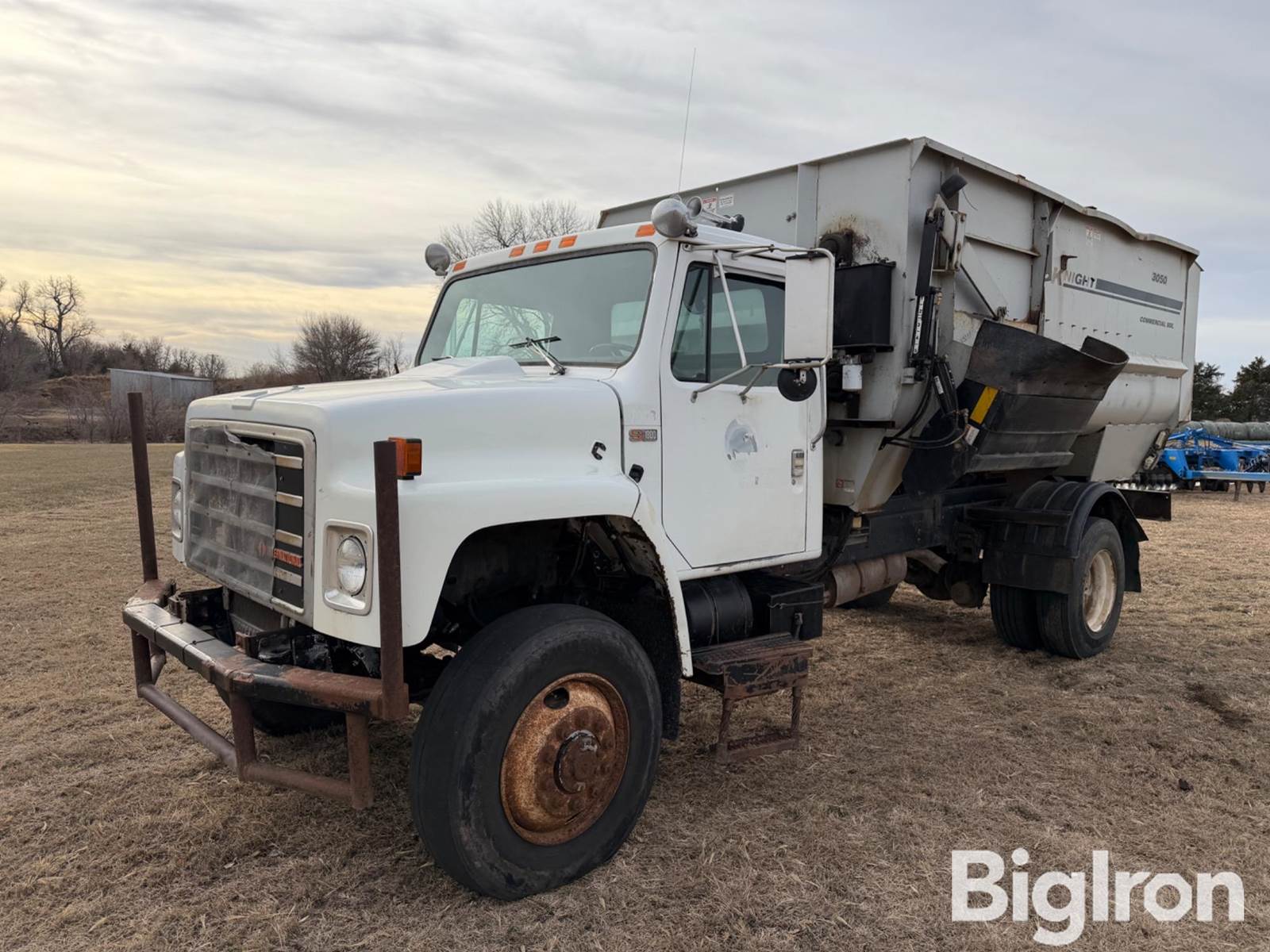 1989 International 1854 4x4 Feed Truck, 57,225 miles showing, Title Will Be Marked Miles Exempt, DT466 7.6L Turbo Diesel Engine, Block Heater, Automatic Transmission, Knight 3050 Feed Box, Commercial SDL, Hydraulic Trap Door, Hydraulic Spout, Rear Duals, In Cab Feed Bed Controller, 11R22.5 Tires, VIN: 1HTLFZZN1KH605635