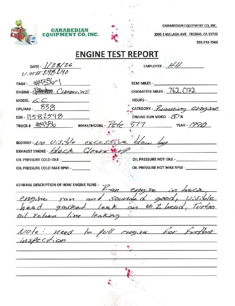 Cummins Big Cam IV NTC-315(88NT), CPL-8380, S/N- 11582598, 762,076 ODO Miles. (Please see video of engine running and test report)