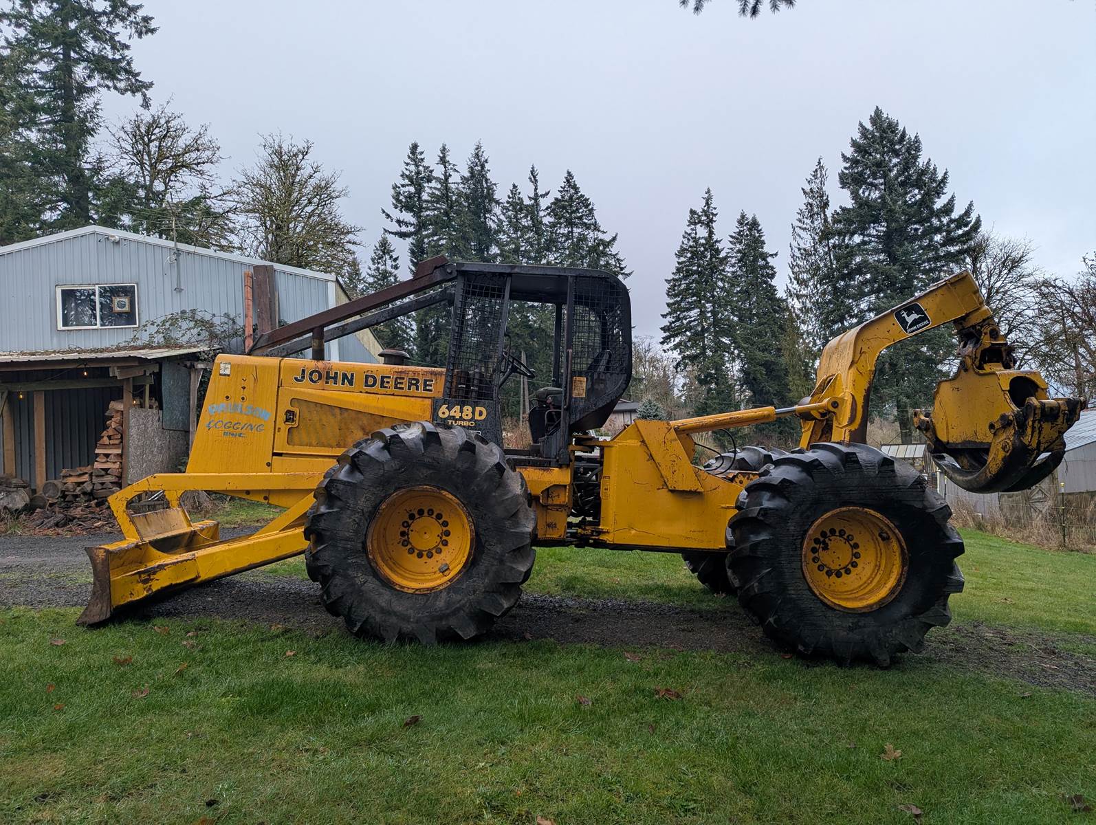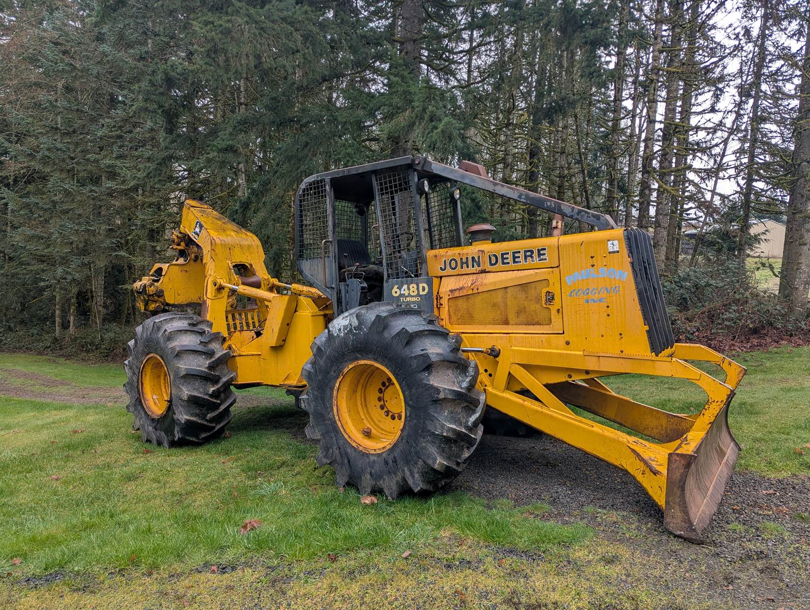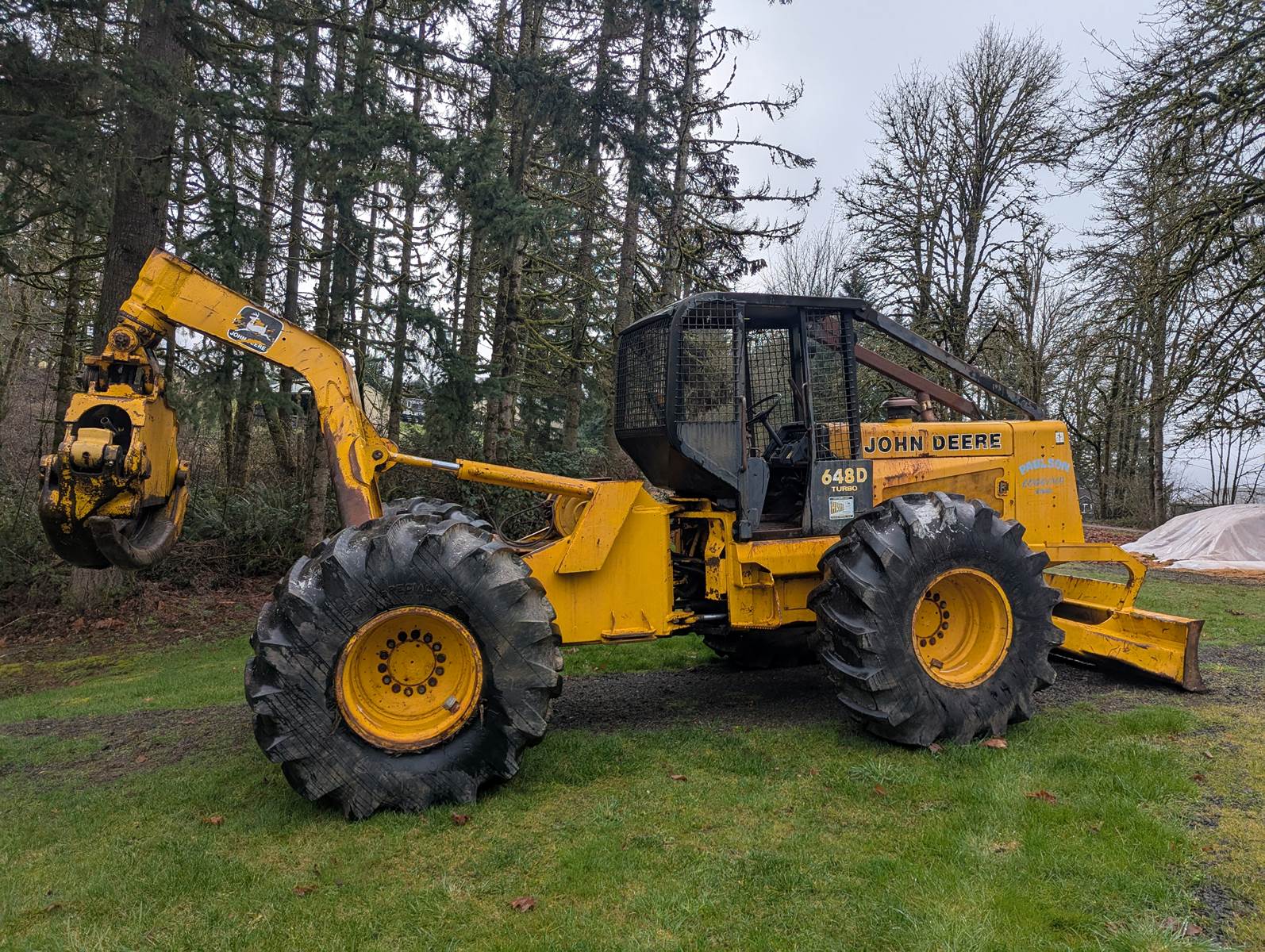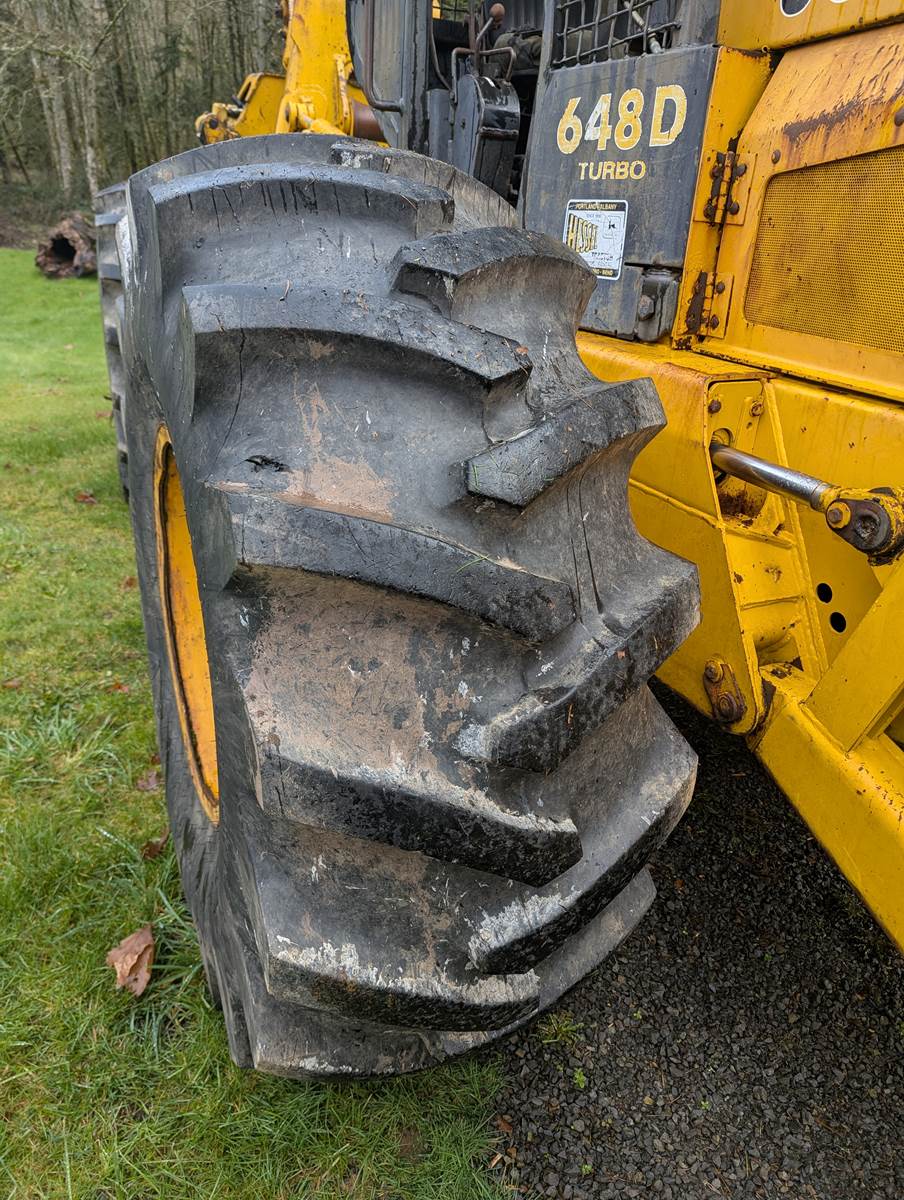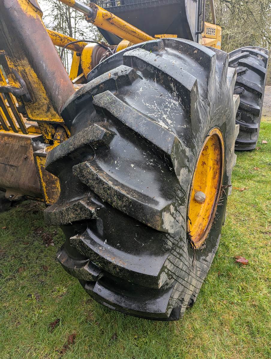 1990 John Deere 648D skidder with full rotating grapple. We bought this skidder in 1993 and only used occasionally, it's been a good sound machine very few problems. Always starts right up. It comes with tire chains which has only been on once. Tires are like new. I ran over a paint can which is the white on the tires. I don't think the hour meter is working.