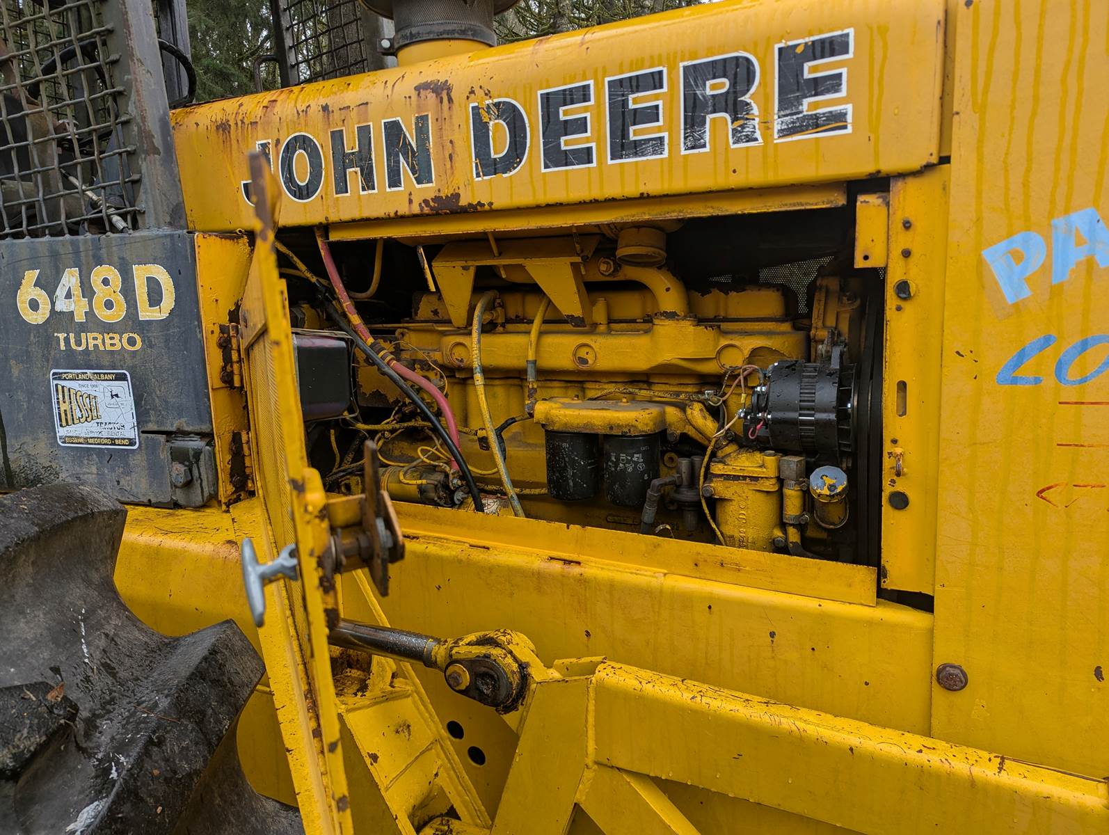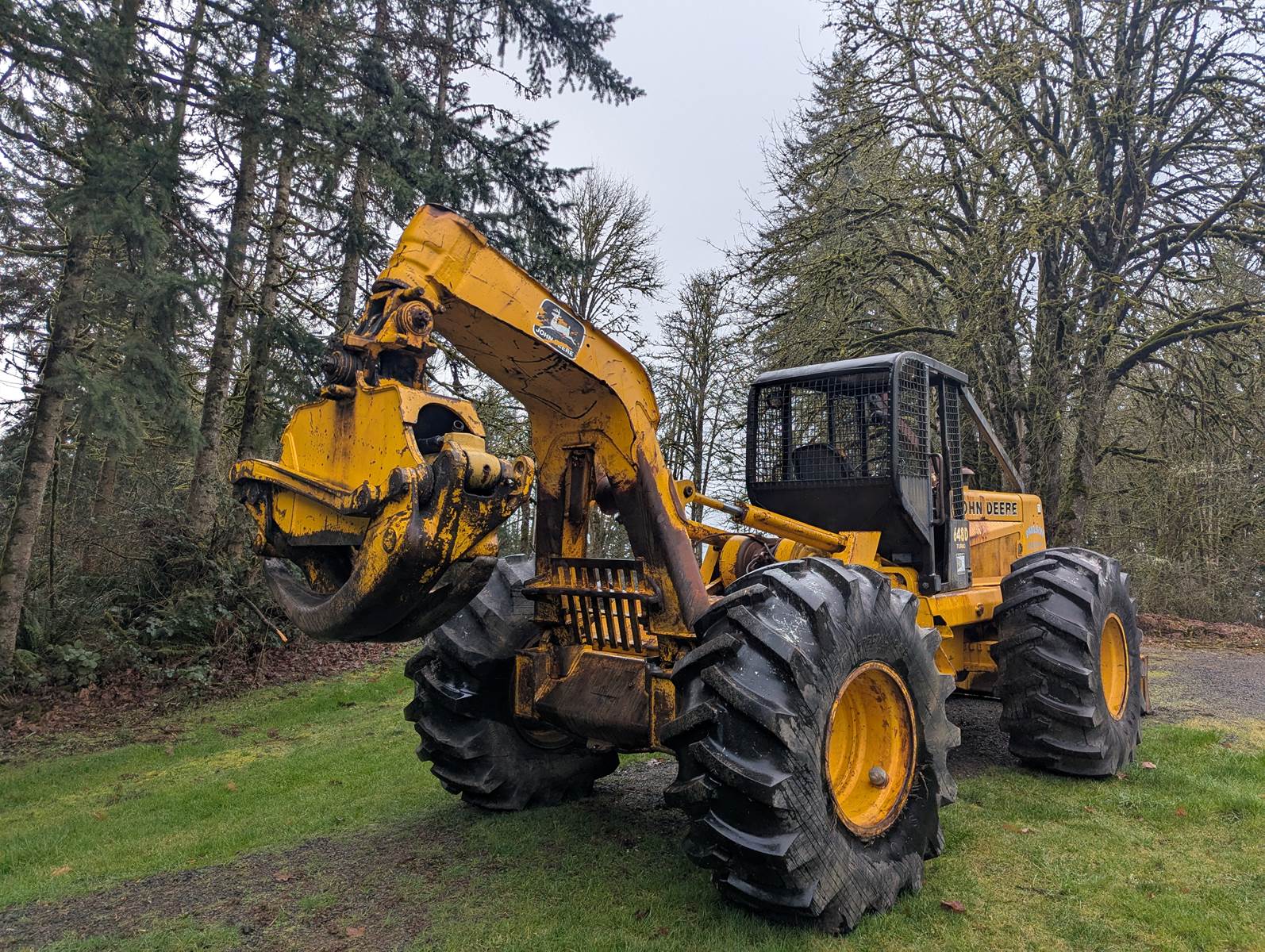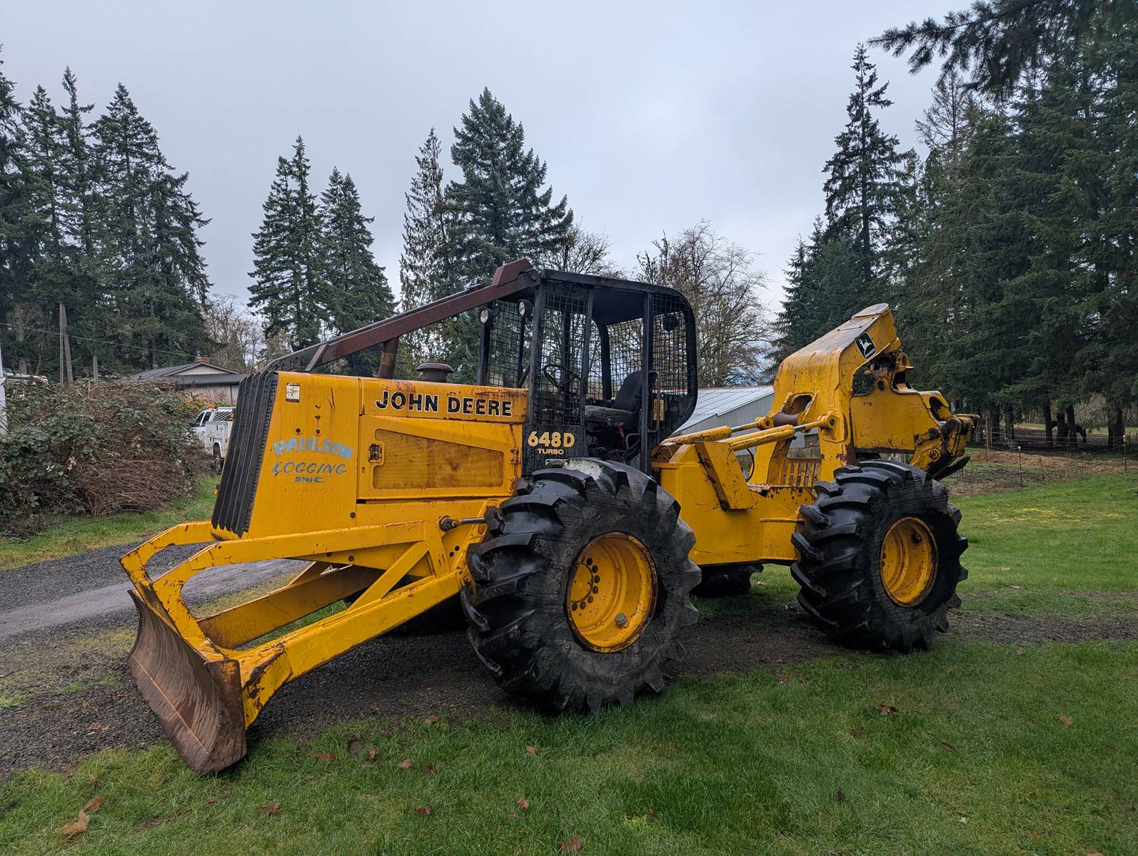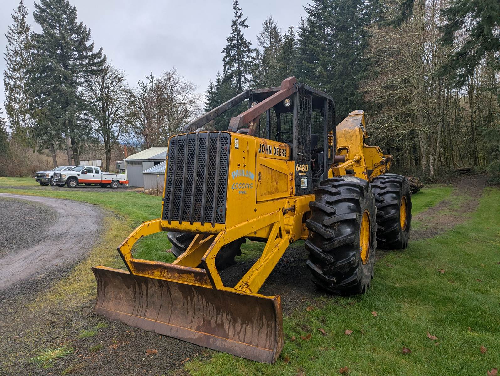 1990 John Deere 648D skidder with full rotating grapple. We bought this skidder in 1993 and only used occasionally, it's been a good sound machine very few problems. Always starts right up. It comes with tire chains which has only been on once. Tires are like new. I ran over a paint can which is the white on the tires. I don't think the hour meter is working.
