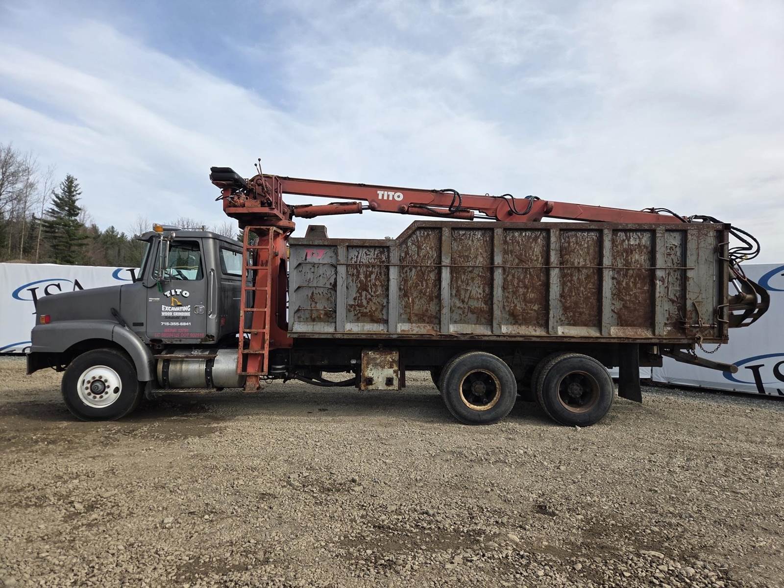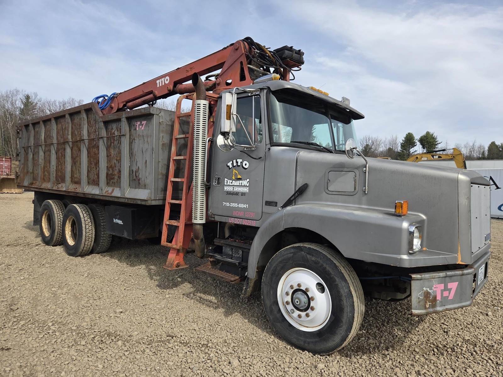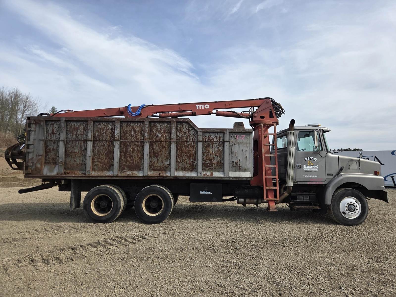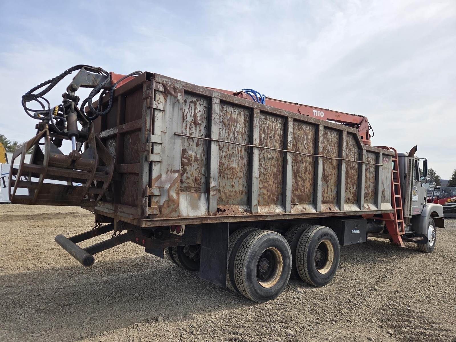 Detroit Diesel Series 60 Turbo Diesel Engine, Eaton Fuller 13 Speed Manual Transmission, Full Lockers, PTO, Engine Braking, Spring Ride Suspension, Double Frame, Outriggers, Approx. 20' Box, Tito Crane, Butt Grapple, Day Cab, Air Ride Driver Seat, Heat, AC, Radio, 11R22.5 Tires