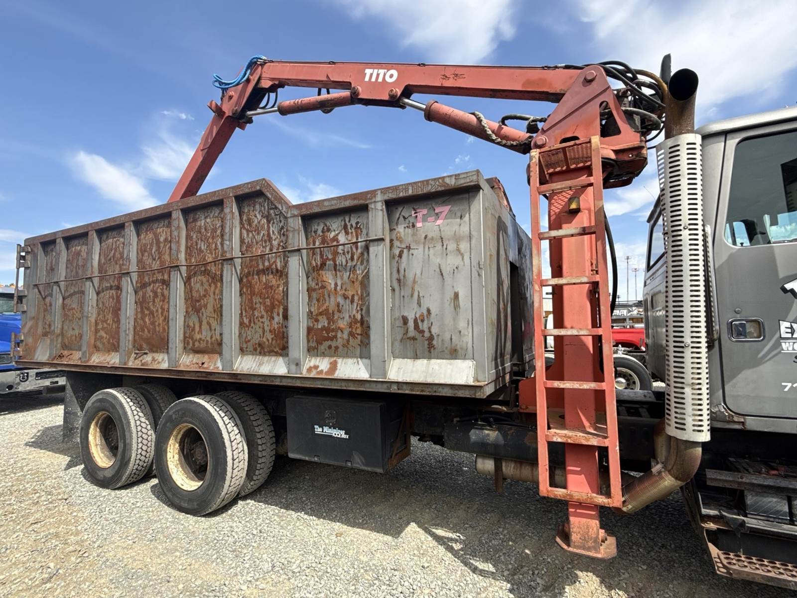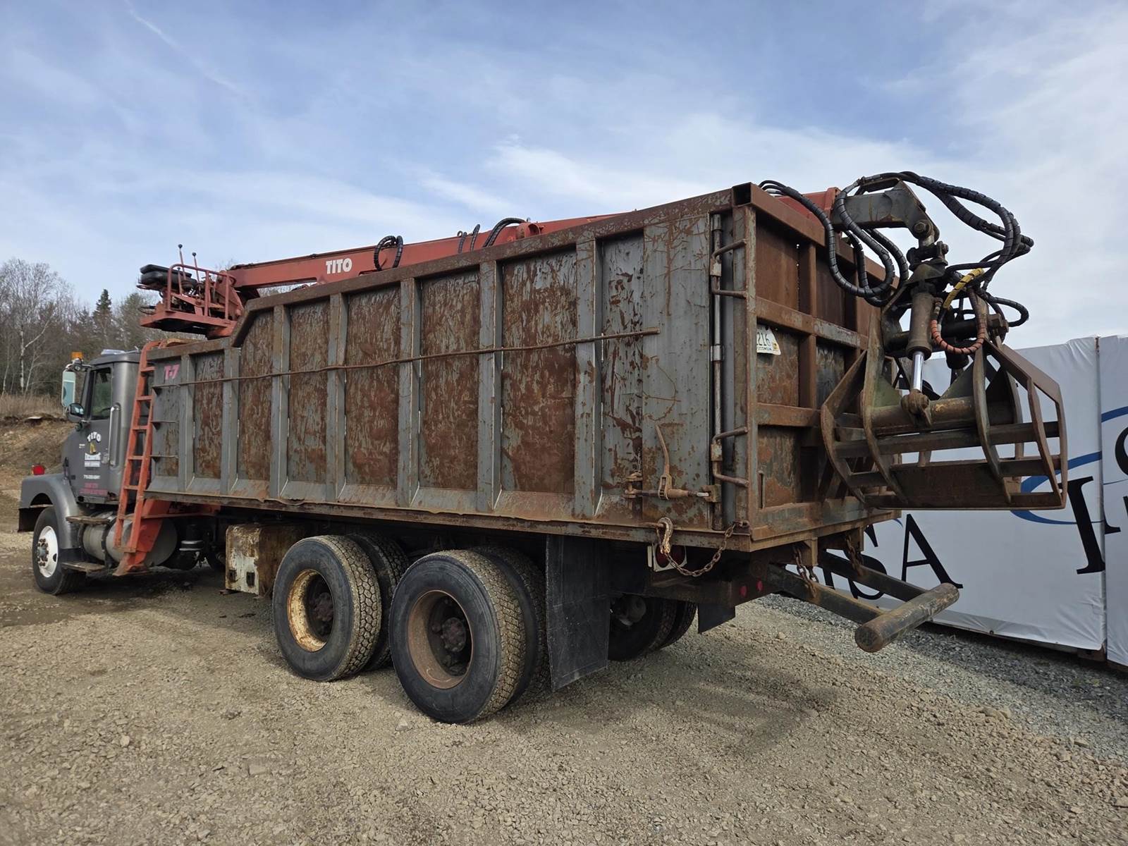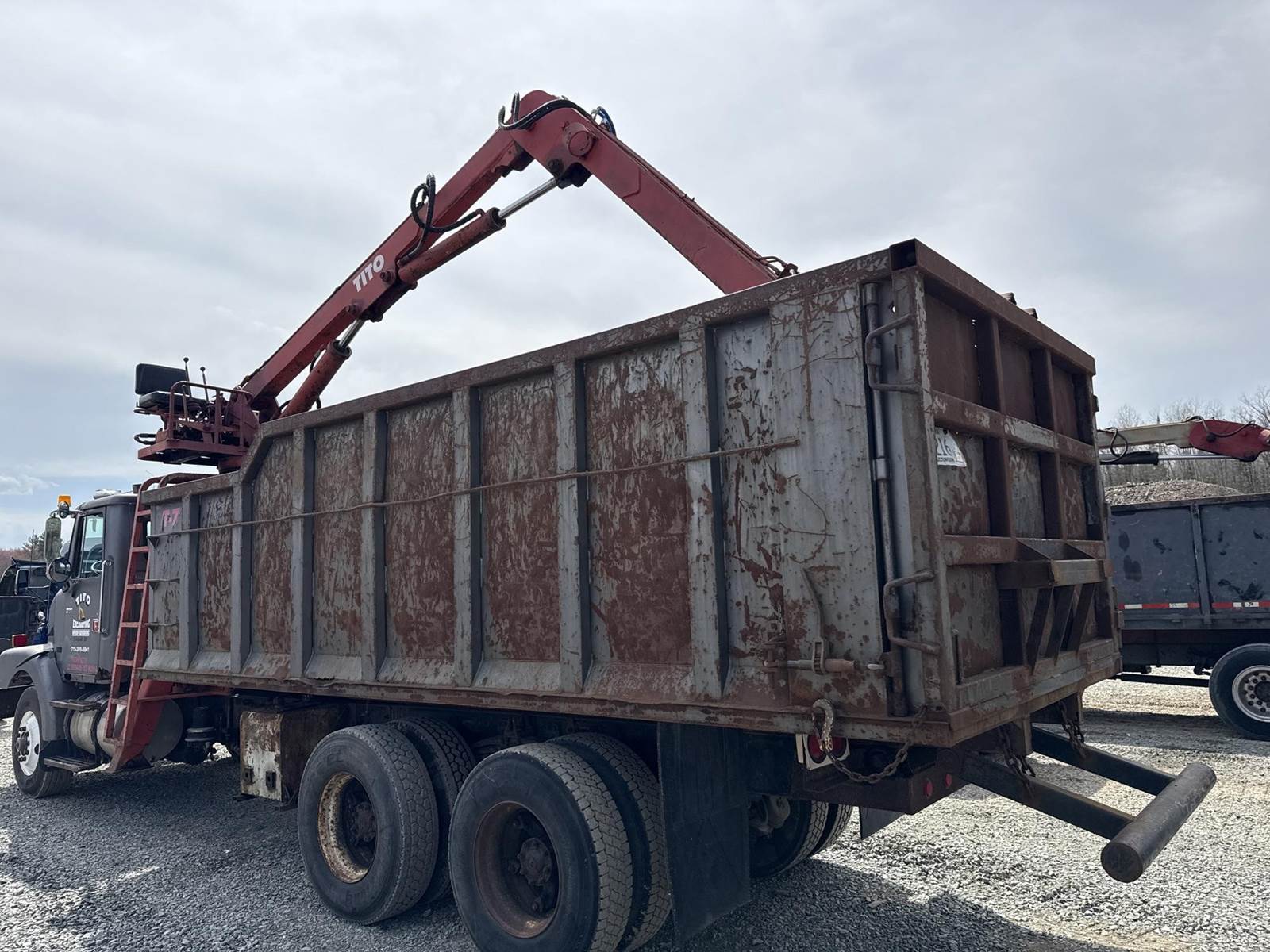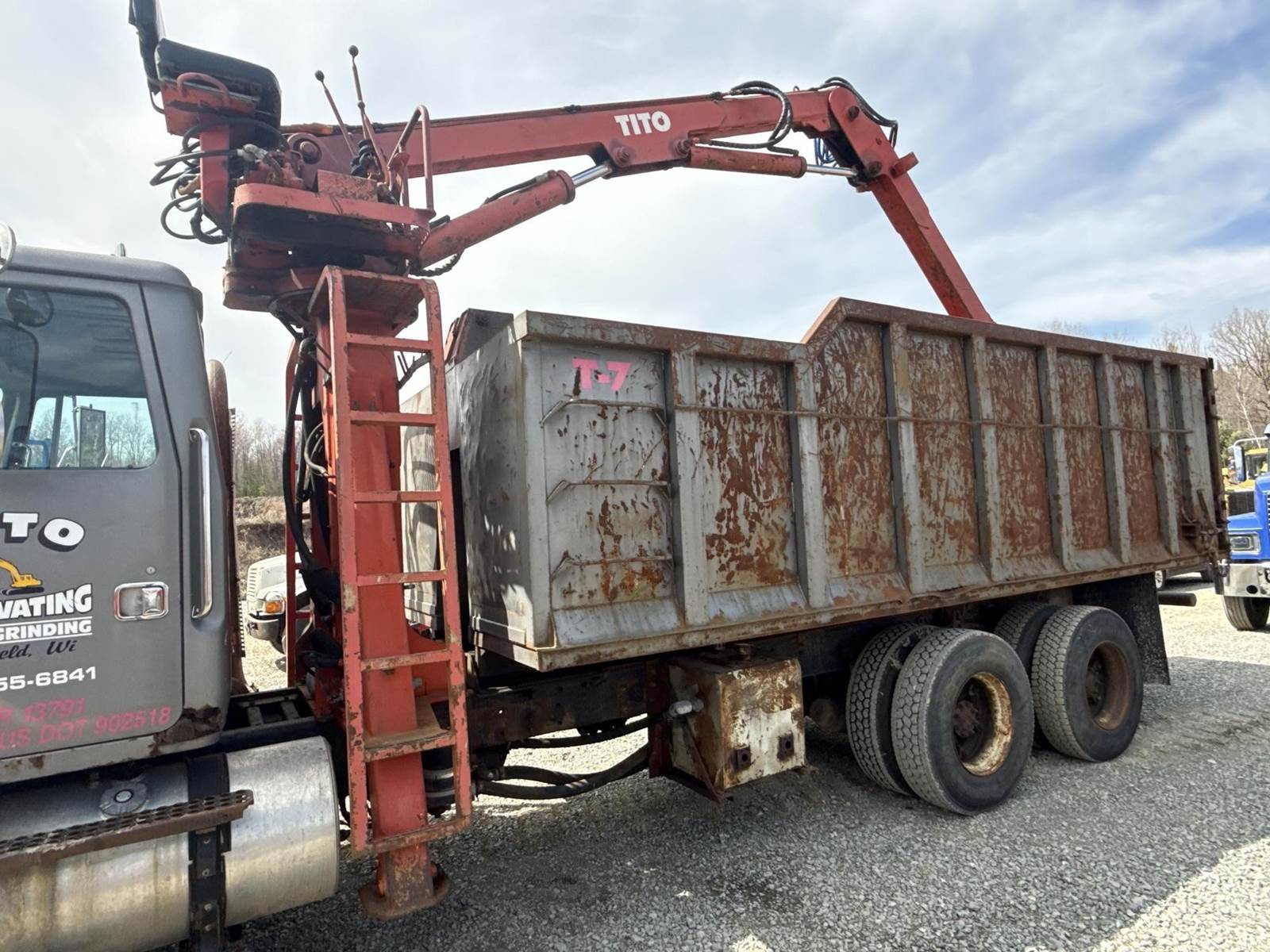 Detroit Diesel Series 60 Turbo Diesel Engine, Eaton Fuller 13 Speed Manual Transmission, Full Lockers, PTO, Engine Braking, Spring Ride Suspension, Double Frame, Outriggers, Approx. 20' Box, Tito Crane, Butt Grapple, Day Cab, Air Ride Driver Seat, Heat, AC, Radio, 11R22.5 Tires