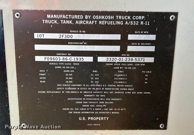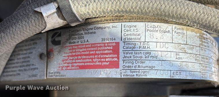 1990 Oshkosh pumper fire truck, Miles: 10,393 on odometer, Hours: 3,503 on meter, VIN: 10T2F3D02L1039783, Engine, Cummins, Displacement: 8...
