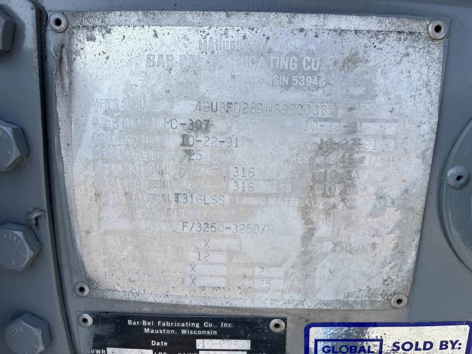 U2352 1989 Brenner Chemical MC 307 SS Straight Round Transport - 1 Compartment, - 7000 Gallon Capacity, - 250 Degree Temp Rating, -...
