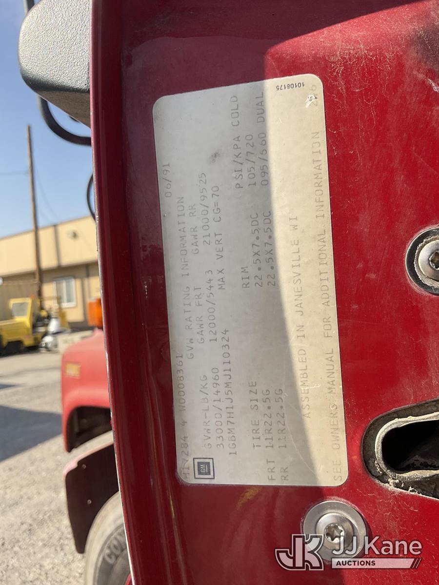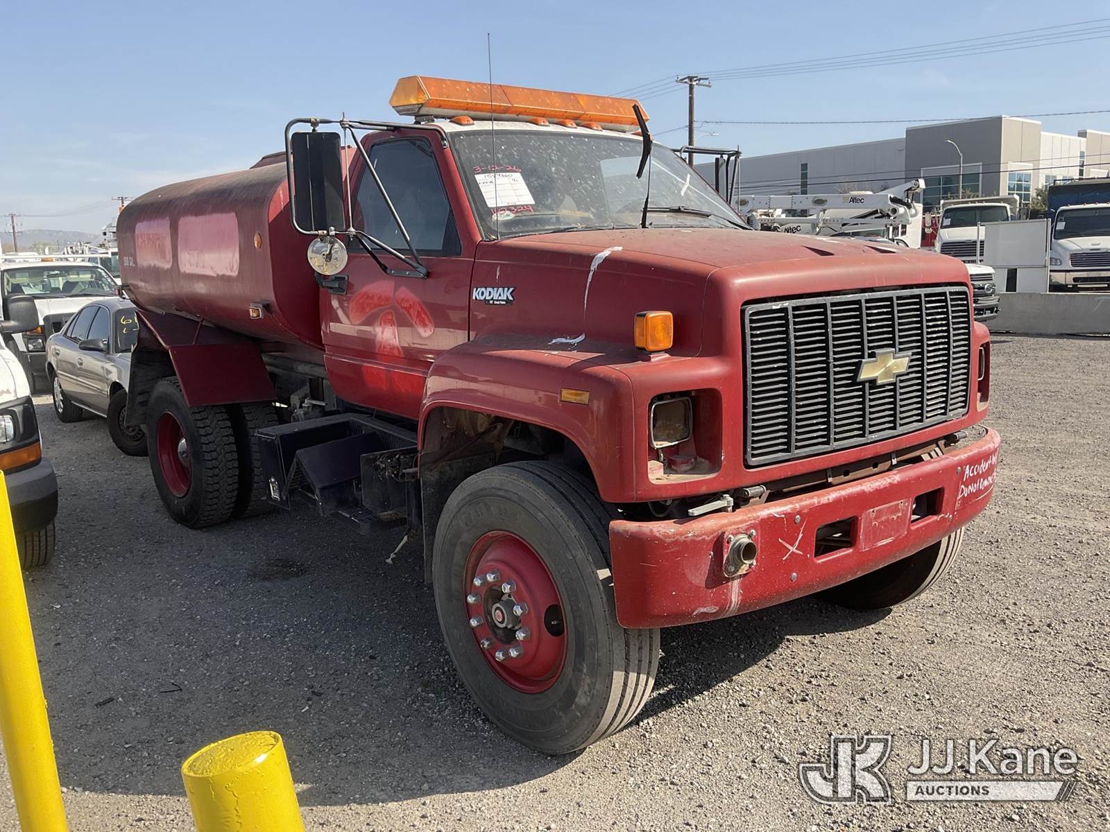 1991 Chevrolet C7H042 Water Tank Truck, 6.6L L6 DIESEL 4X2, Auto, with 1800 Gallon Tank, (Exempt from Odometer Disclosure - Reads 42,959 miles) (Runs & Moves) (Damage To The Tank, No Headlights) Subject to CARB Regs,CARB non Compliant,Cannot Operate on CA Roads/Highways until Compliant This is a Titled Item NOTE: This unit is being sold AS IS/WHERE IS via Timed Auction and is located in Jurupa Valley, CA. Inspection & preview days for this unit are the 2 business days prior to the first day of items closing for this auction, item is located at 4510 Muth Way Jurupa Valley, CA 92509 and hours of operations are 8a-4p. For pre-sale questions, please contact please contact Office Staff @ (310) 353-7140. Dealer License Number 45696. (Buyer is responsible for removal. Assistance by consignor or JJ Kane Auctions is not assured.)