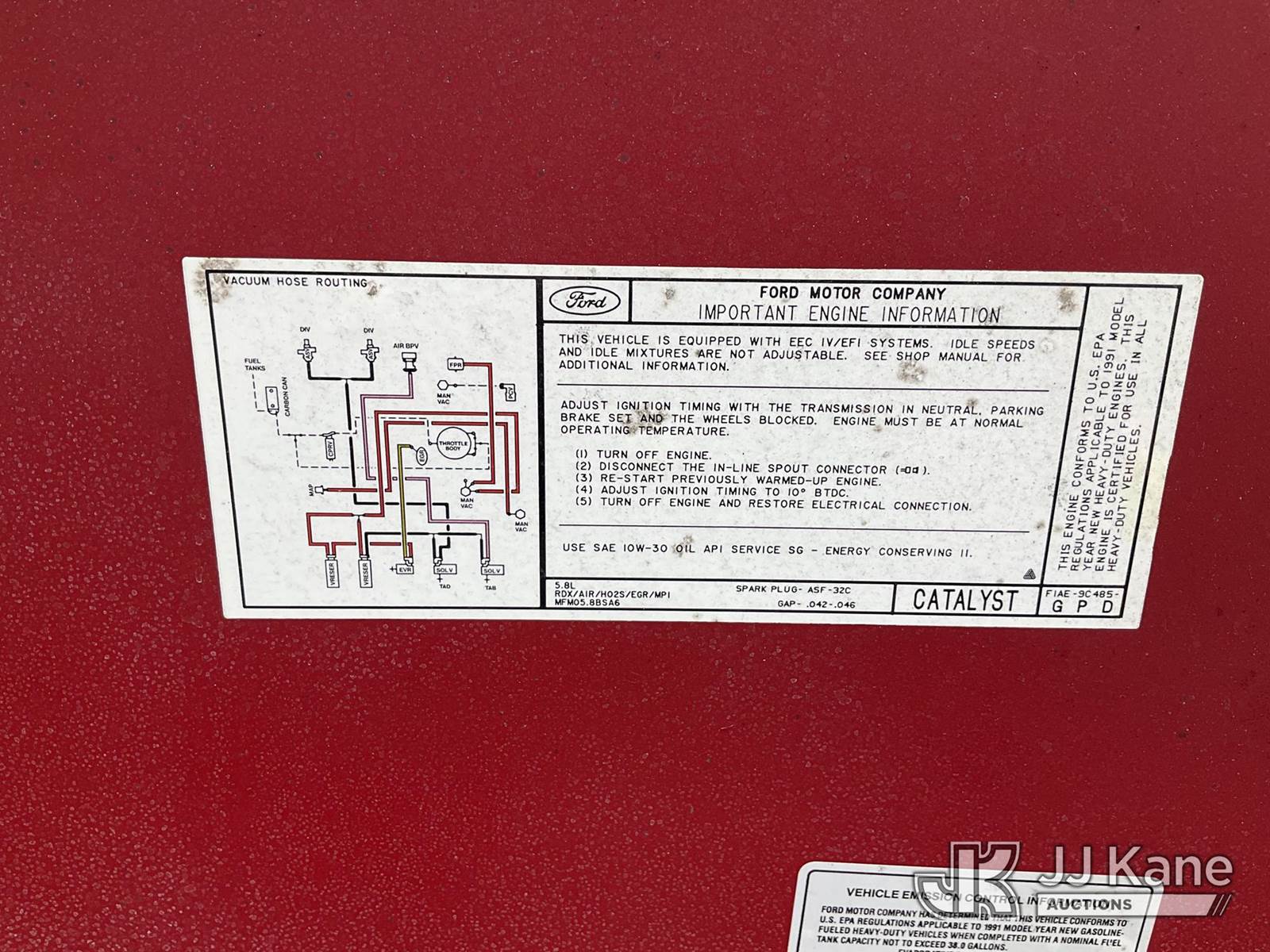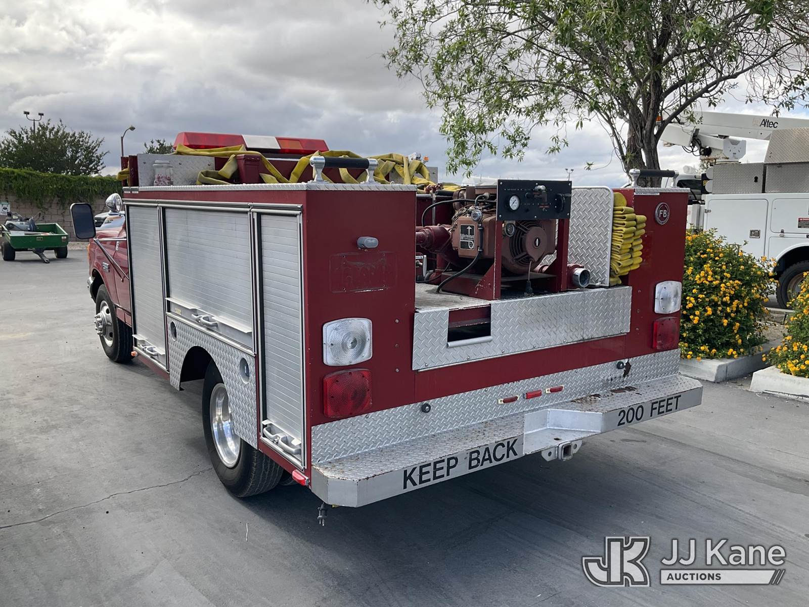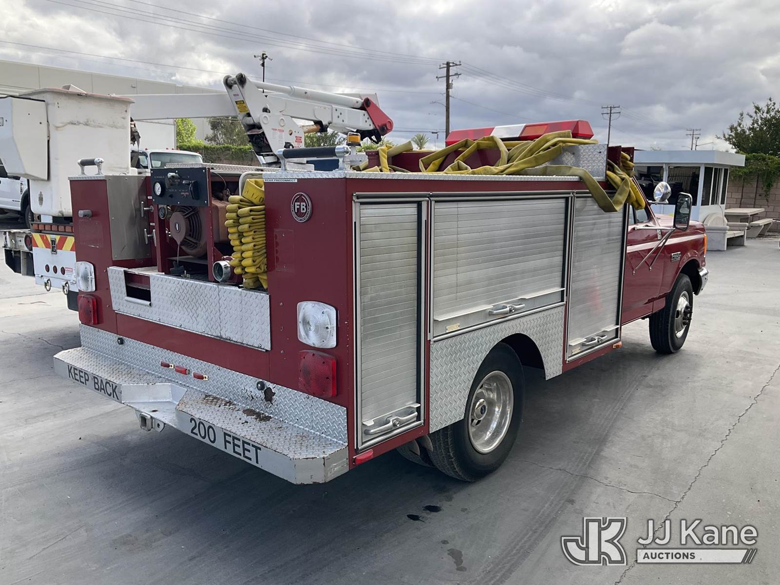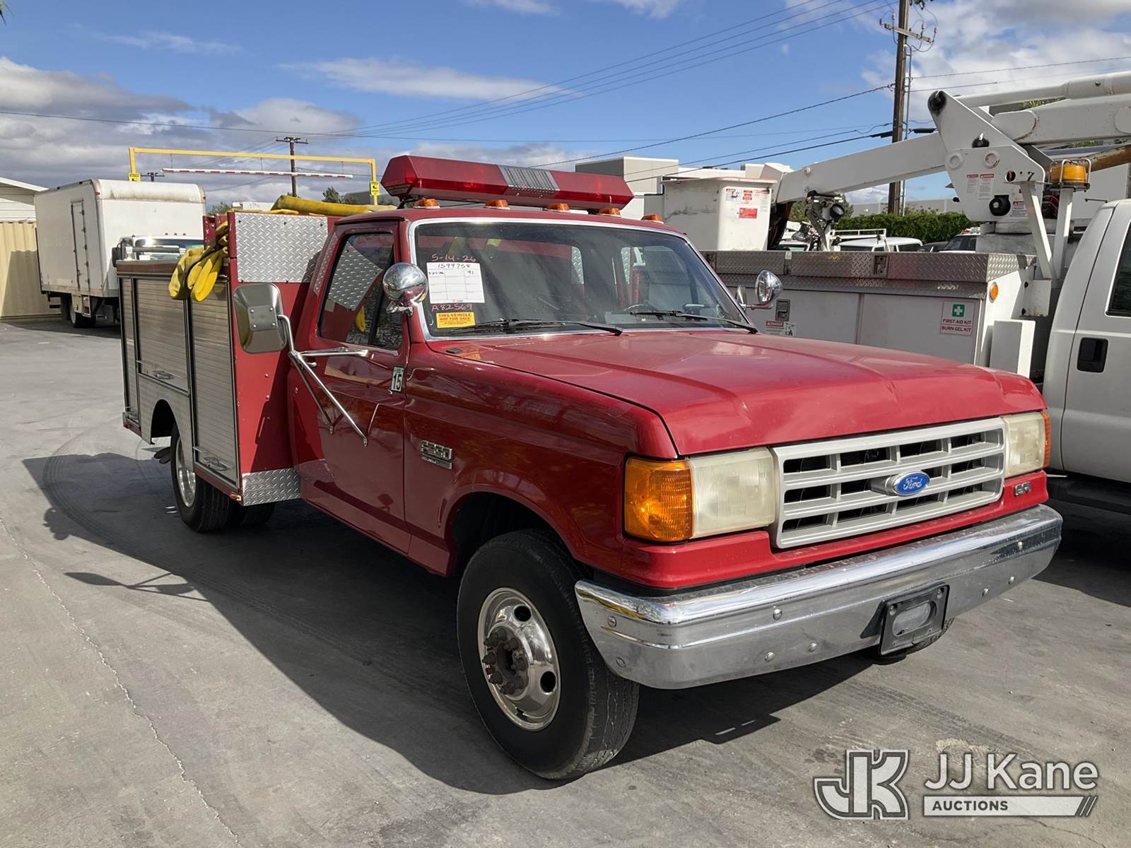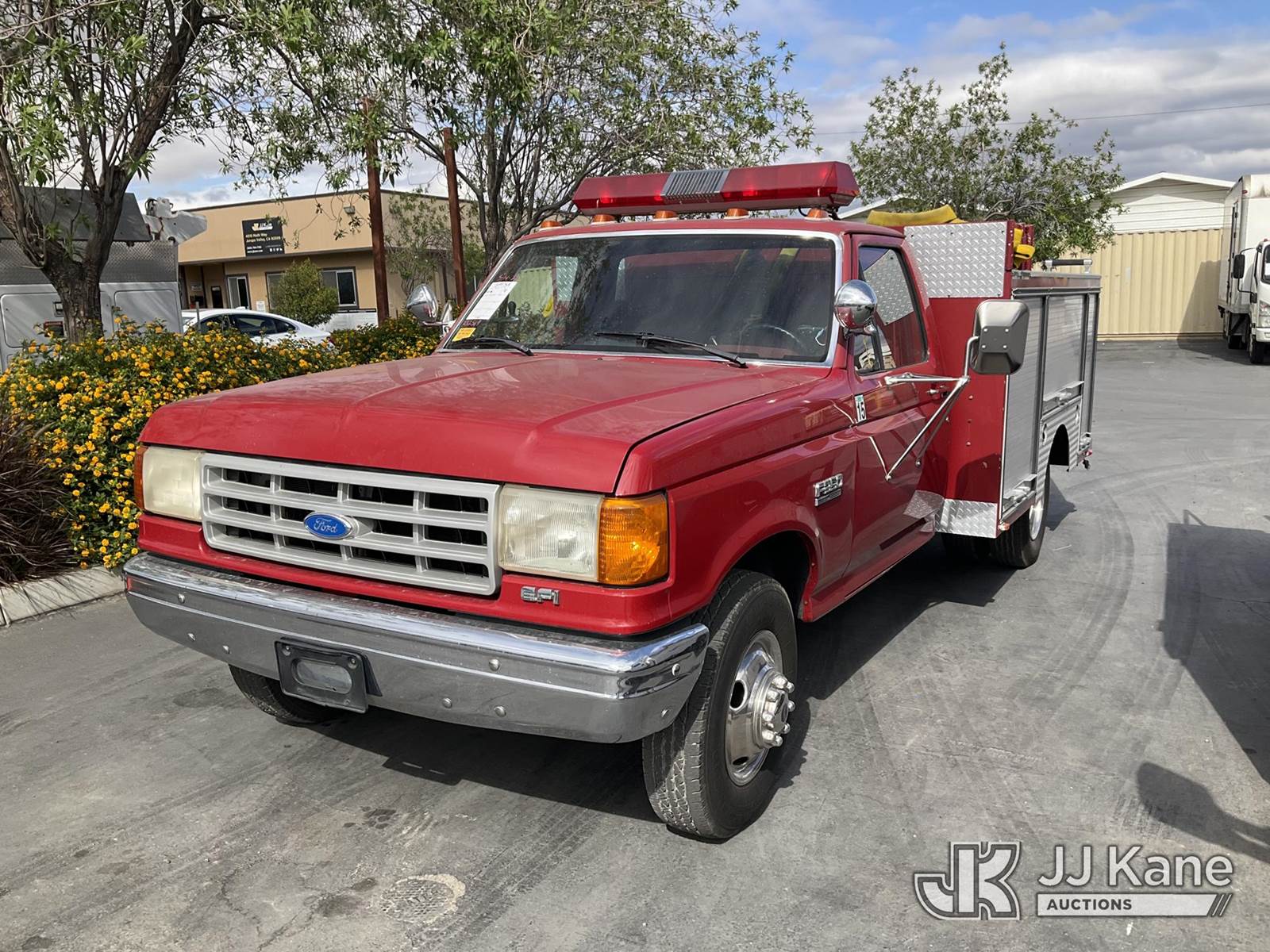 1991 Ford F-350 Reg. Cab DRW 2WD Service Truck, s/n 2FDKF37H4MCA82569, 5.8L V8 OHV 16V RWD, GAS, 4-Speed Automatic, A/C, (Exempt from Odometer Disclosure - Reads 1,628 miles (unverified)) (Runs & Moves, Fire Skid Water Pump In-Operable) This is a Titled Item NOTE: This unit is being sold AS IS/WHERE IS via Timed Auction and is located in Jurupa Valley, CA. Inspection & preview days for this unit are the 2 business days prior to the first day of items closing for this auction, item is located at 4510 Muth Way Jurupa Valley, CA 92509 and hours of operations are 8a-4p. For pre-sale questions, please contact please contact Office Staff @ (310) 353-7140. Dealer License Number 45696. (Buyer is responsible for removal. Assistance by consignor or JJ Kane Auctions is not assured.)