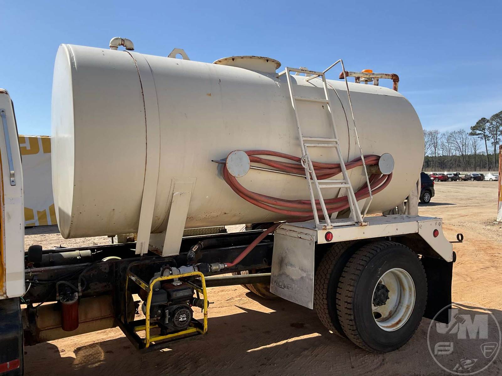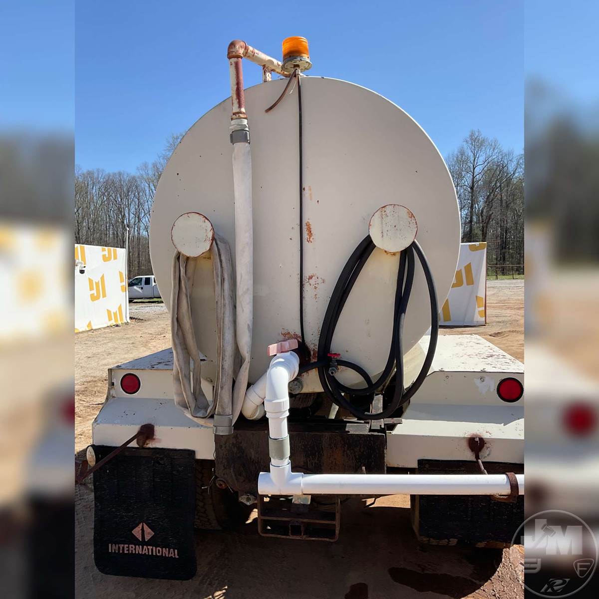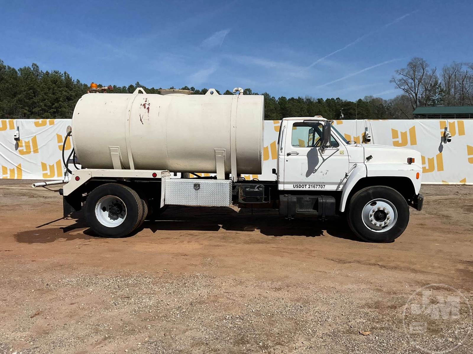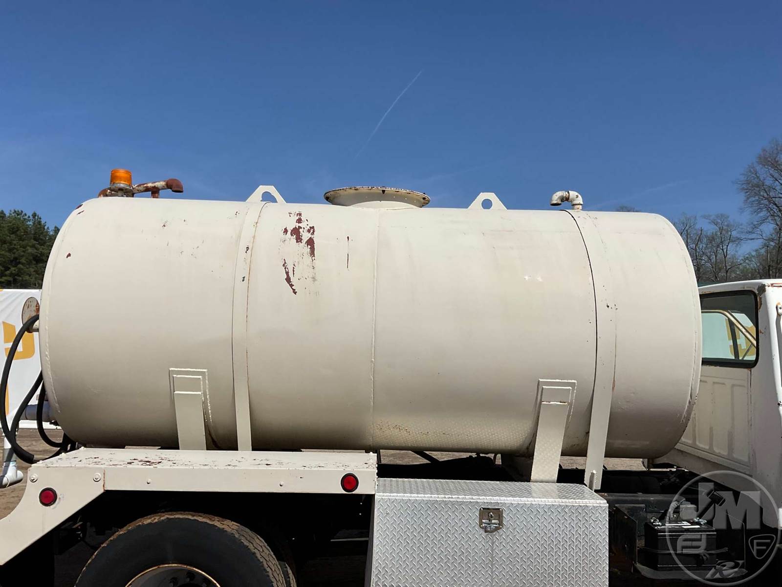 SINGLE AXLE WATER TRUCK, 5 SPEED, SPRING SUSPENSION, 189 " WB, 2000 GALLON CAPACITY (APPROX), REAR DISCHARGE, STEEL DISC WHEELS, 11R22.5 TIRES, FORD 6CYL DIESEL ENGINE, HOUR METER READS: 3507, ODOMETER READS: 126726