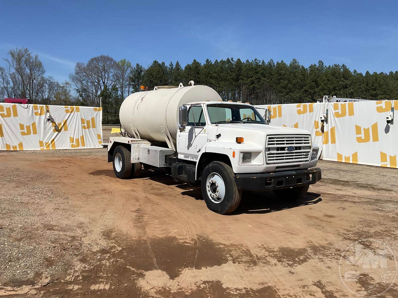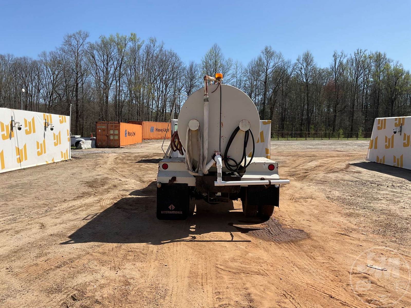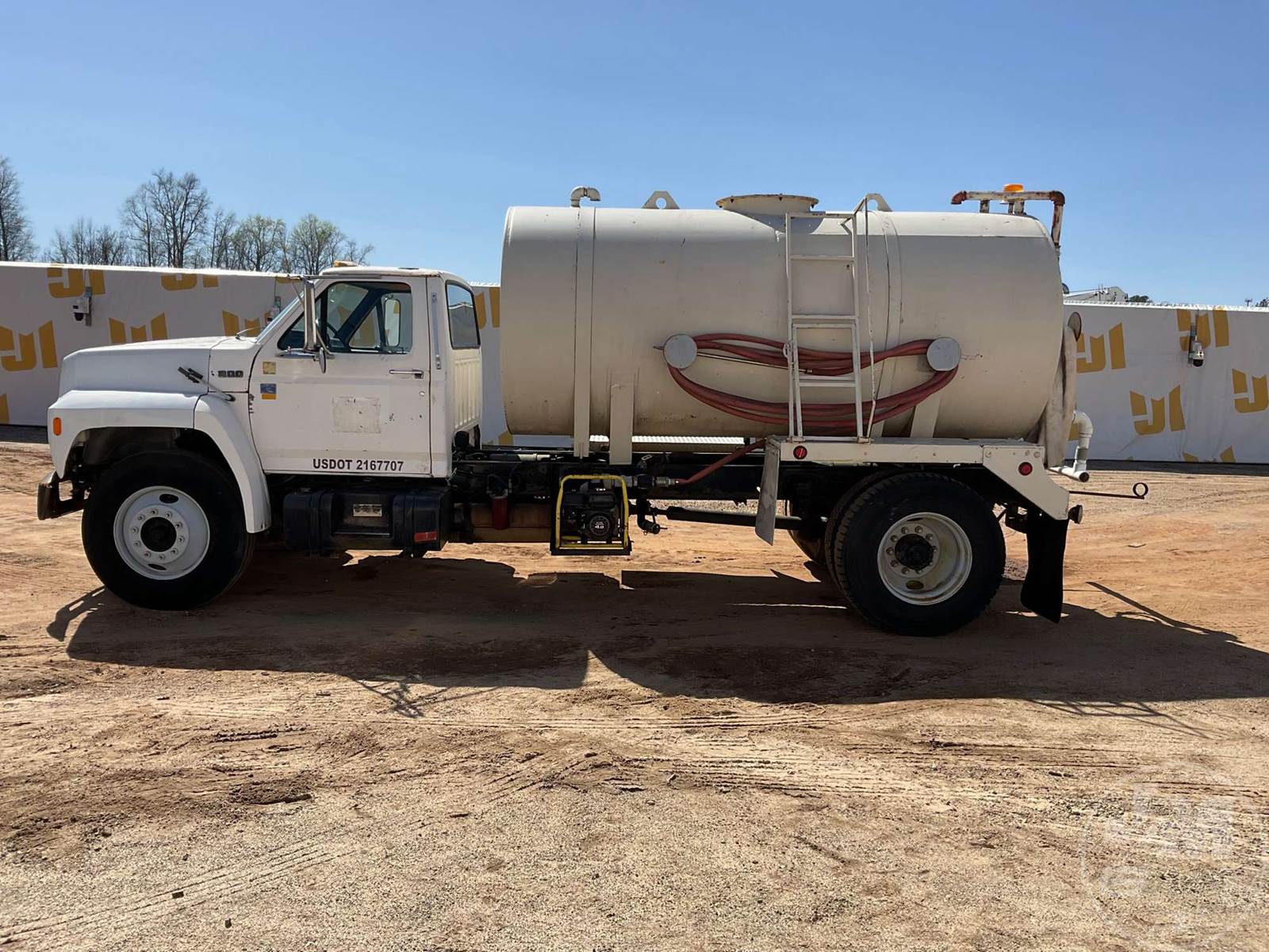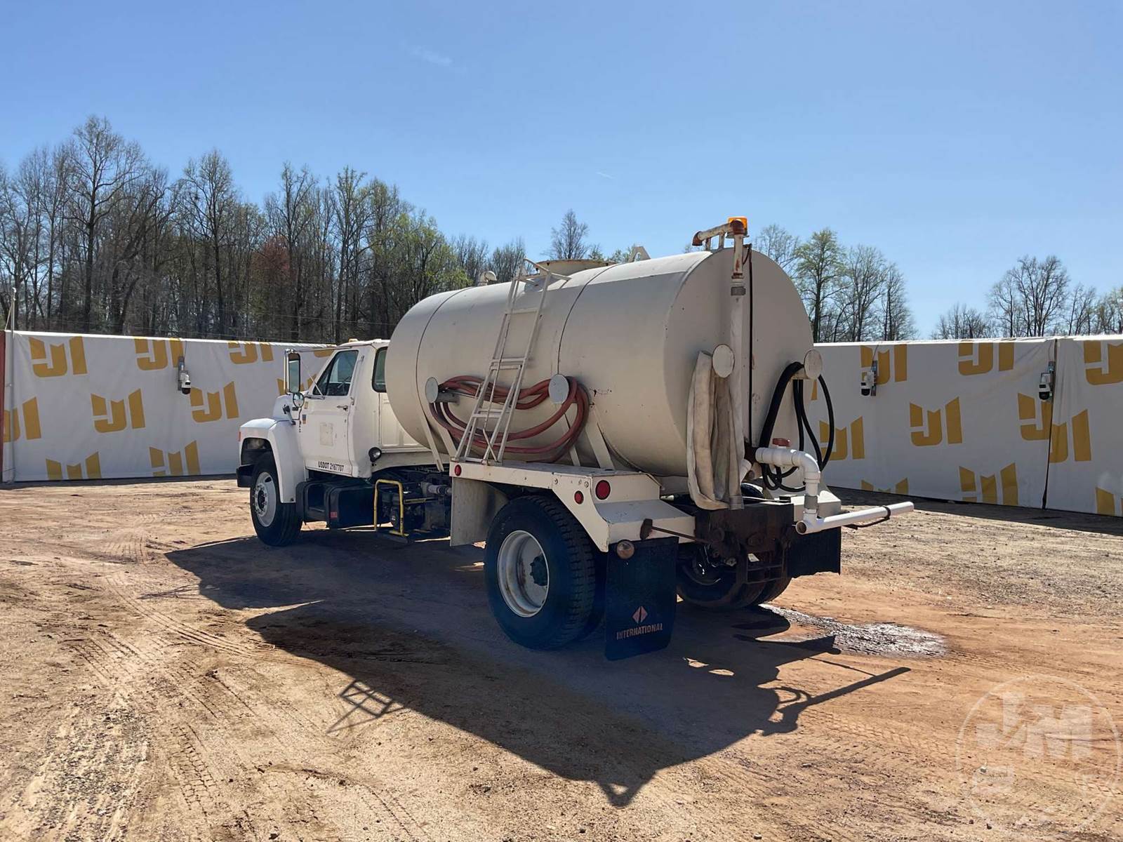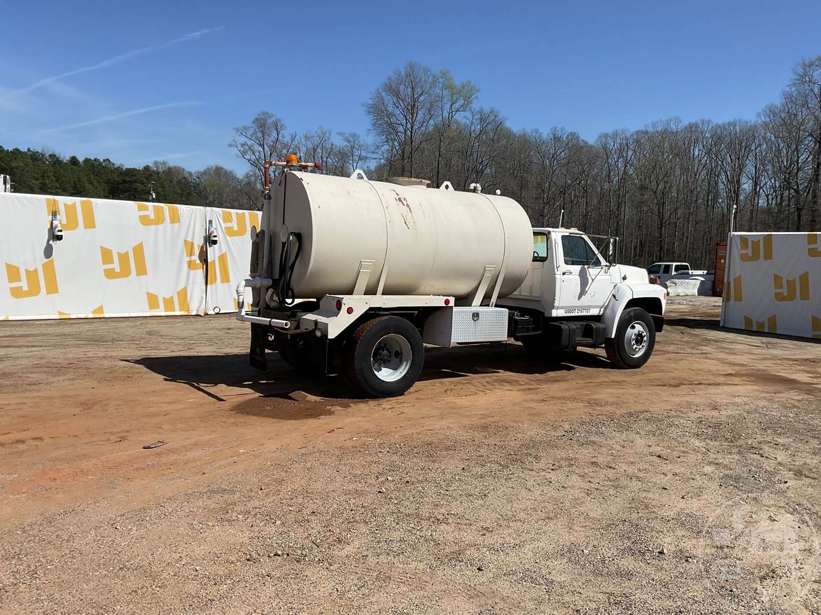 SINGLE AXLE WATER TRUCK, 5 SPEED, SPRING SUSPENSION, 189 " WB, 2000 GALLON CAPACITY (APPROX), REAR DISCHARGE, STEEL DISC WHEELS, 11R22.5 TIRES, FORD 6CYL DIESEL ENGINE, HOUR METER READS: 3507, ODOMETER READS: 126726