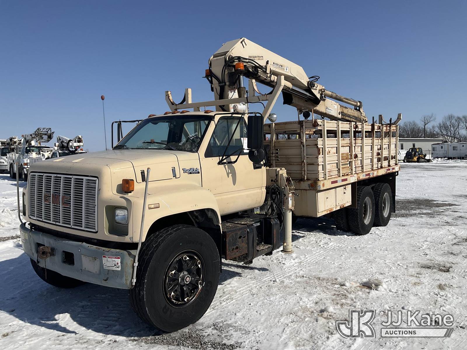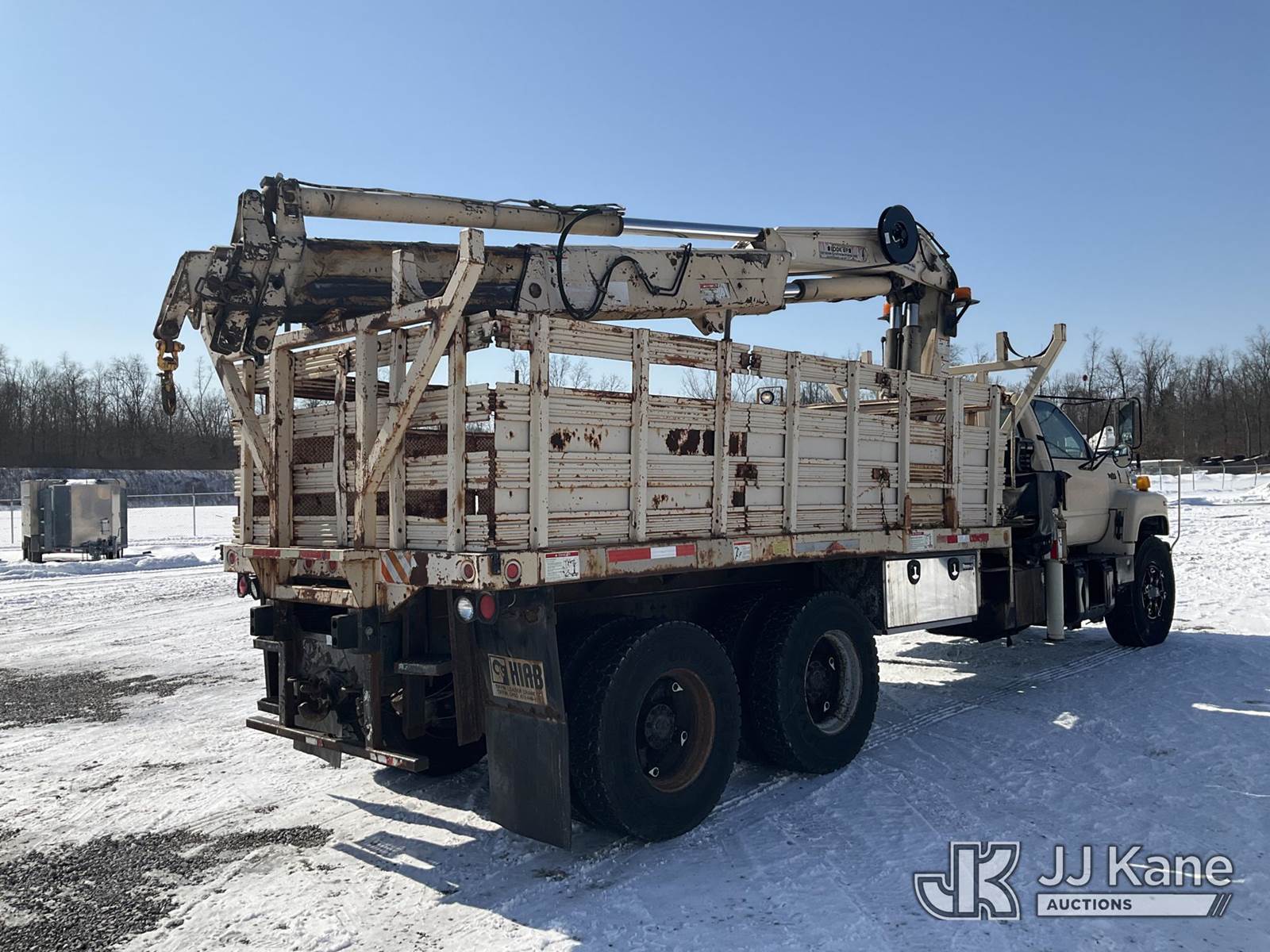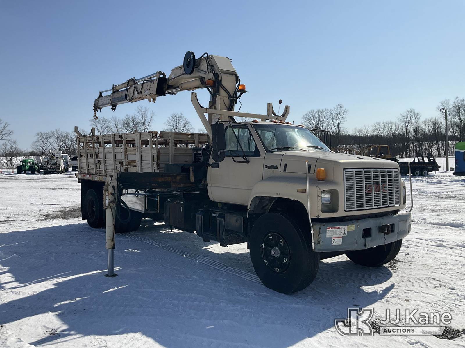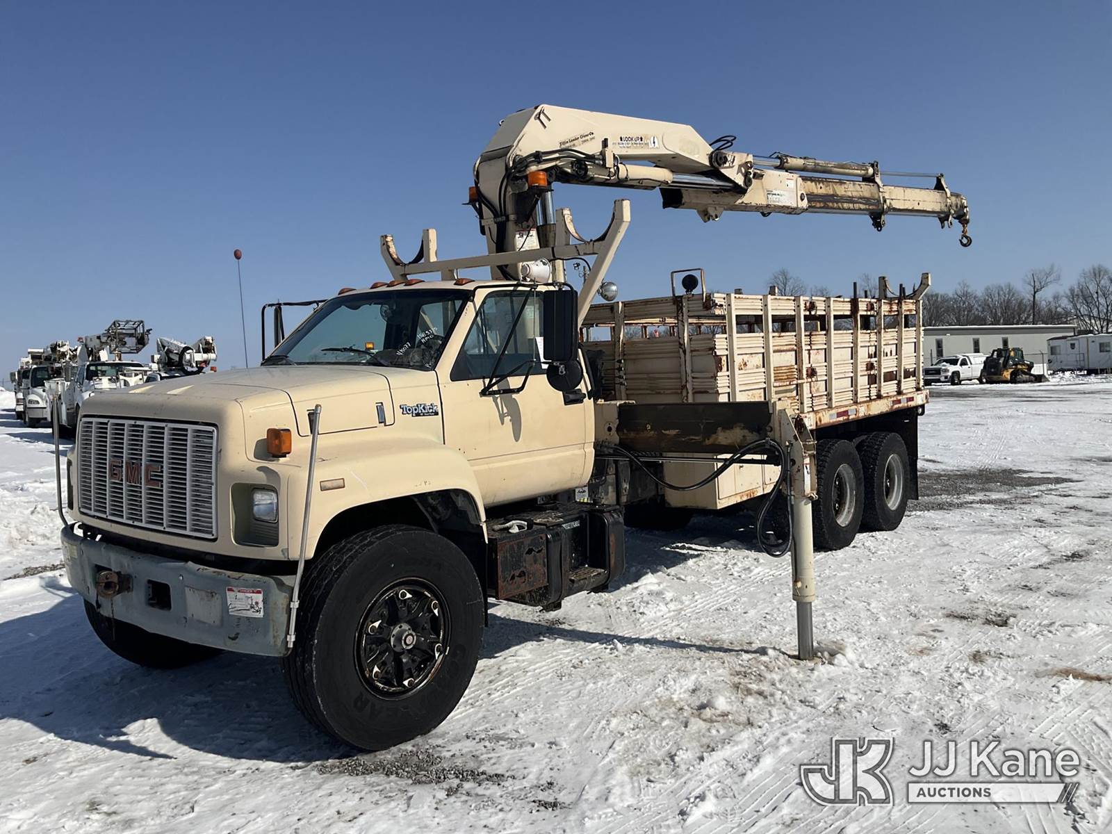 Hiab 260AWV, Hydraulic Knuckle Boom Crane s/n 4774, with 2 section hyd boom, dual controls & 2 hyd outriggers, mounted behind cab on 1991 GMC Topkick Flatbed Truck, Cat 3116 diesel, 4X2, Auto, with stake sides, (Exempt from Odometer Disclosure - Reads 96,499 miles) (Runs, Moves & Upper Operates) This is a Titled Item NOTE: This unit is being sold AS IS/WHERE IS via Timed Auction and is located in Verona, KY. Inspection & preview days for this unit are the 2 business days prior to the first day of items closing for this auction, item is located at 2841 Verona-Mudlick Rd Ste B Verona, KY 41092 and hours of operations are 8a-4p. For pre-sale questions, please contact Office Staff @ (502) 612-5080. Auctioneer Michael Whitebread / License # 256617. (Missing manuals, See Auction Company for Manufacturers Information to obtain manuals) (Buyer is responsible for removal. Assistance by consignor or JJ Kane Auctions is not assured.)