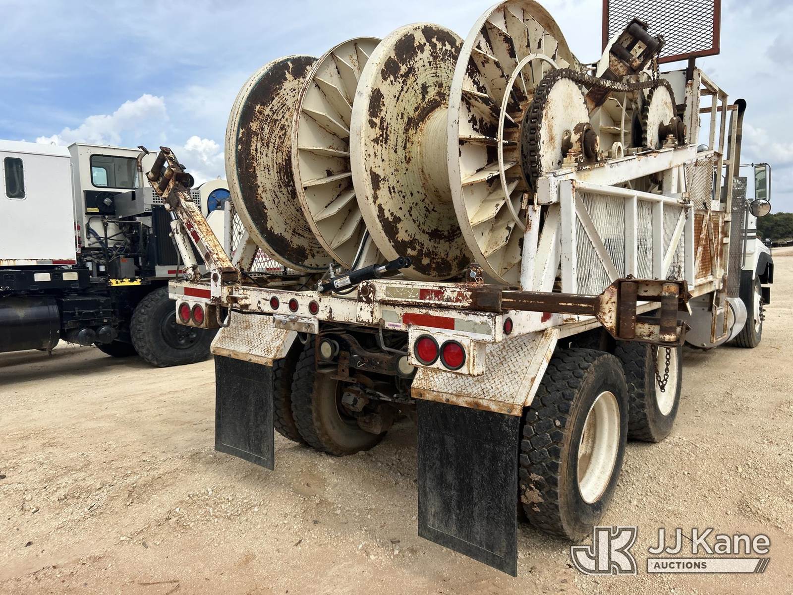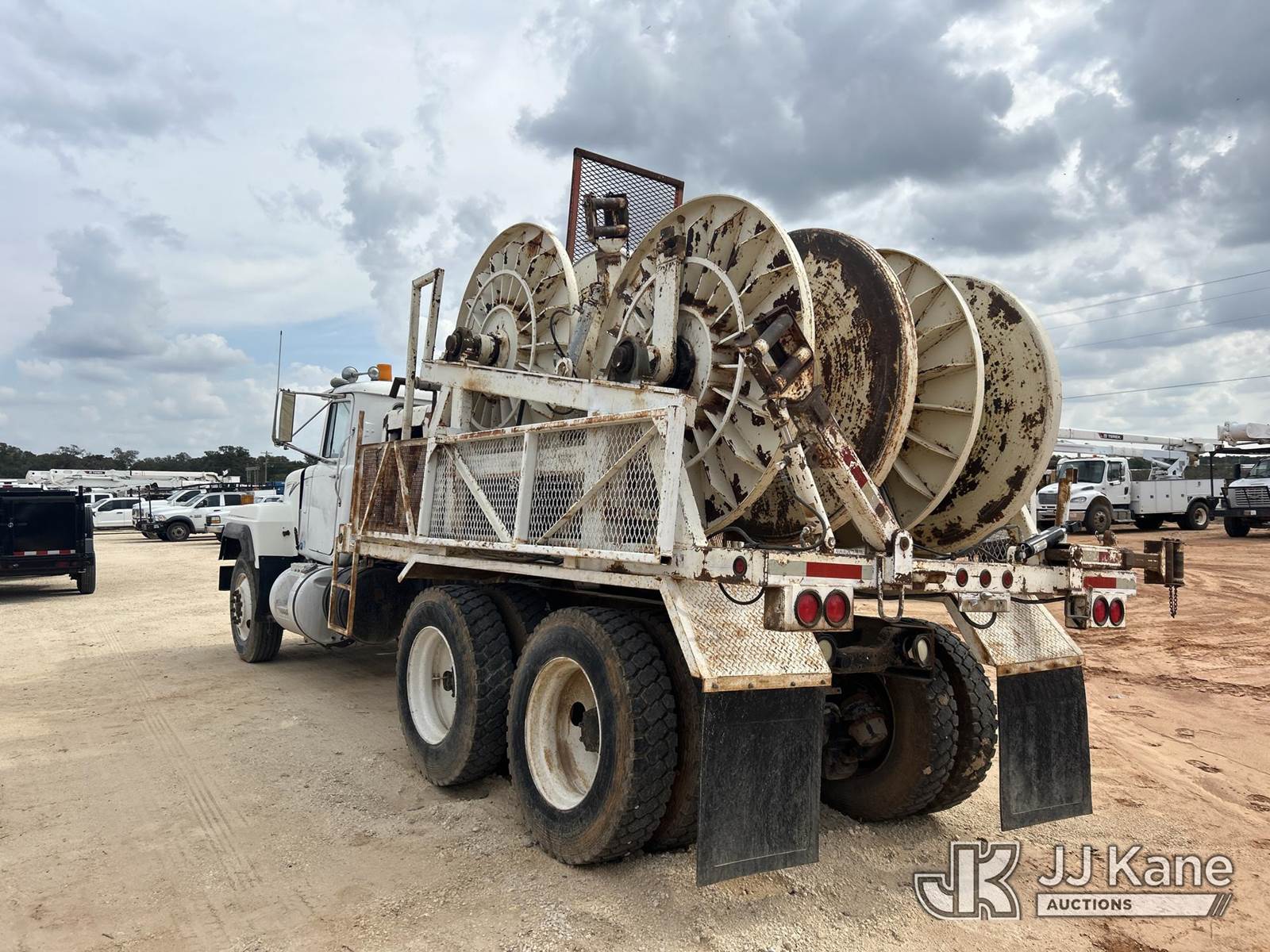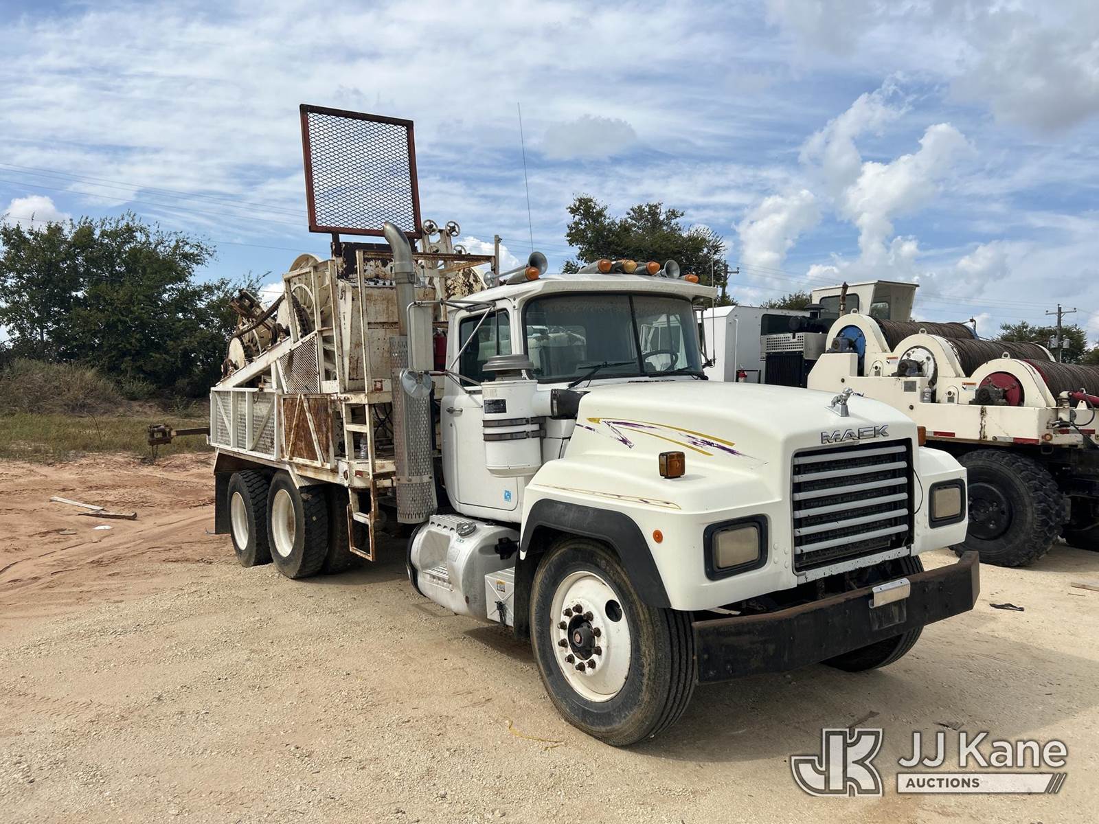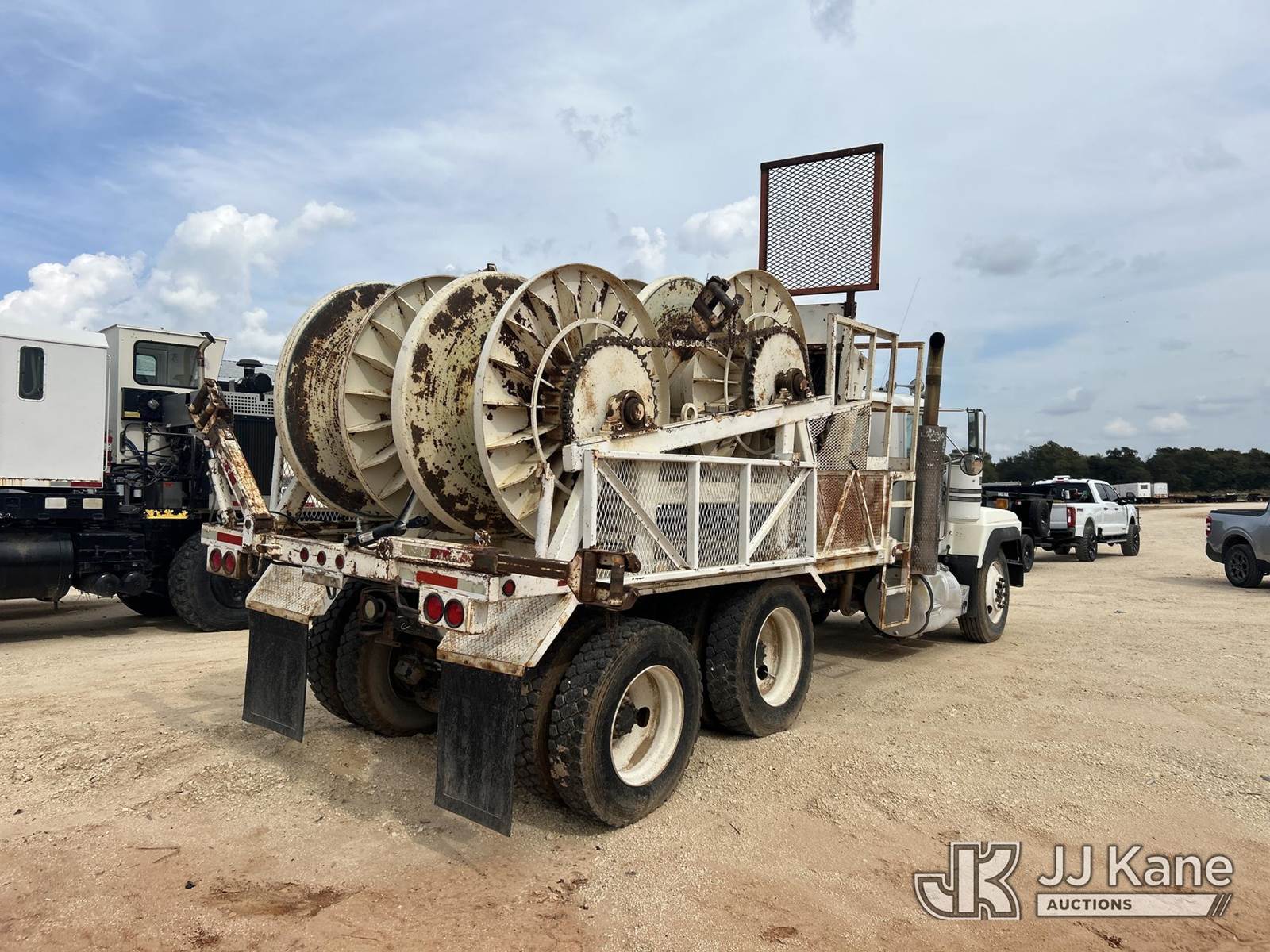 1991 Mack RD600 Flatbed Reel Truck, 12.0L 8-spd, diesel, A/C, with 4 drum puller on back, (Exempt from Odometer Disclosure - Reads 324,867 miles) (Runs & Moves) (Reel System Condition Unknown, Jump To Start) This is a Titled Item NOTE: This unit is being sold AS IS/WHERE IS via Timed Auction and is located in Stephenville, TX. For pre-sale questions or to schedule an inspection, please contact Matt Kaman @ 919-800-7863. (Buyer is responsible for removal. Assistance by consignor or JJ Kane Auctioneers is not assured.)