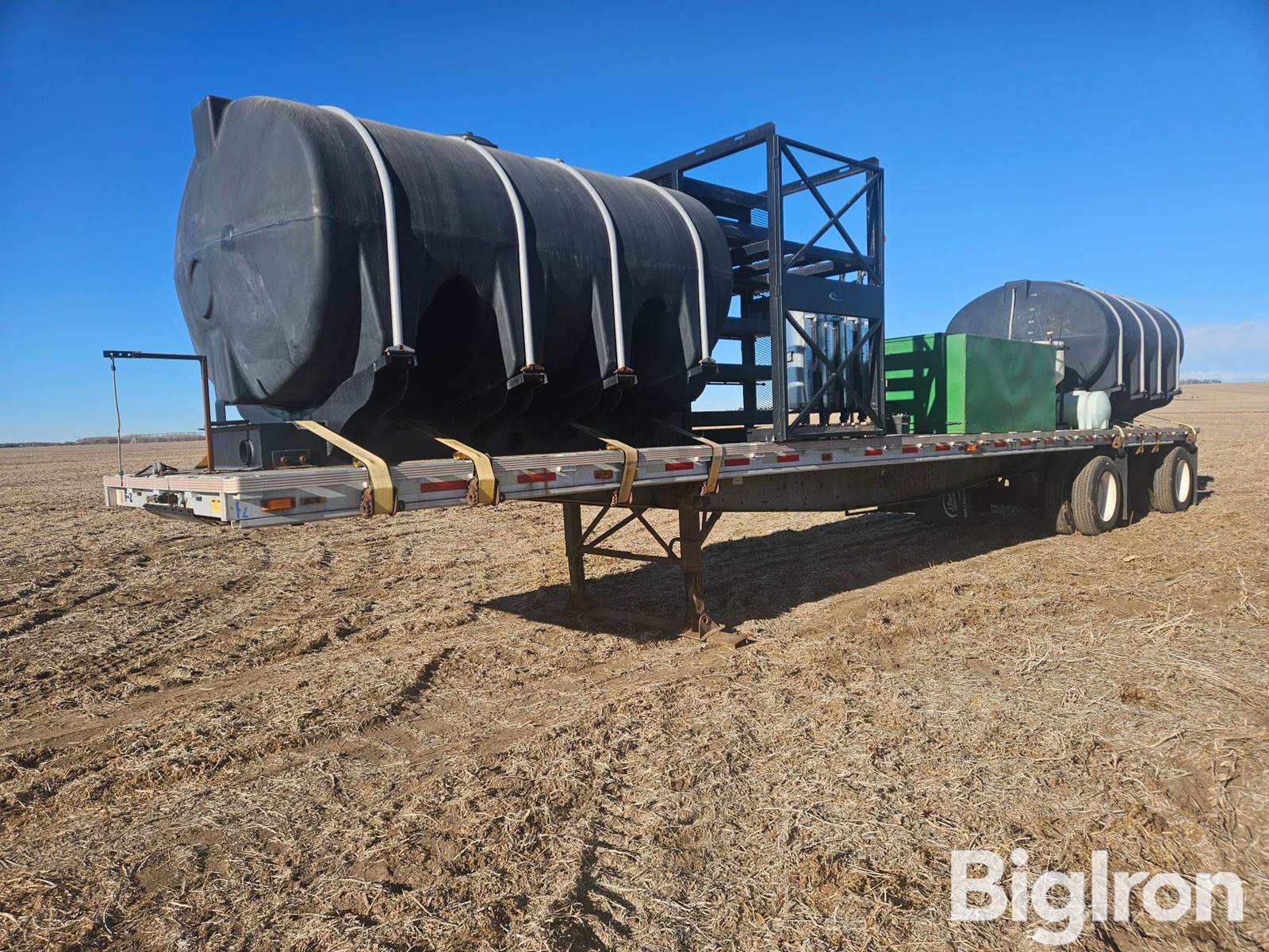 1991 Reinke T/A Flatbed Sprayer Tender Trailer, 96" Wide x 48' Long Flatbed Trailer, Steel Frame, Aluminum/Wood Deck, Stake Holder Pockets, Air Brakes, Air Suspension, 285/75R24.5 Tires, (2) 2500-Gal Black Poly Tanks On Steel Cradles, 3” Plumbing, (1) 30-Gal Poly & (1) 15-Gal Stainless Steel Induction Cones, Pitstop Chemical Mixing & Transfer System - (4) Stainless Steel 35-Gallon Chemical Cylinders With Sight Gauges, Side 3” Quick Fill Port, Honda GX390 Gas Engine, Centrifugal Pump, 12V Powered Hose Reel, Steel Storage Tote, Large Storage Rack To Hold (4) Chemical Totes, VIN: 4C6FC4821M1020004