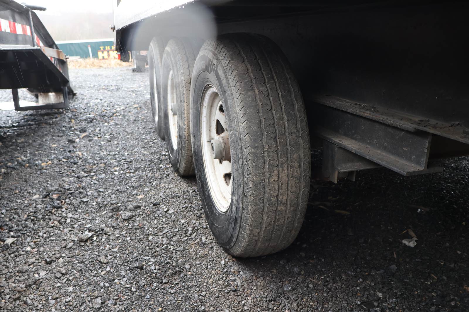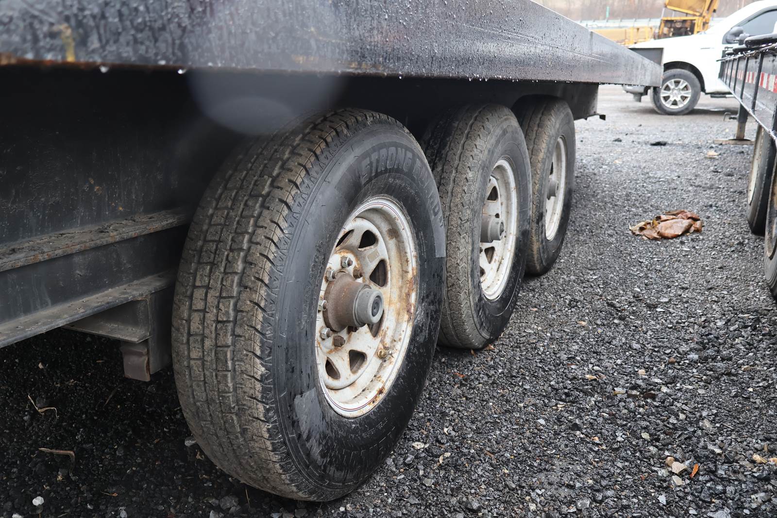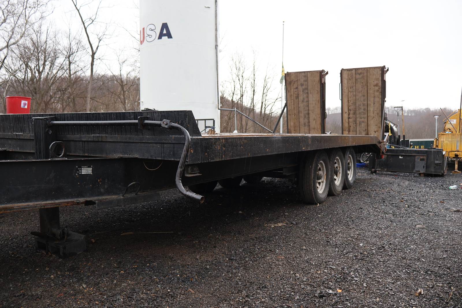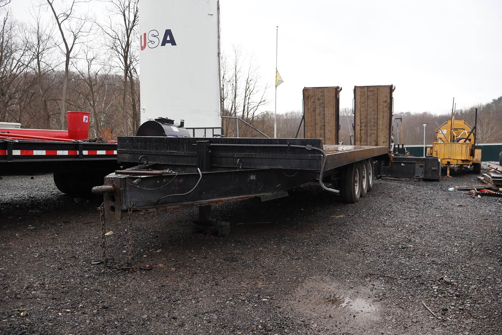 20' X 96" dual axle, steel bed tag trailer,. Good ST235/85/R56 tires. Pintel hitch. Lock down straps, new bearings