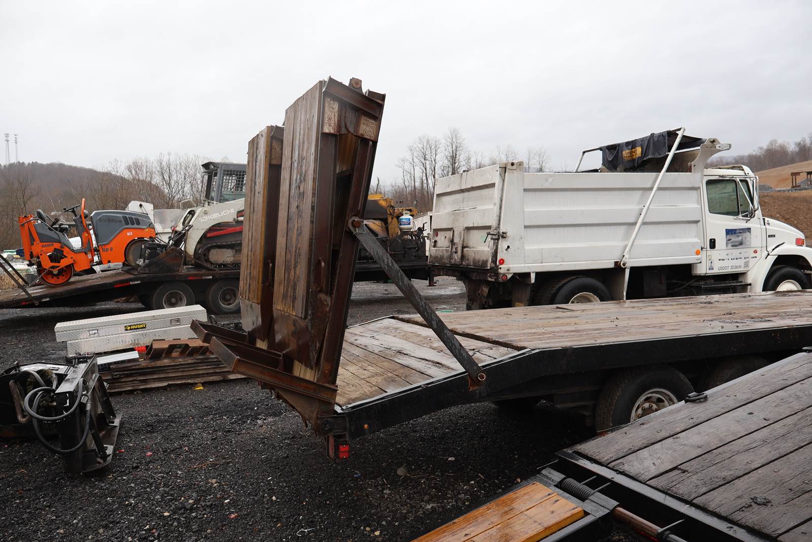 1992 Hooper 24' X 96" Tri Axle Equipment Trailer, with Custom Long Ramps Designed for Ease of Loading and Unloading Paving Equipment. Electric Brakes, 24ft long deck. 20ft Flat Deck, 4ft Angle, Overall Length 30ft. Width 8ft, 10ft Custom Ramps, 20,000 lb GVWR