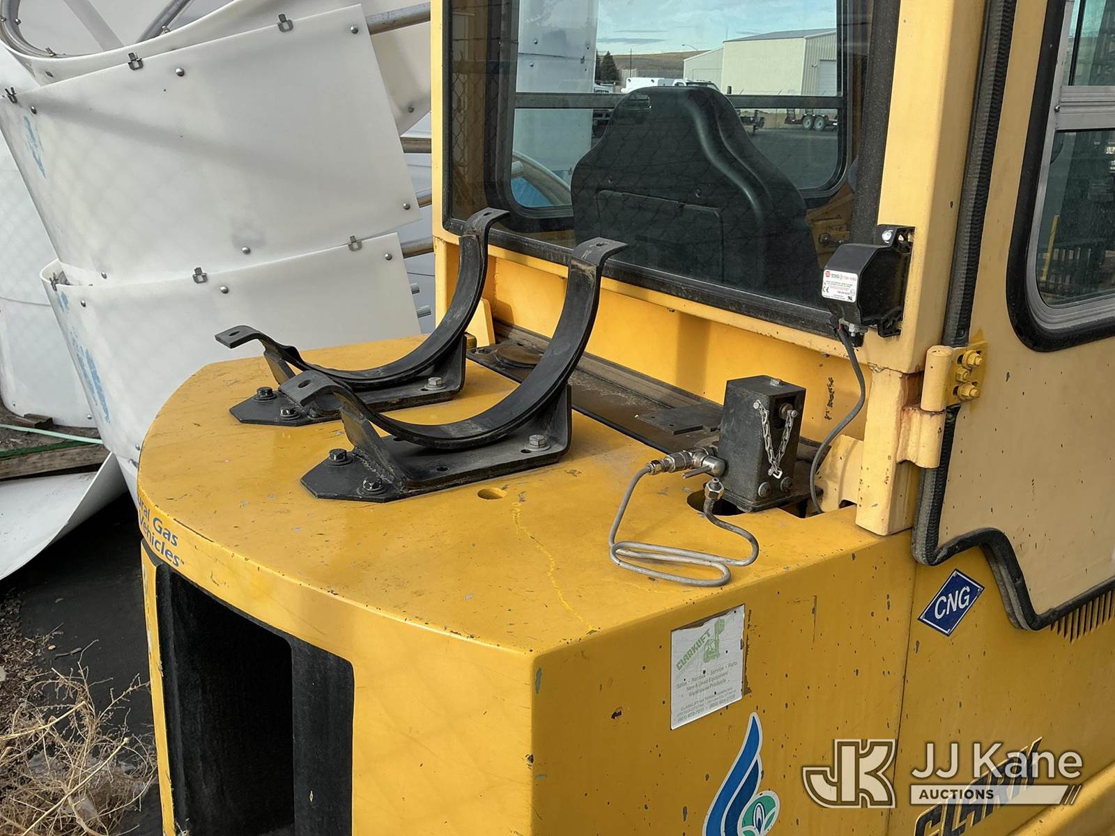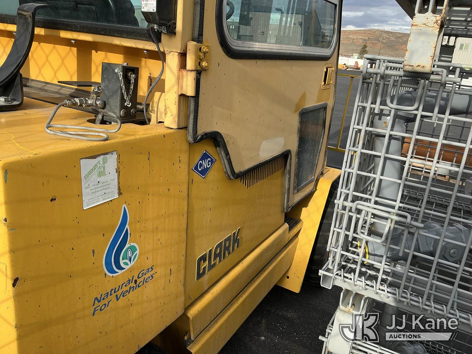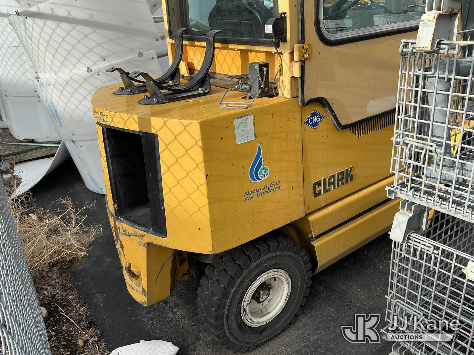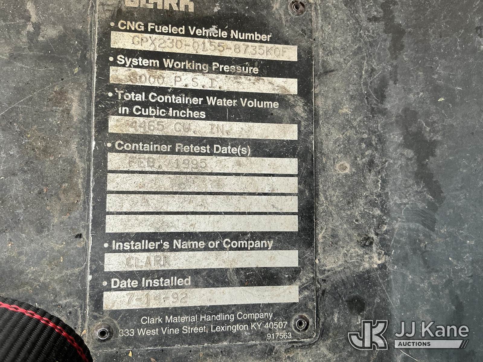 1992 Clark GPX30 Pneumatic Tired Forklift, s/n GPX23001558735KOF, Hydrostatic, CNG Only, with 3,675 lb. capacity, 226 in. 3 stage mast height, EROPS, (Not Running, Condition Unknown) (Does Not Start, No CNG Tank, Seller States: Runs with CNG Tank) (Reads 725 hours) NOTE: This unit is being sold AS IS/WHERE IS via Timed Auction and is located in Evanston, WY. (Buyer is responsible for removal. Assistance by consignor or JJ Kane Auctioneers is not assured.)