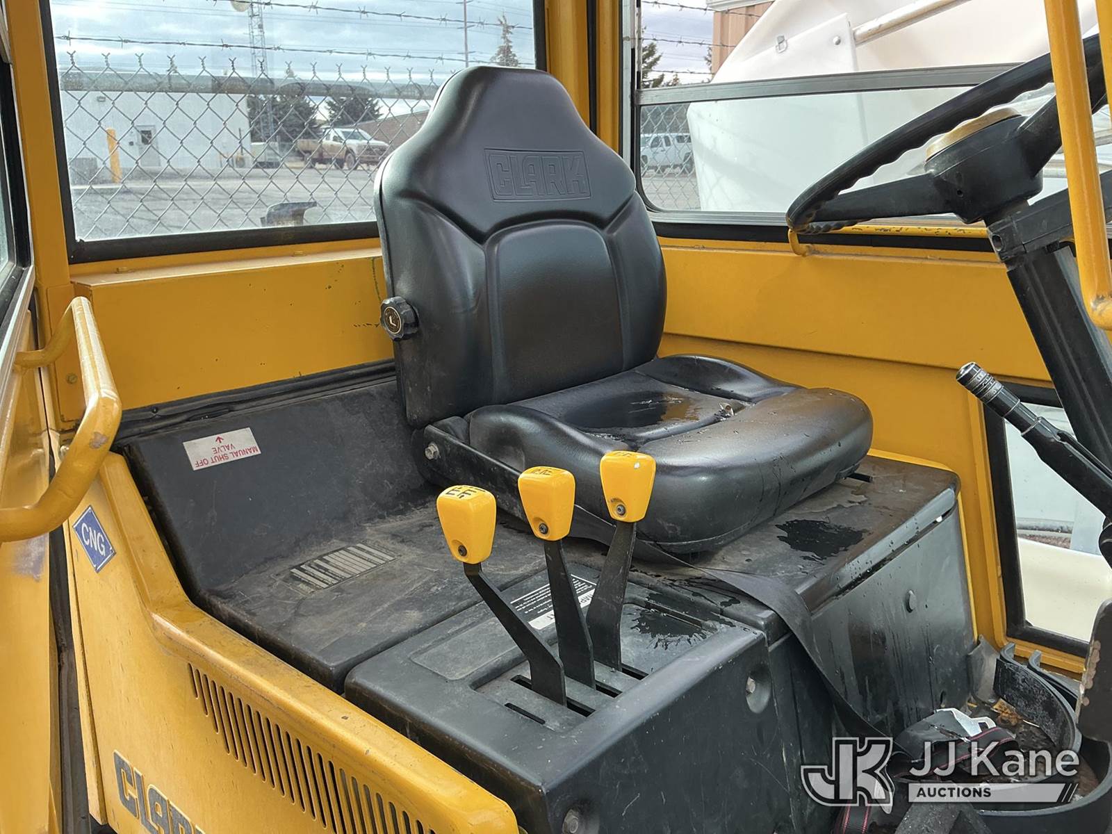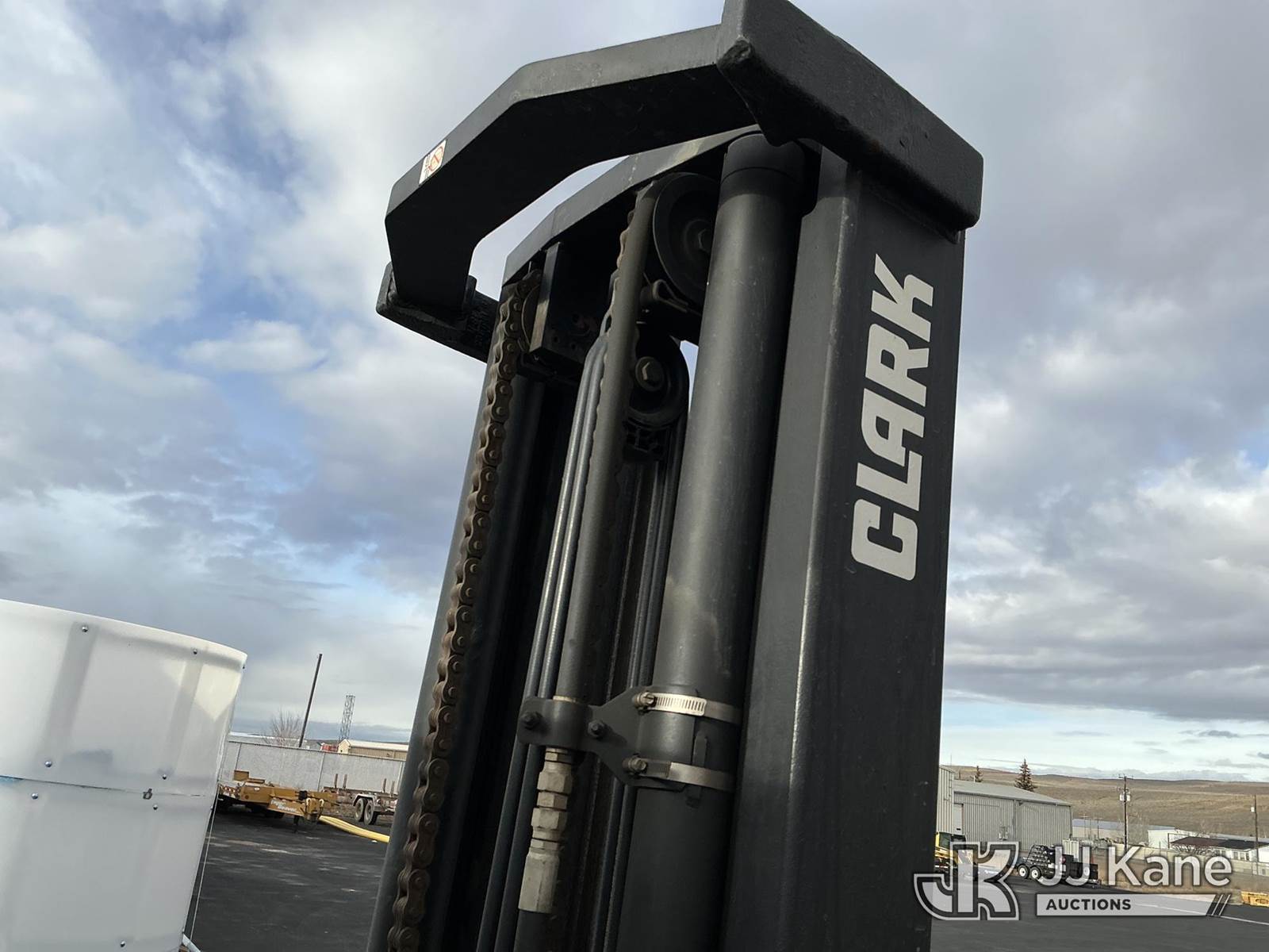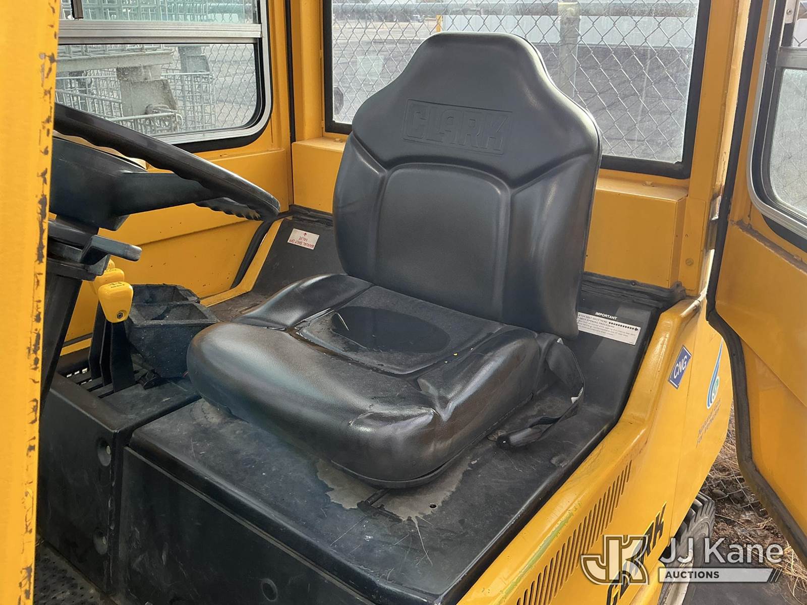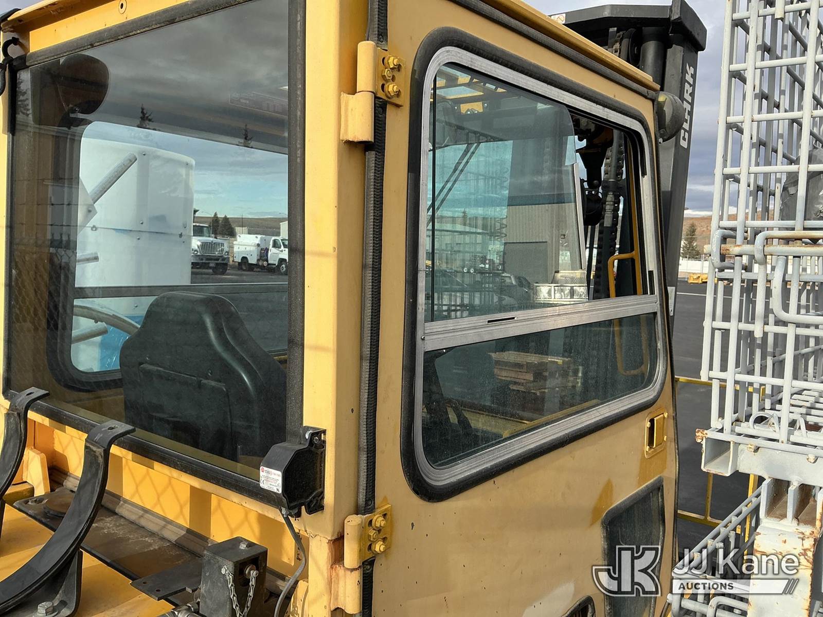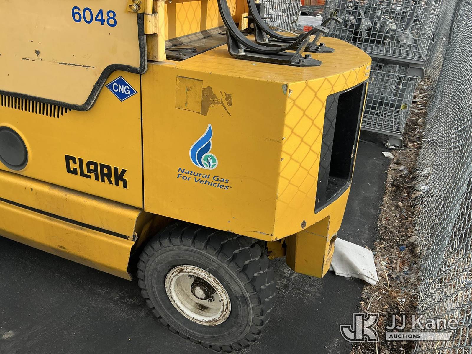 1992 Clark GPX30 Pneumatic Tired Forklift, s/n GPX23001558735KOF, Hydrostatic, CNG Only, with 3,675 lb. capacity, 226 in. 3 stage mast height, EROPS, (Not Running, Condition Unknown) (Does Not Start, No CNG Tank, Seller States: Runs with CNG Tank) (Reads 725 hours) NOTE: This unit is being sold AS IS/WHERE IS via Timed Auction and is located in Evanston, WY. (Buyer is responsible for removal. Assistance by consignor or JJ Kane Auctioneers is not assured.)
