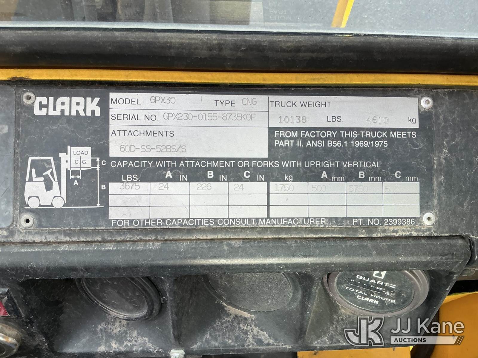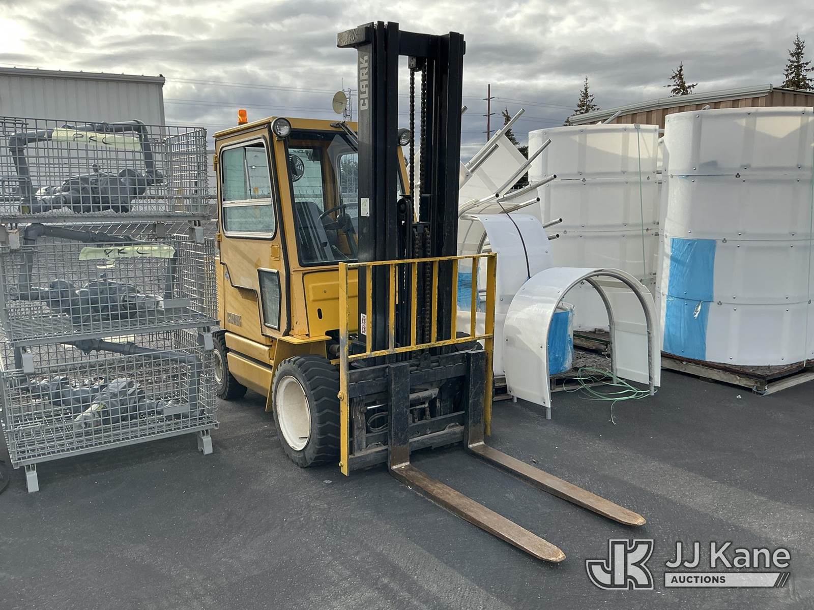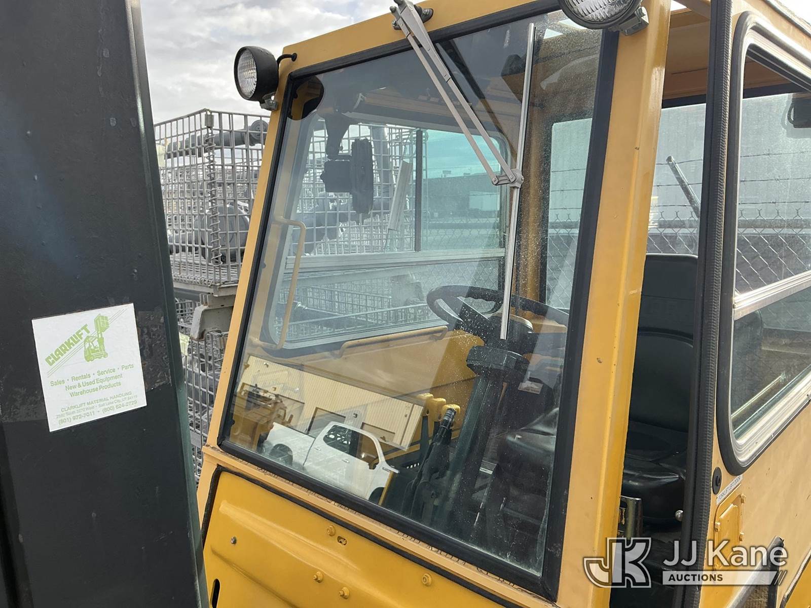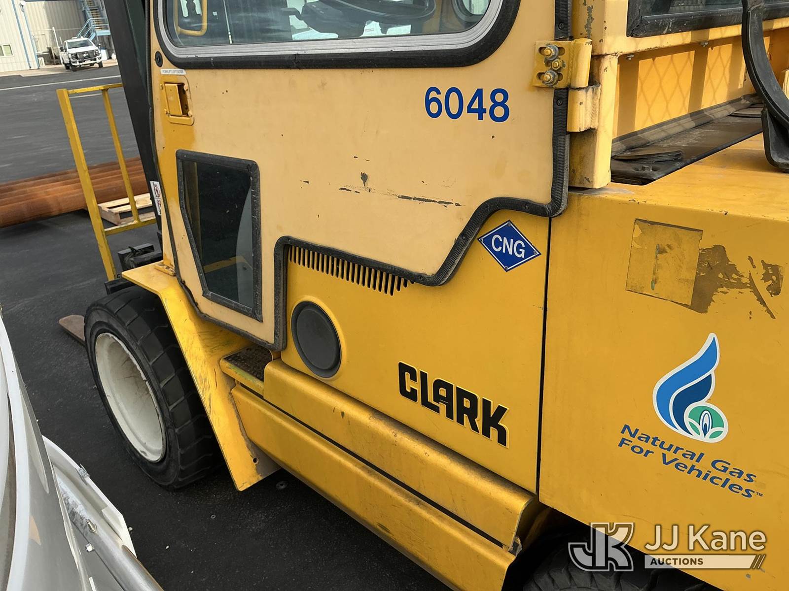 1992 Clark GPX30 Pneumatic Tired Forklift, s/n GPX23001558735KOF, Hydrostatic, CNG Only, with 3,675 lb. capacity, 226 in. 3 stage mast height, EROPS, (Not Running, Condition Unknown) (Does Not Start, No CNG Tank, Seller States: Runs with CNG Tank) (Reads 725 hours) NOTE: This unit is being sold AS IS/WHERE IS via Timed Auction and is located in Evanston, WY. (Buyer is responsible for removal. Assistance by consignor or JJ Kane Auctioneers is not assured.)